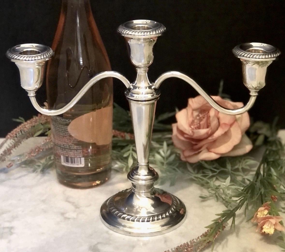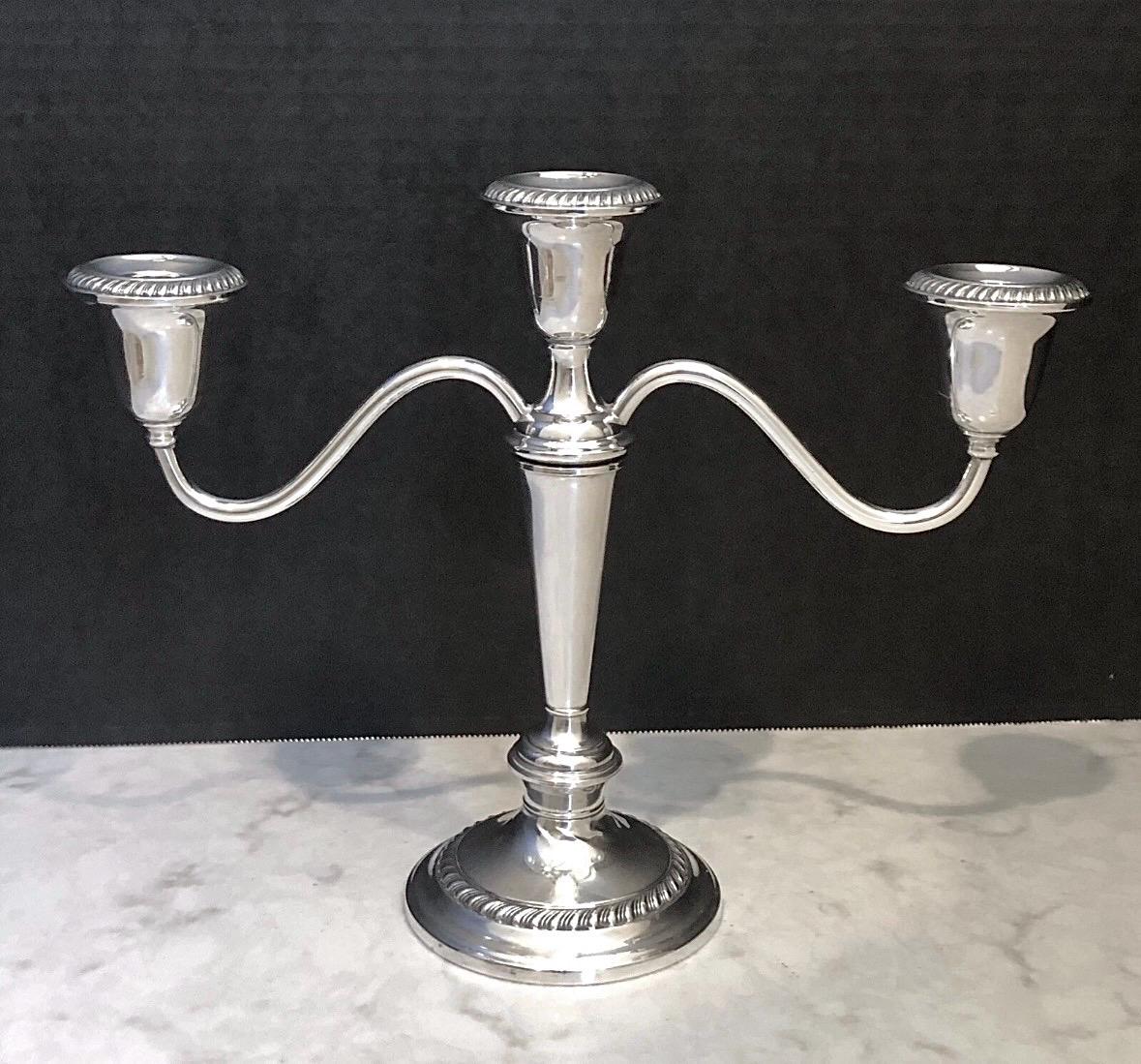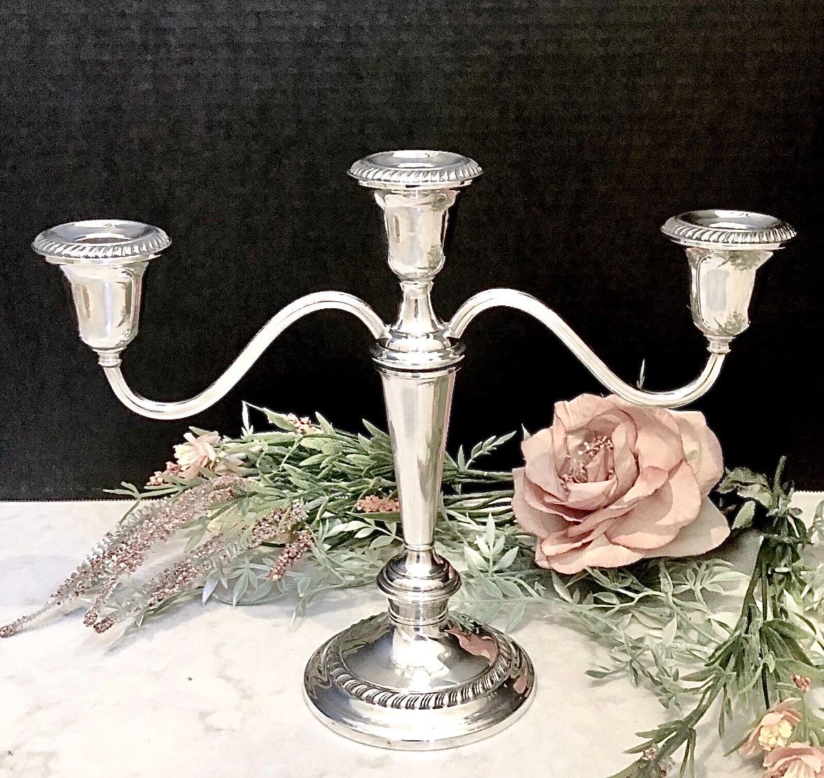 This is for a Vintage Sterling Silver Candelabras from Gorham Silver. The base is marked 808/1 and has the makers hallmarks and reinforced. With the arm used this will hold 3 tapers or can be used single for one taper. When the pieces are put together this measures: 9 inches tall x 11.5 inches wide x 4 inches deep.