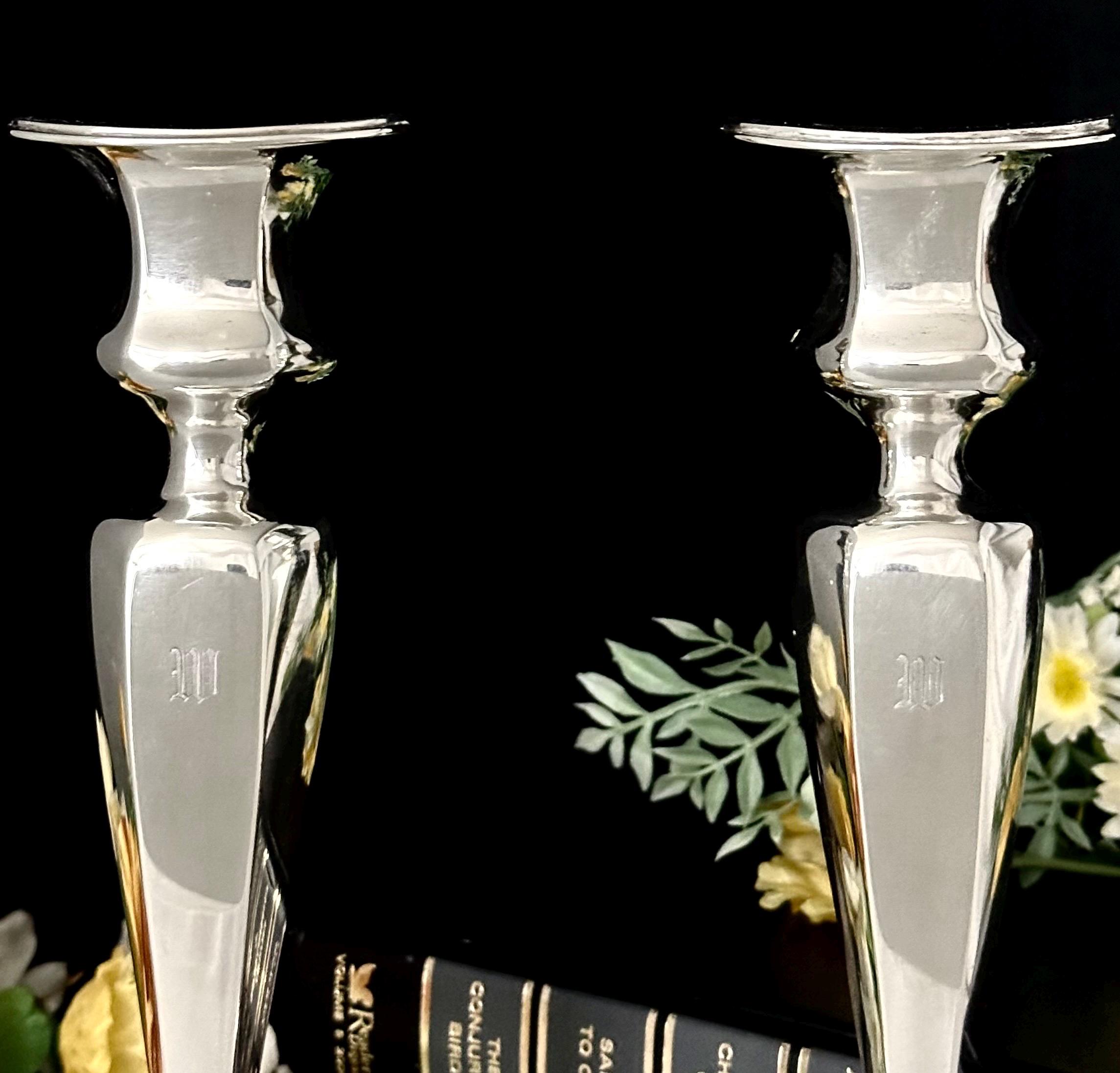 This is for an antique pair of Sterling Silver candle holders from Tiffany & Co. Each of the Sterling marked candlesticks measures: 9.25 inches tall x 4.5 inches wide x 3 5/8 inches deep. * Each one is monogramed on one side with a W.