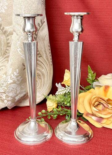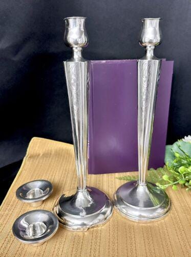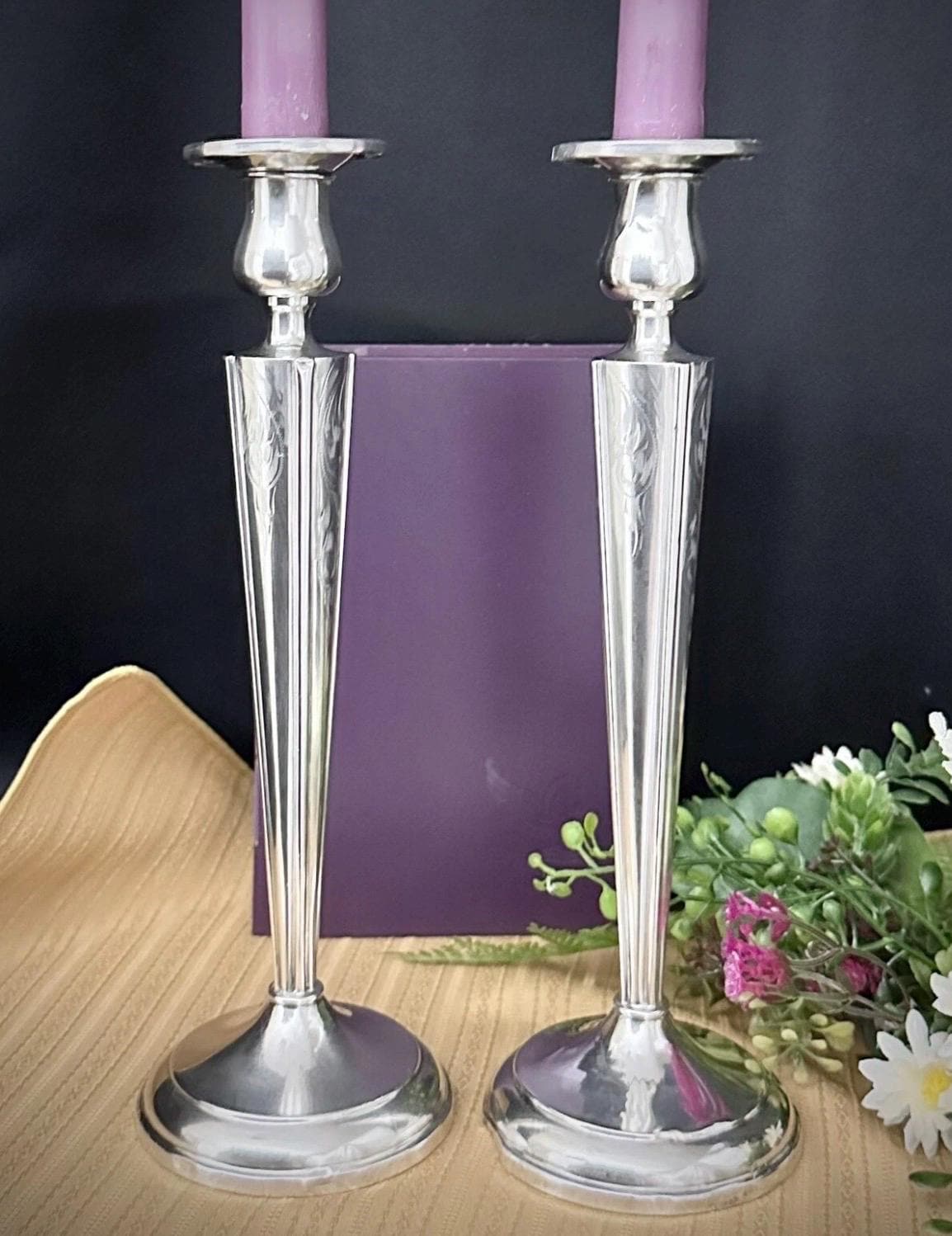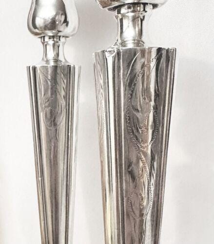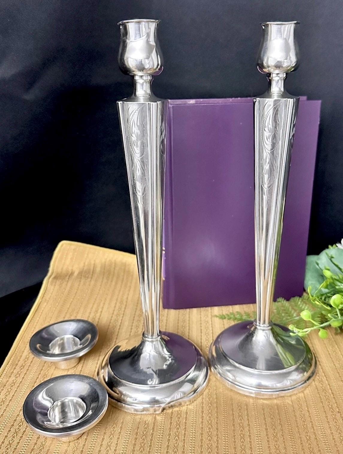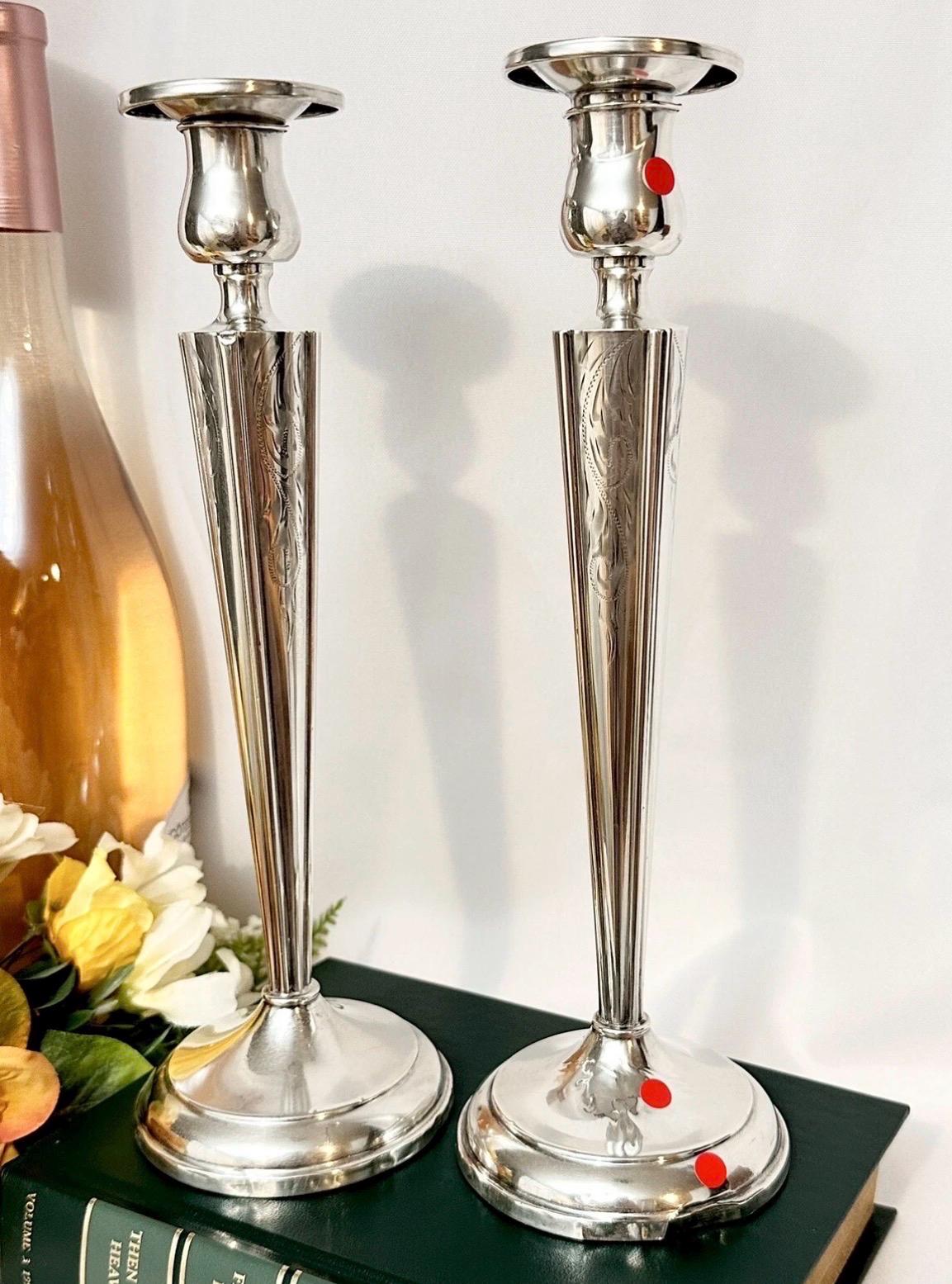 This is for a pair of Vintage Single Tall Candle holders. These are Sterling Silver and etched with a floral pattern and have removable sterling candle insert cups. These do show use esp on the base of one of them.