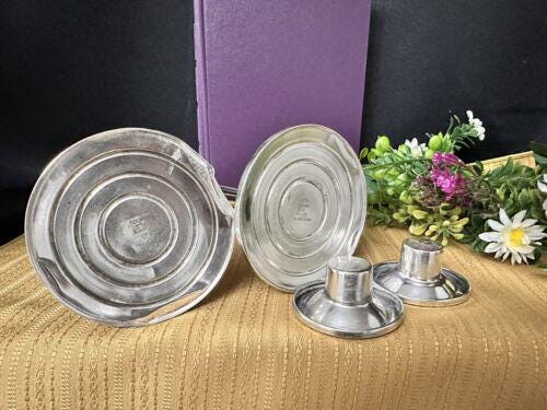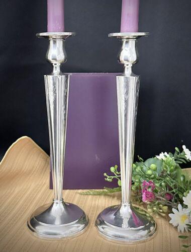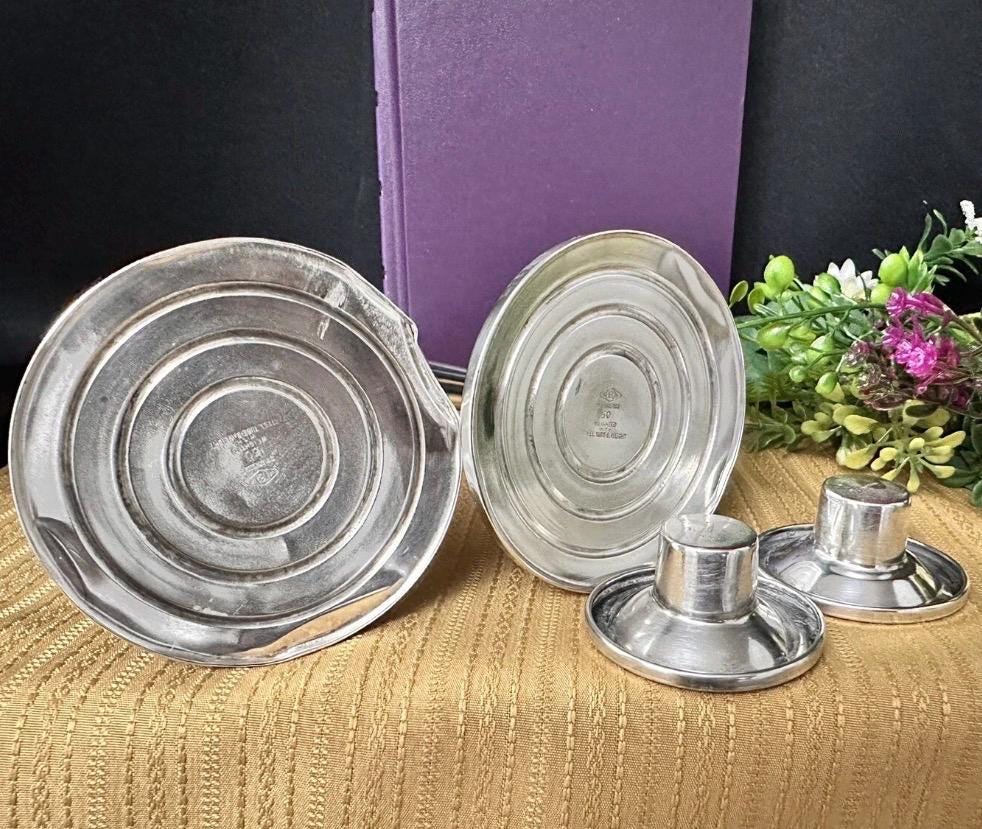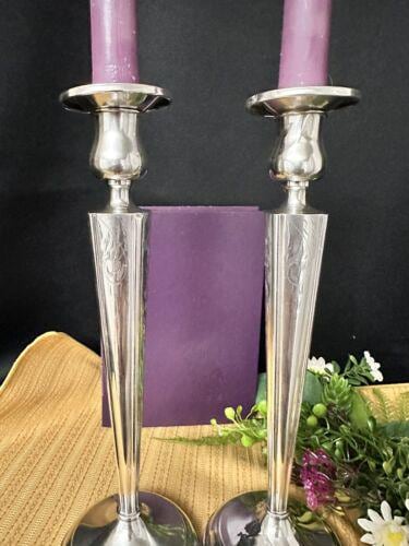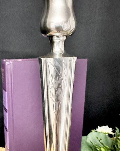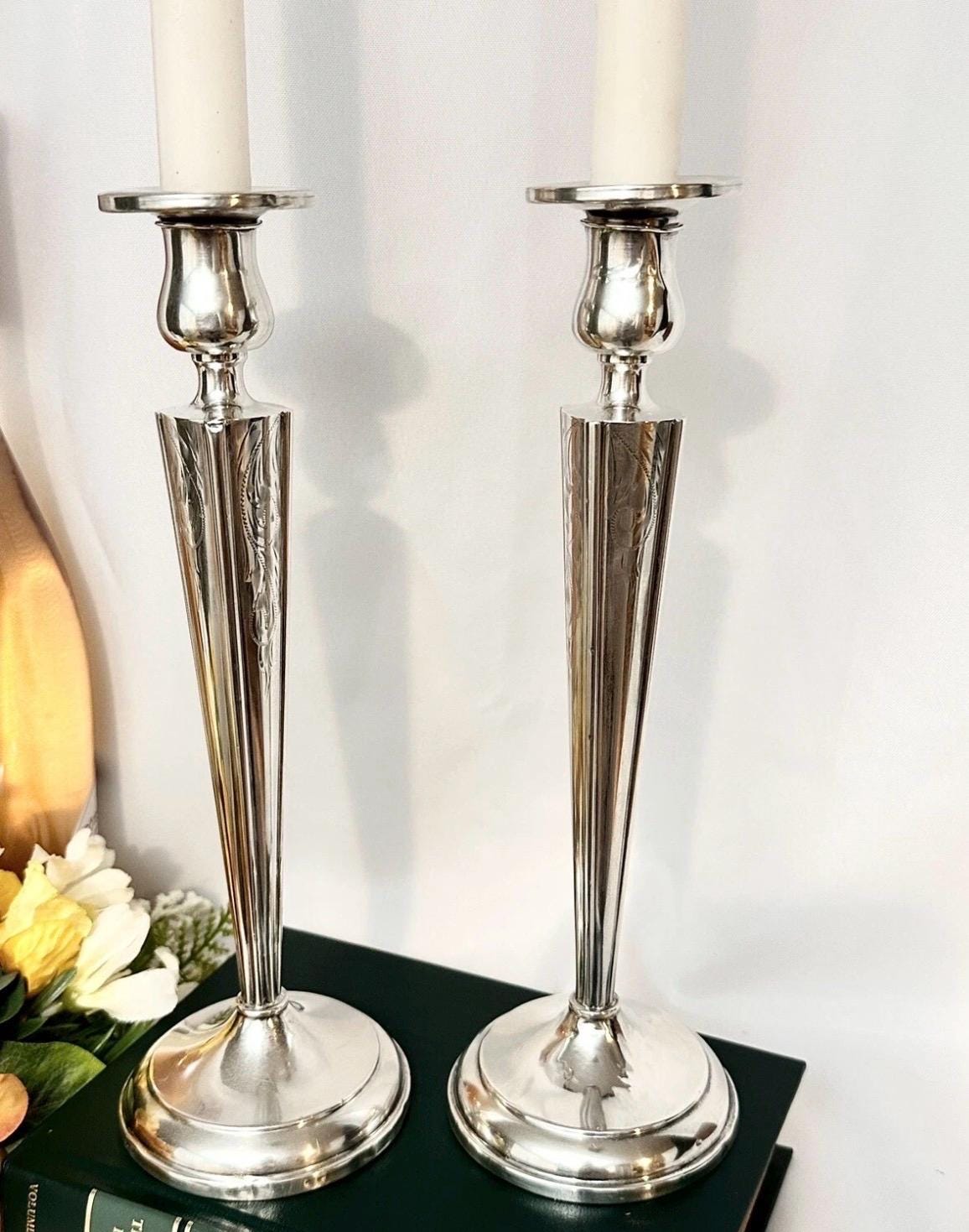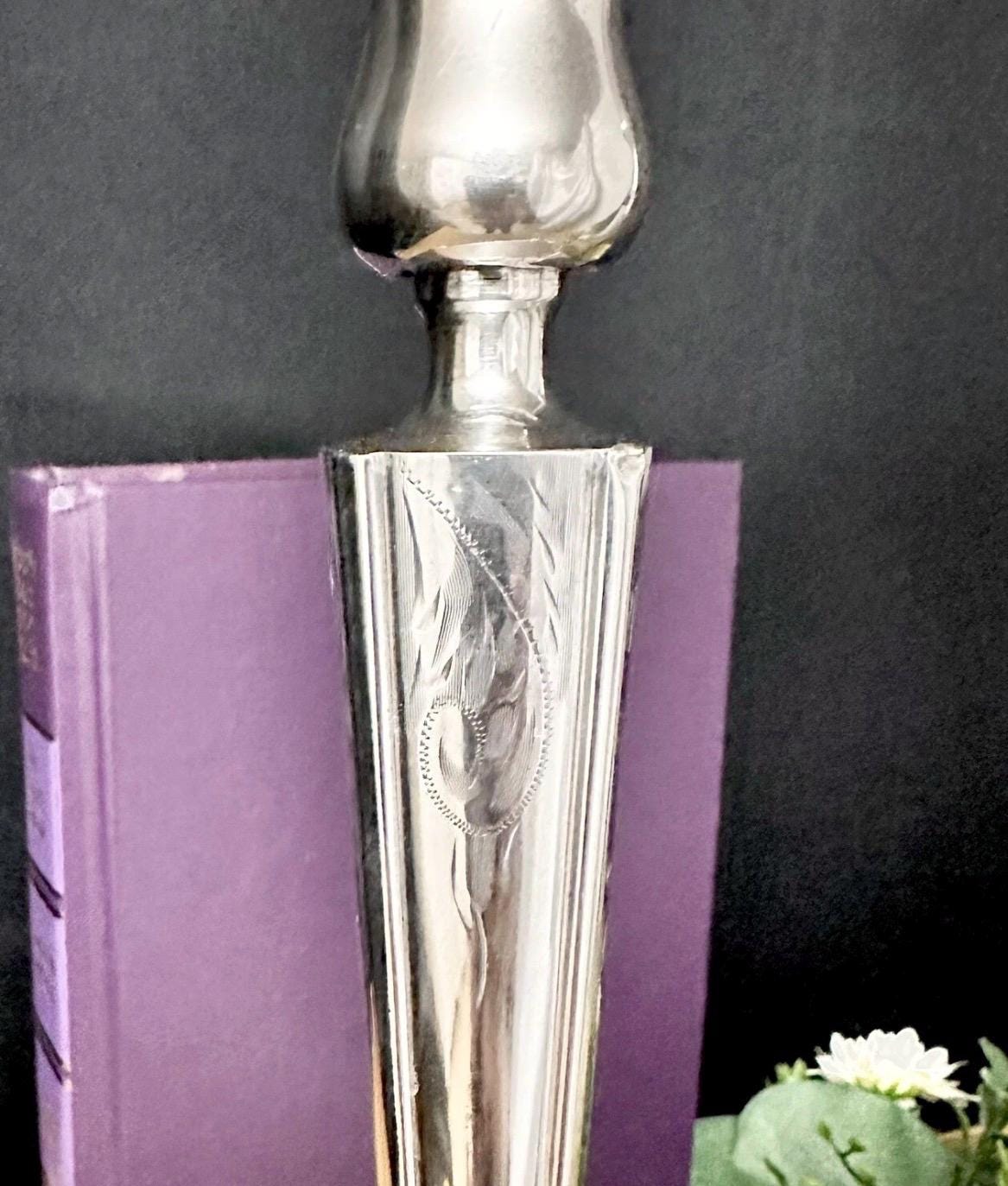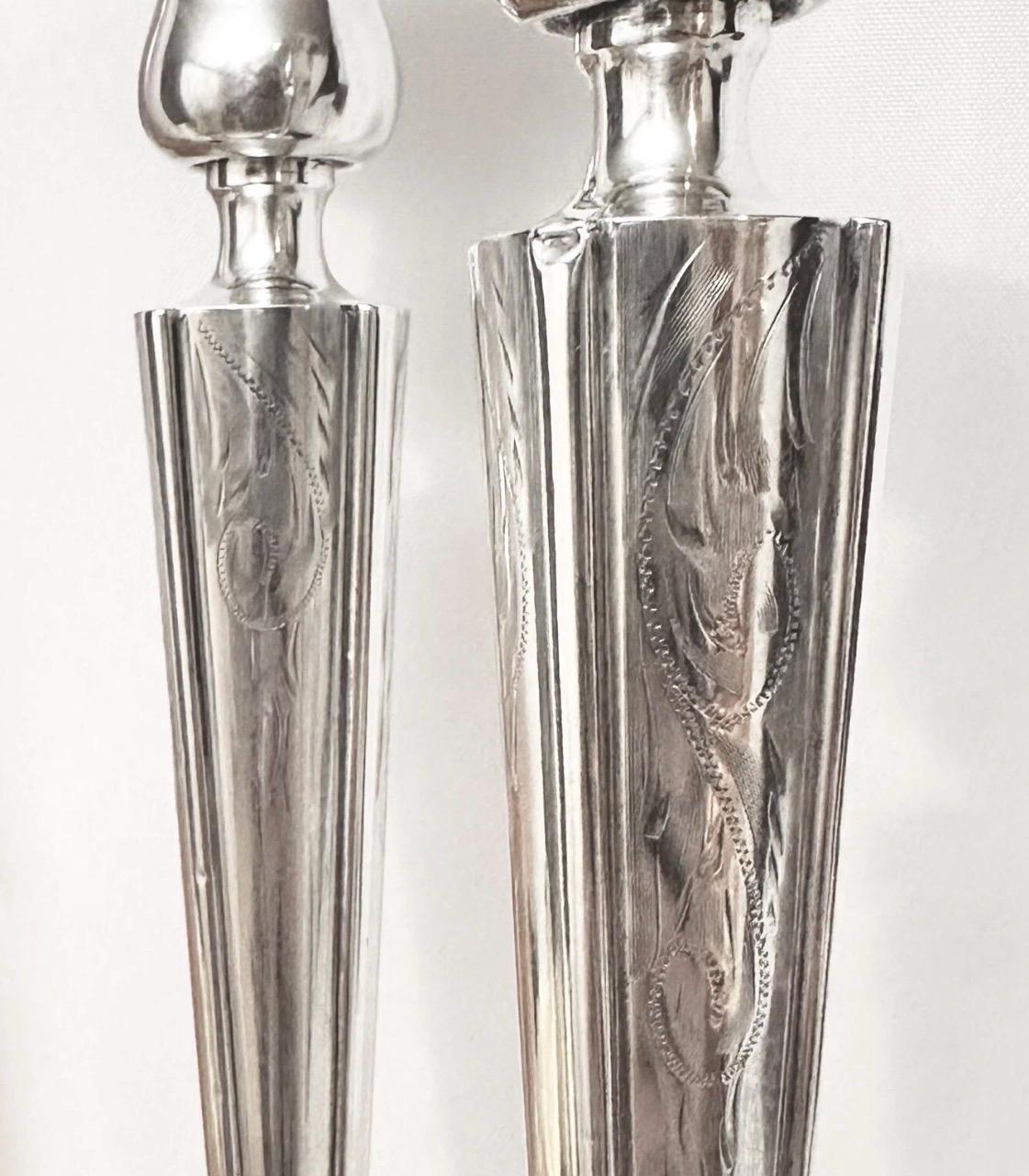 This is for a pair of Vintage Single Tall Candle holders. These are Sterling Silver and etched with a floral pattern and have removable sterling candle insert cups. These do show use esp on the base of one of them.