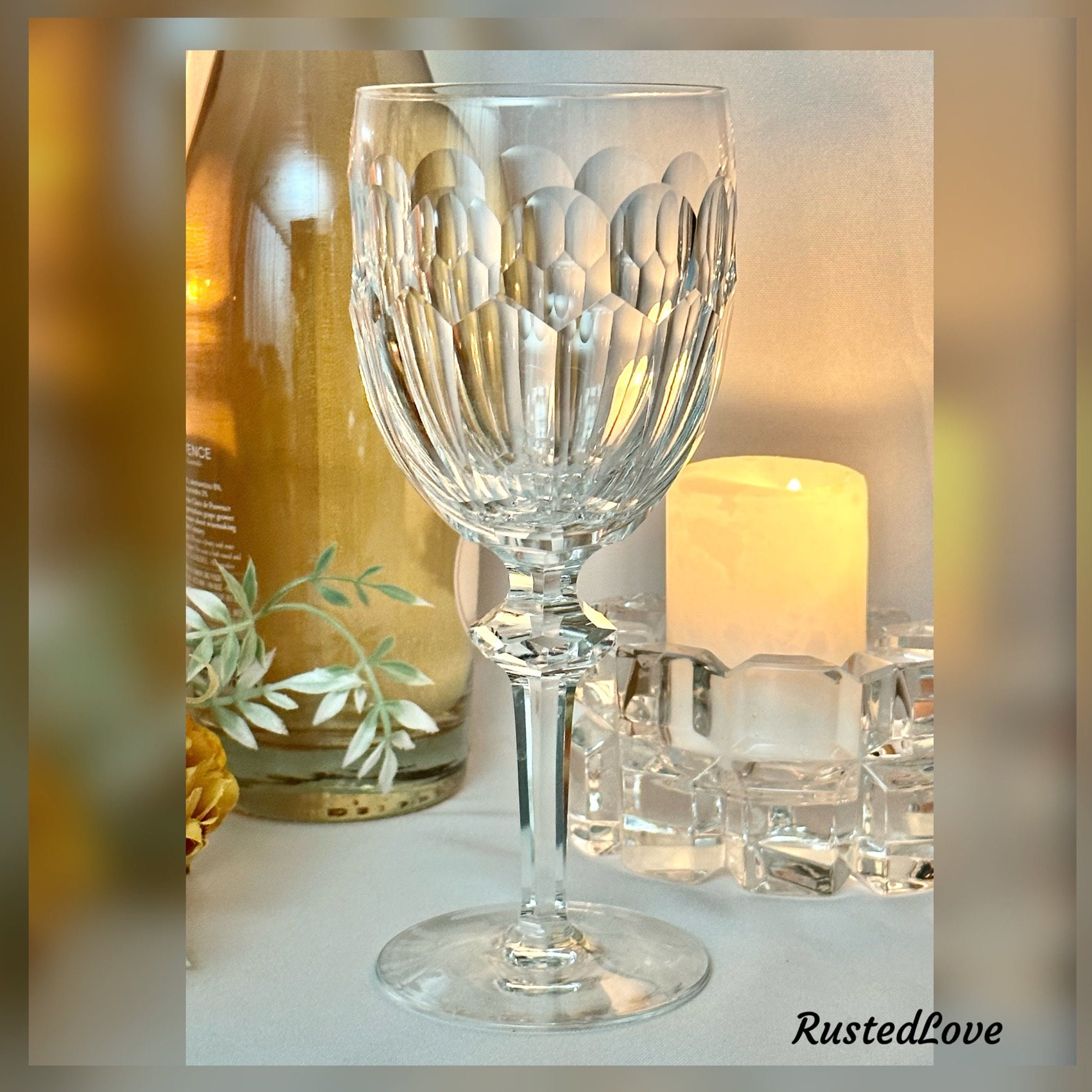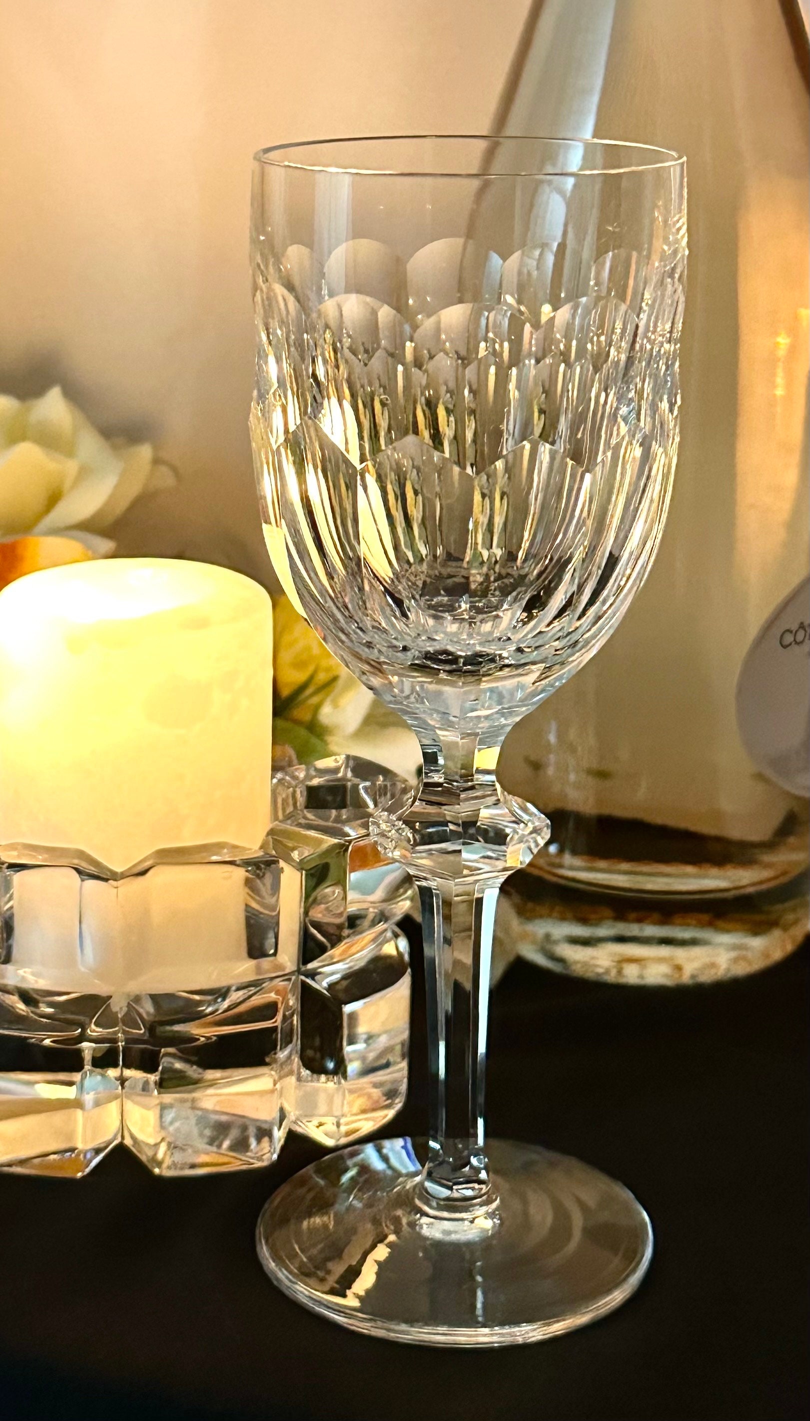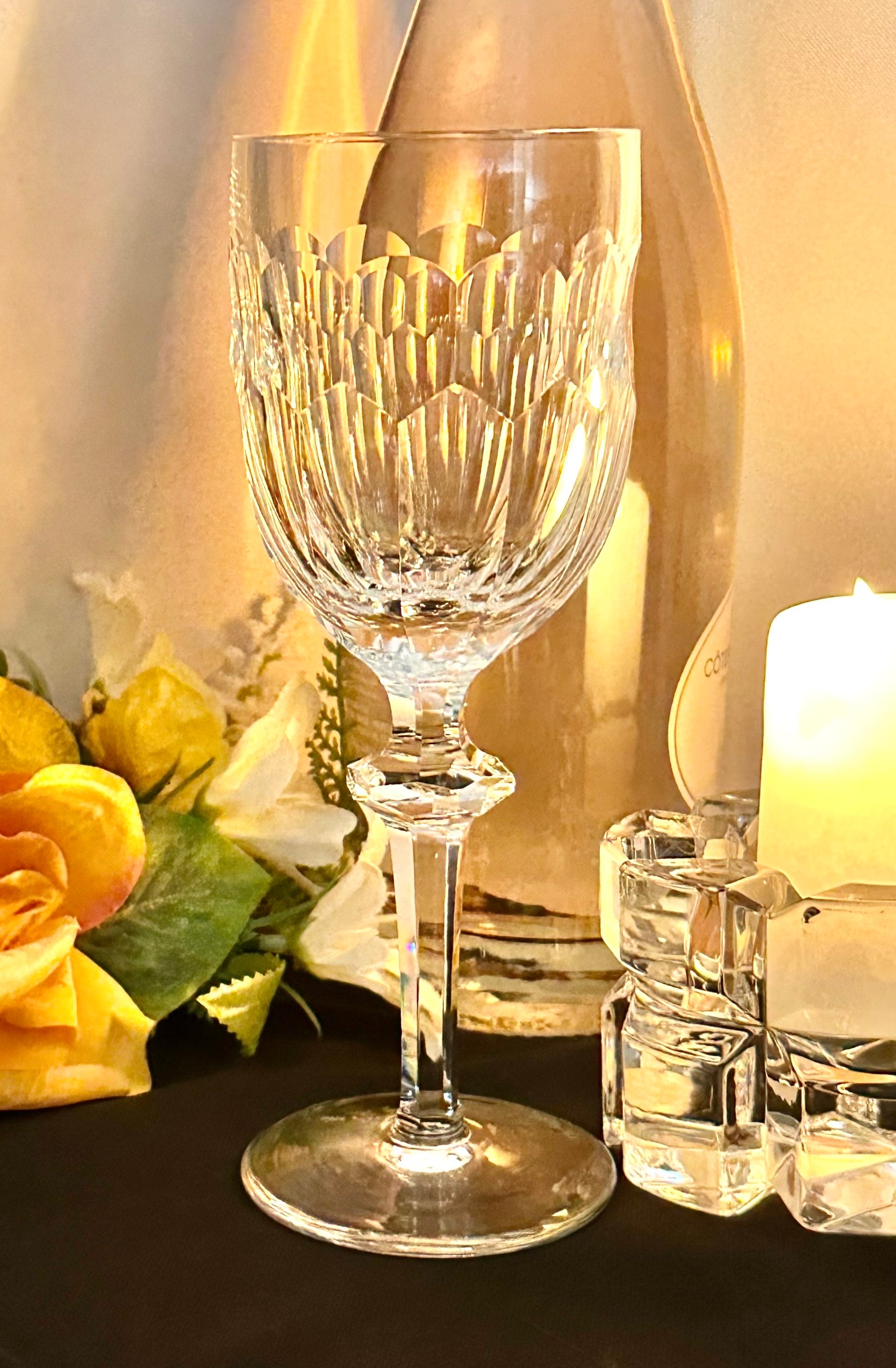 The bowl on the glass is cut panels while the foot is undecorated. This lovely goblet was produced from 1971 - 2017 and are now discontinued.