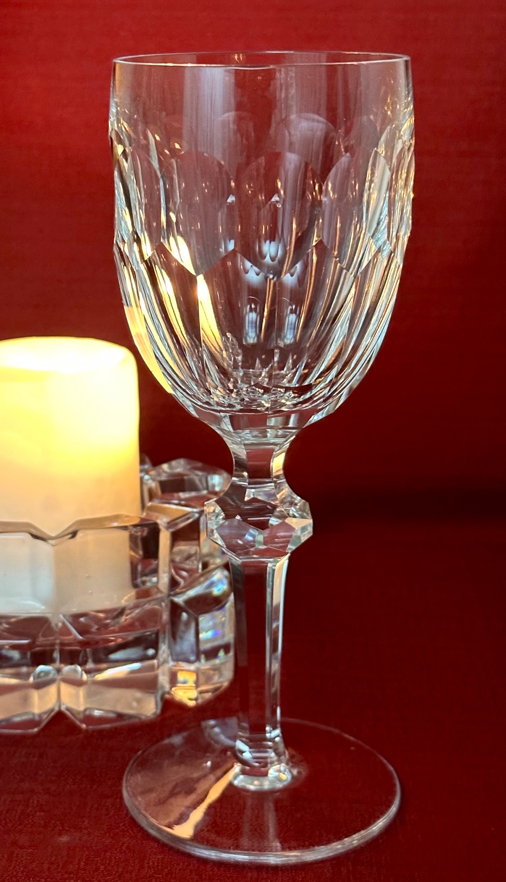 This is for 1 lovely Vintage Glass From Wateford Crystal in the Curraghmore pattern (Cut). This is in the Claret Wine size measuring: 7 1/8 inches tall x 2 5/8 inches in diameter. This has a knob in the stem (not a ball shape). The claret wine glass is Blown glass crafted in Ireland. This is in pristine condition and appear to have been stored over the years and unused!