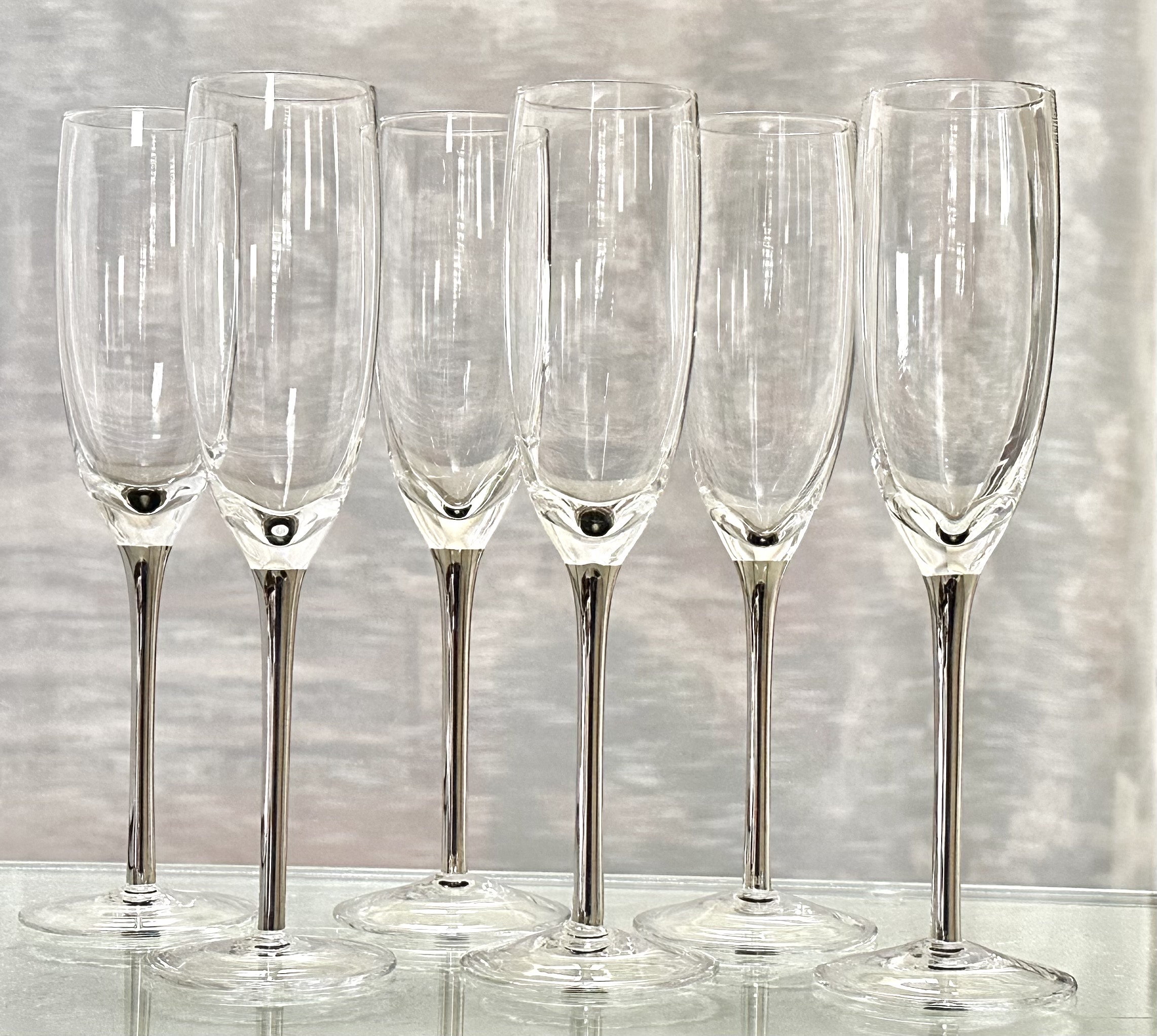 This is for a Vintage set of 6 Champagne Flutes. These are from an unknown maker. These have a platinum stem with a clear bowl and clear foot.