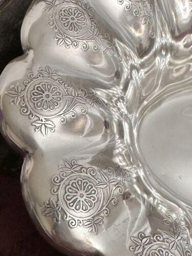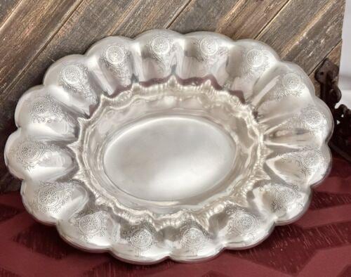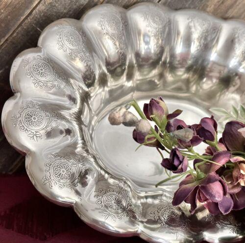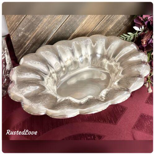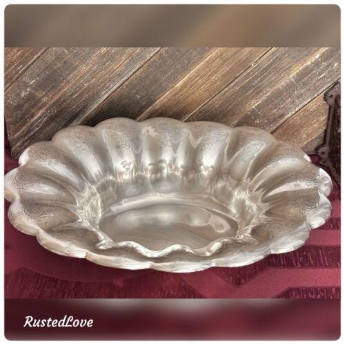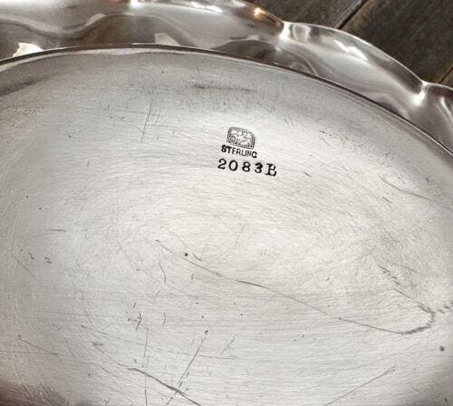 This is for a lovely Sterling Silver Bowl. The bowl is marked on the base with pattern 2082B, Sterling and a hallmark with a W and perhaps a Lion. The bowl weighs 391.8 grams. The vintage silver bowl measures: 2.5 inches tall x 11.5 inches wide x 9.75 inches deep. The rim is ruffled and etched with a delicate Art Deco styled design of swirls, leaves and is on the raised parts of the rim.