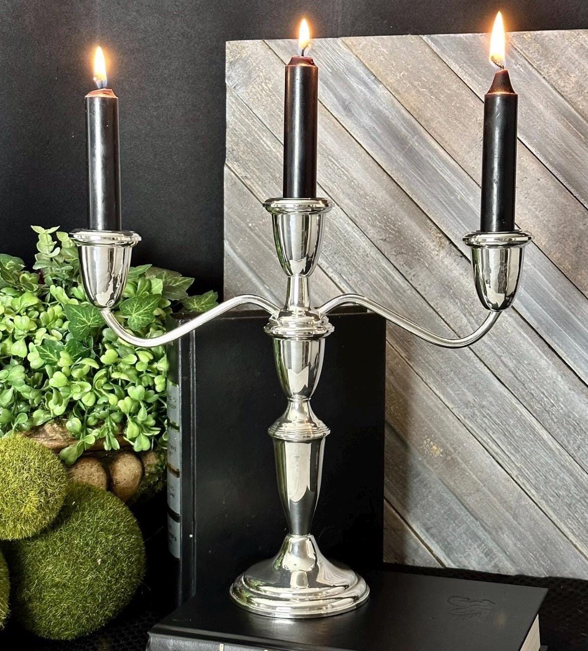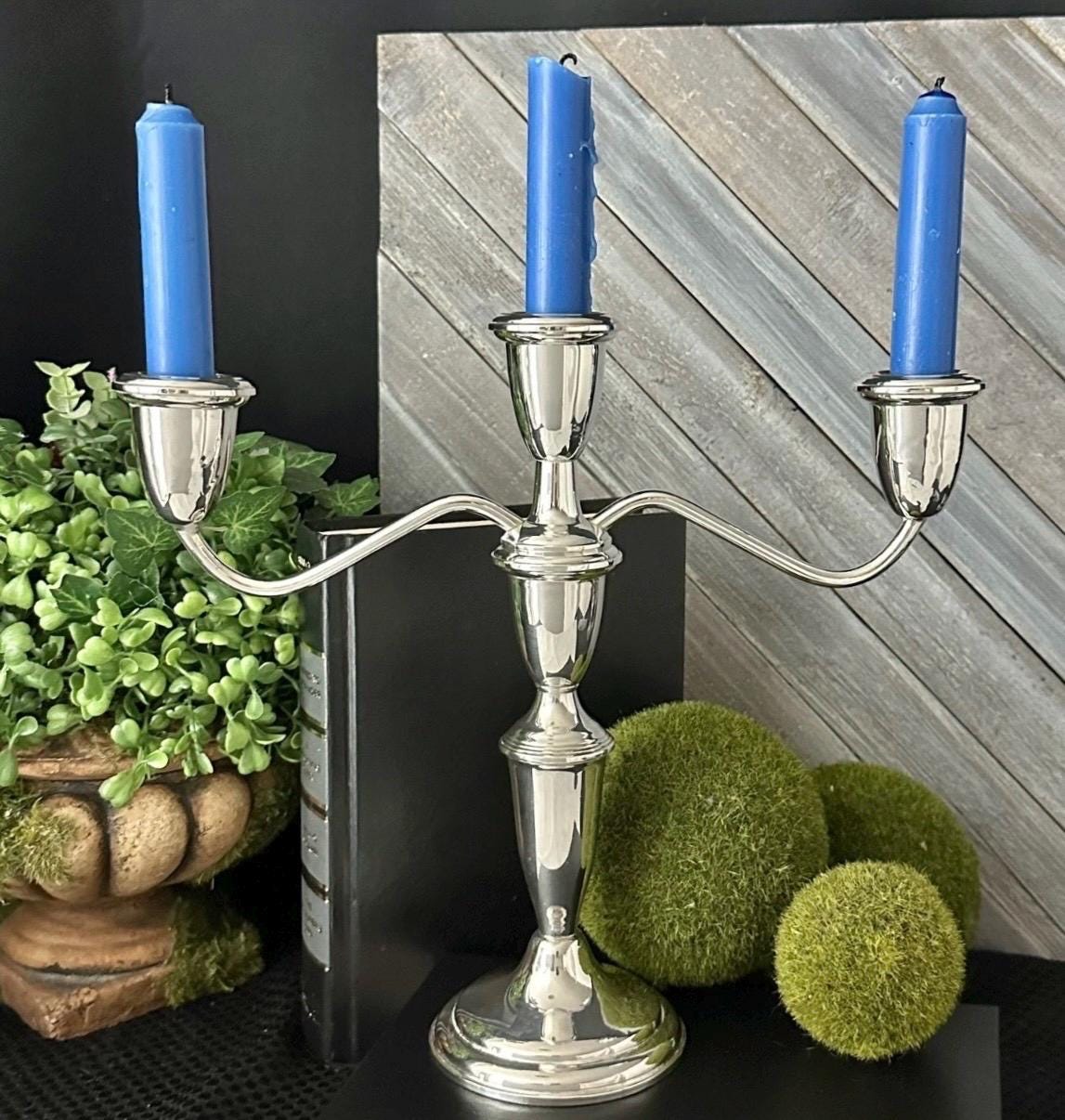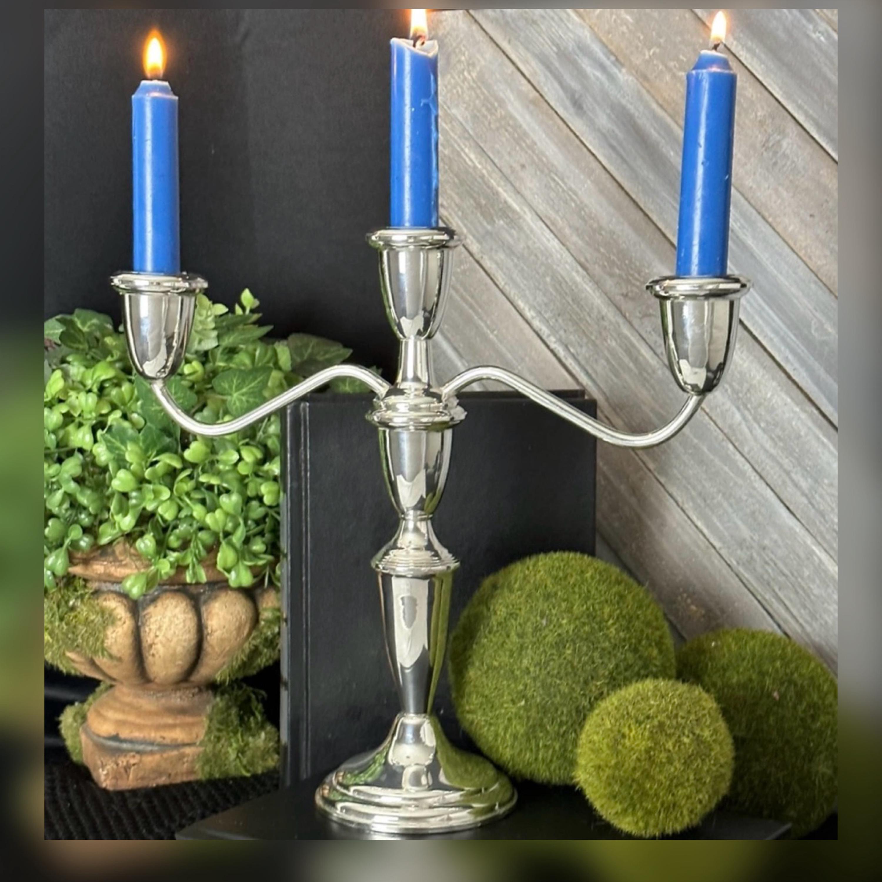 This for a Sterling Silver vintage Empire Silver 3 Arm Candelabra, and holds 3 dinner / taper candles. This is marked with pattern number #620 and are weighted and reinforced.