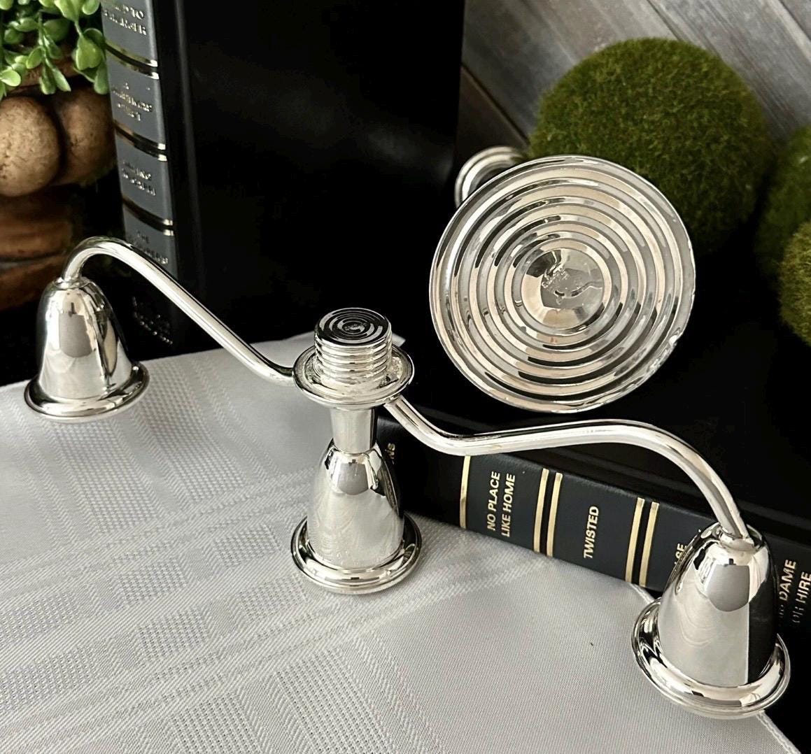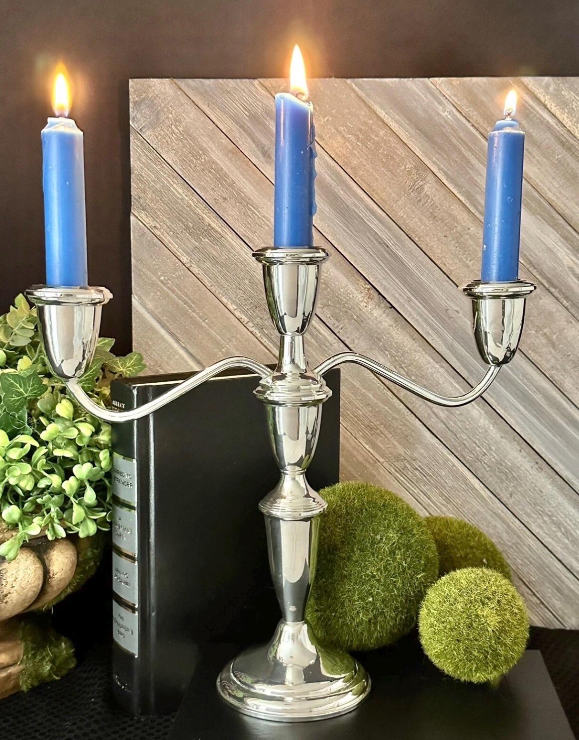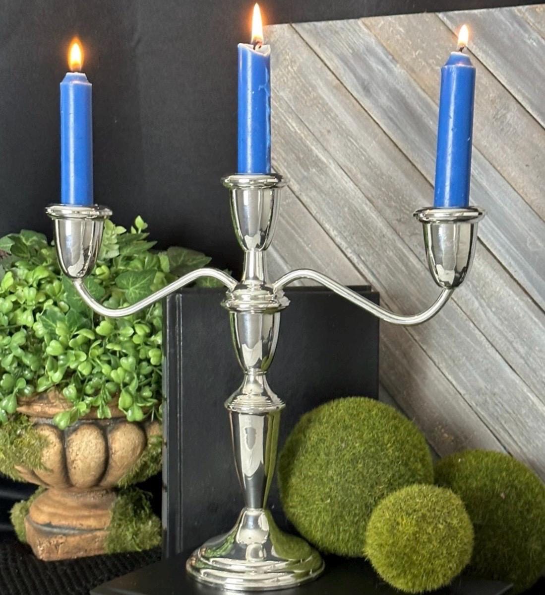 This for a Sterling Silver vintage Empire Silver 3 Arm Candelabra, and holds 3 dinner / taper candles. This is marked with pattern number #620 and are weighted and reinforced.