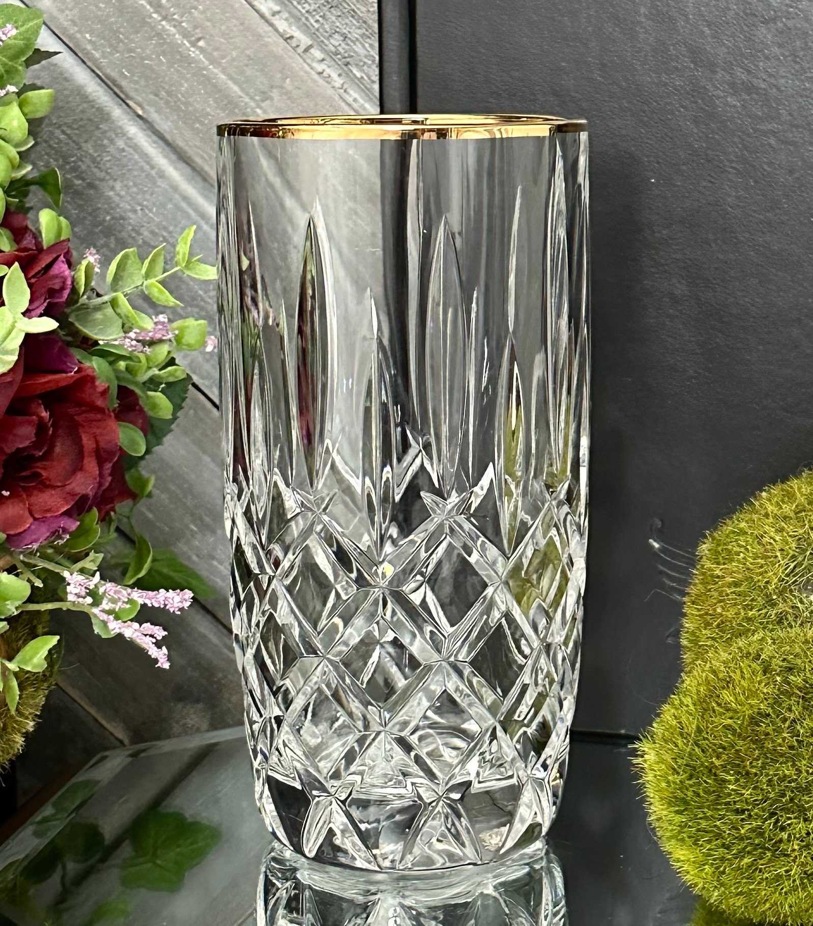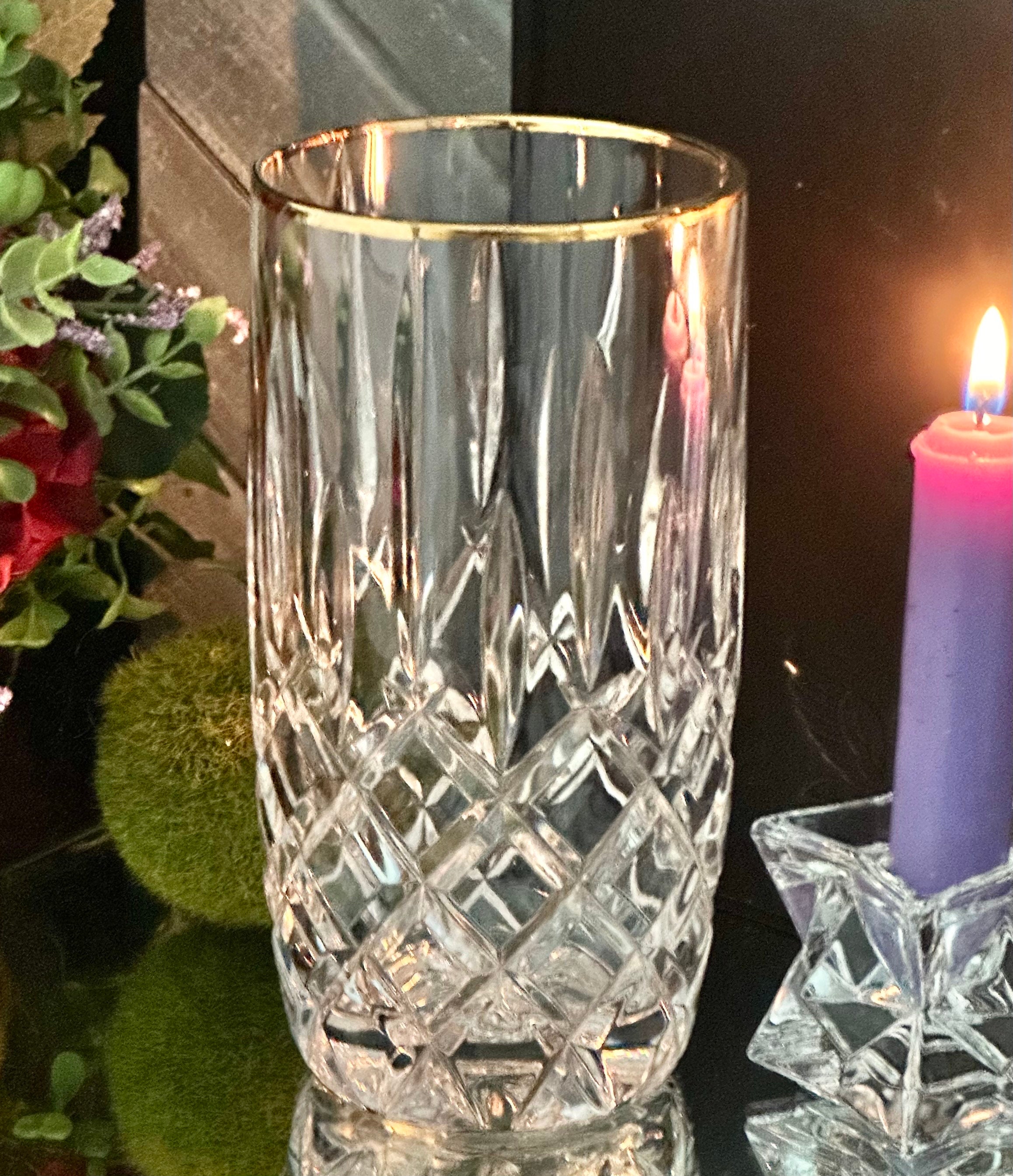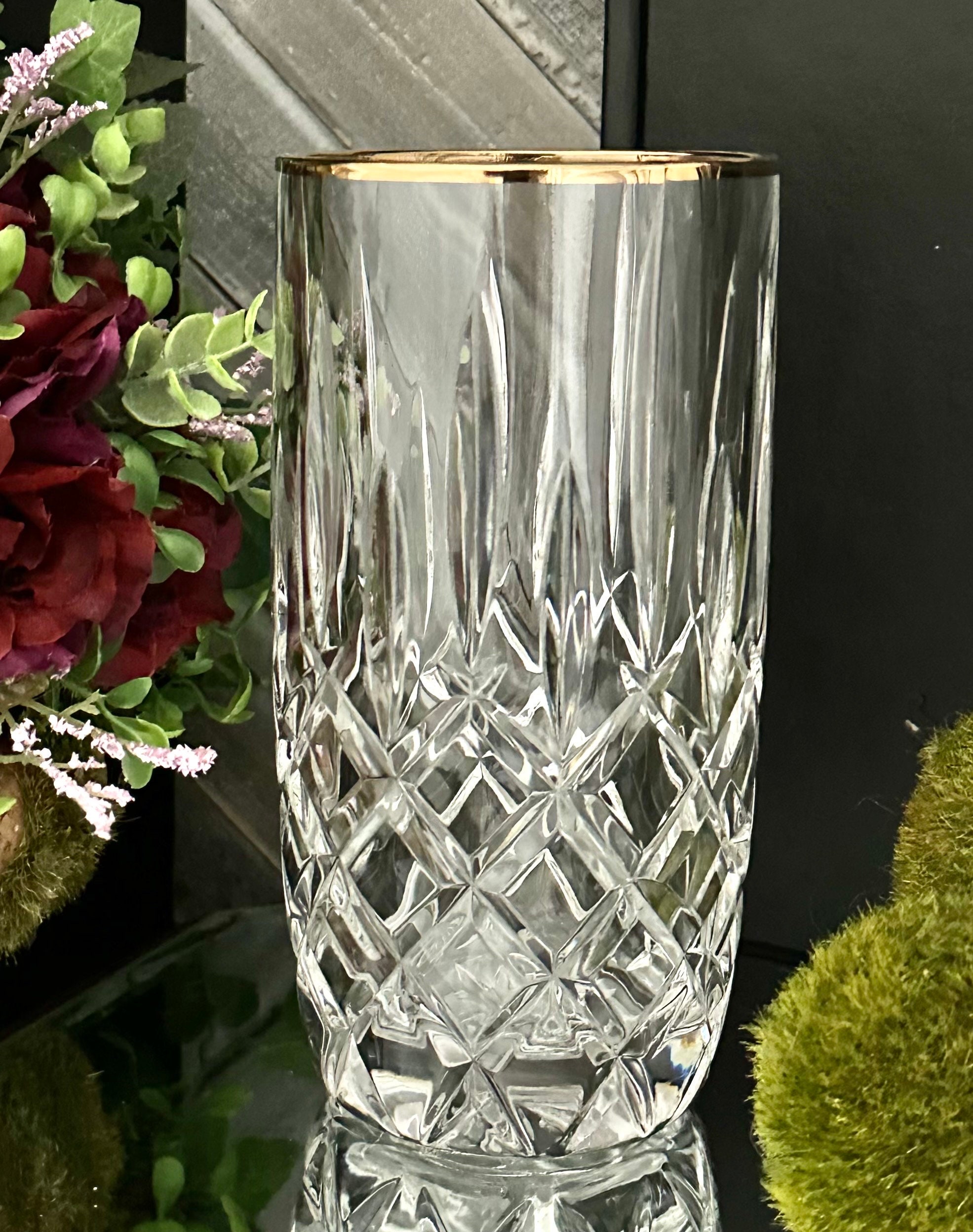 This is for one vintage Gorham Lady Anne Gold Highball glass. This glass has clear cuts with a gold trimmed rim. The highball glass measures 6 inches tall with a 3 inch diameter.