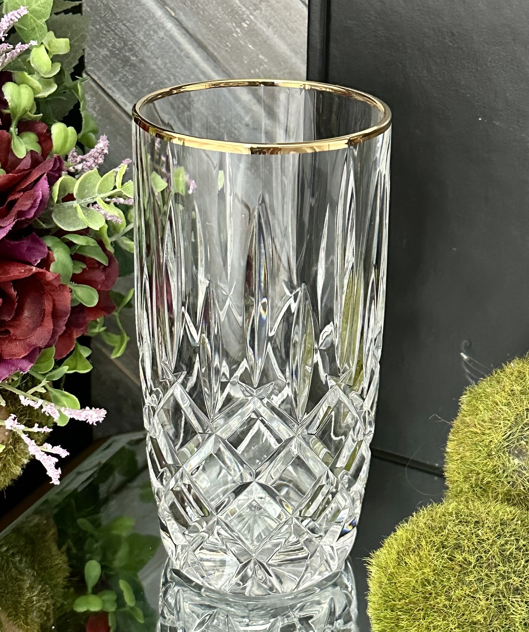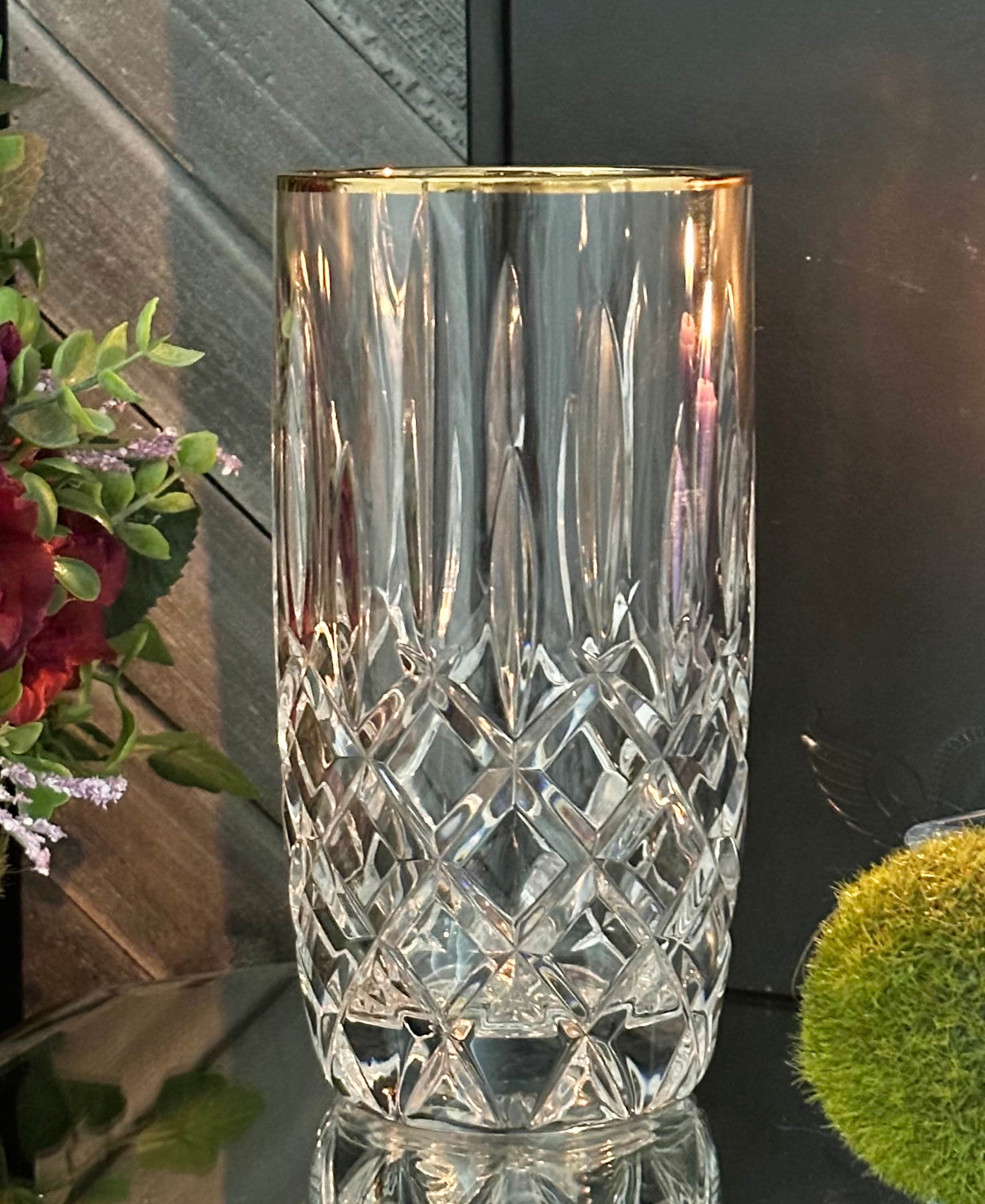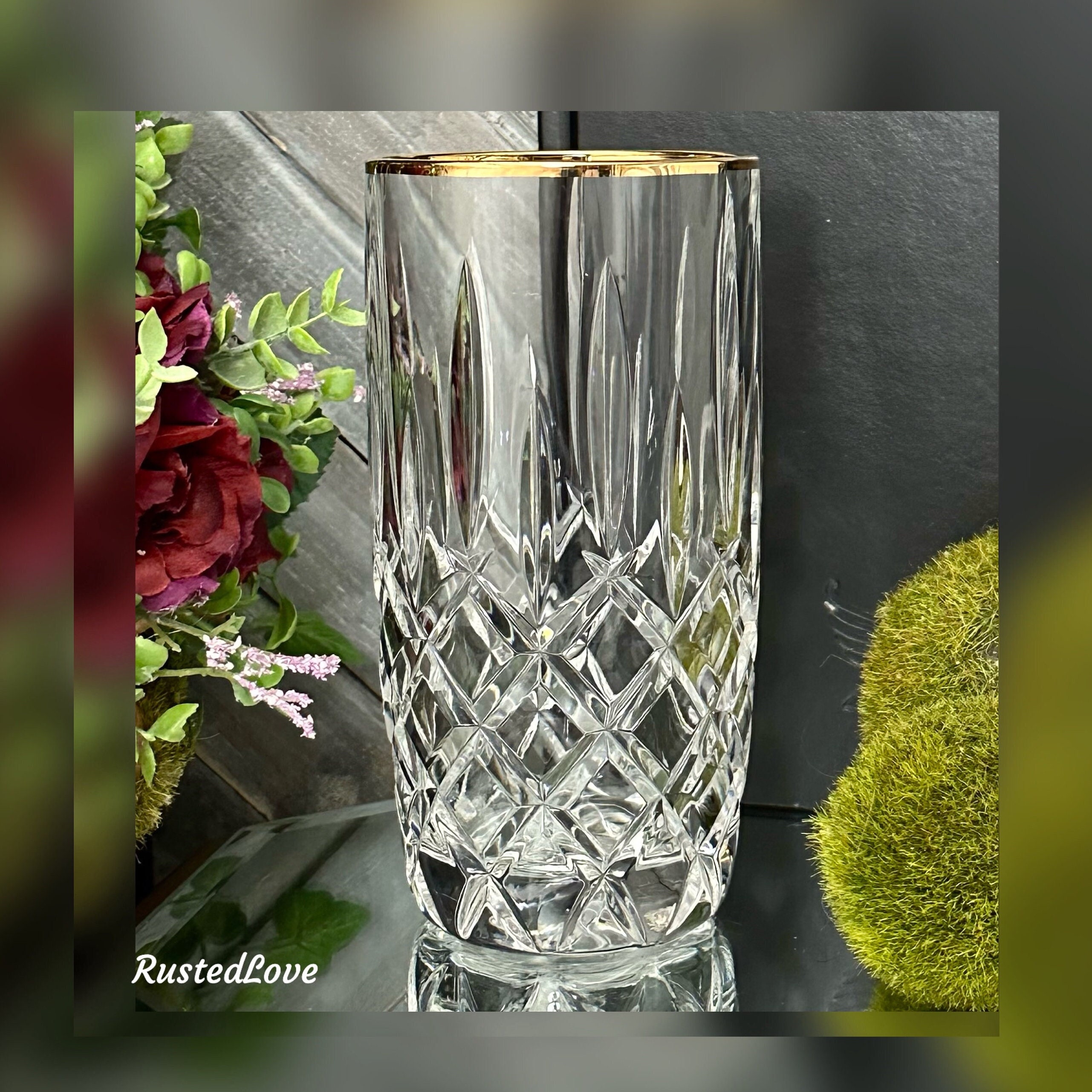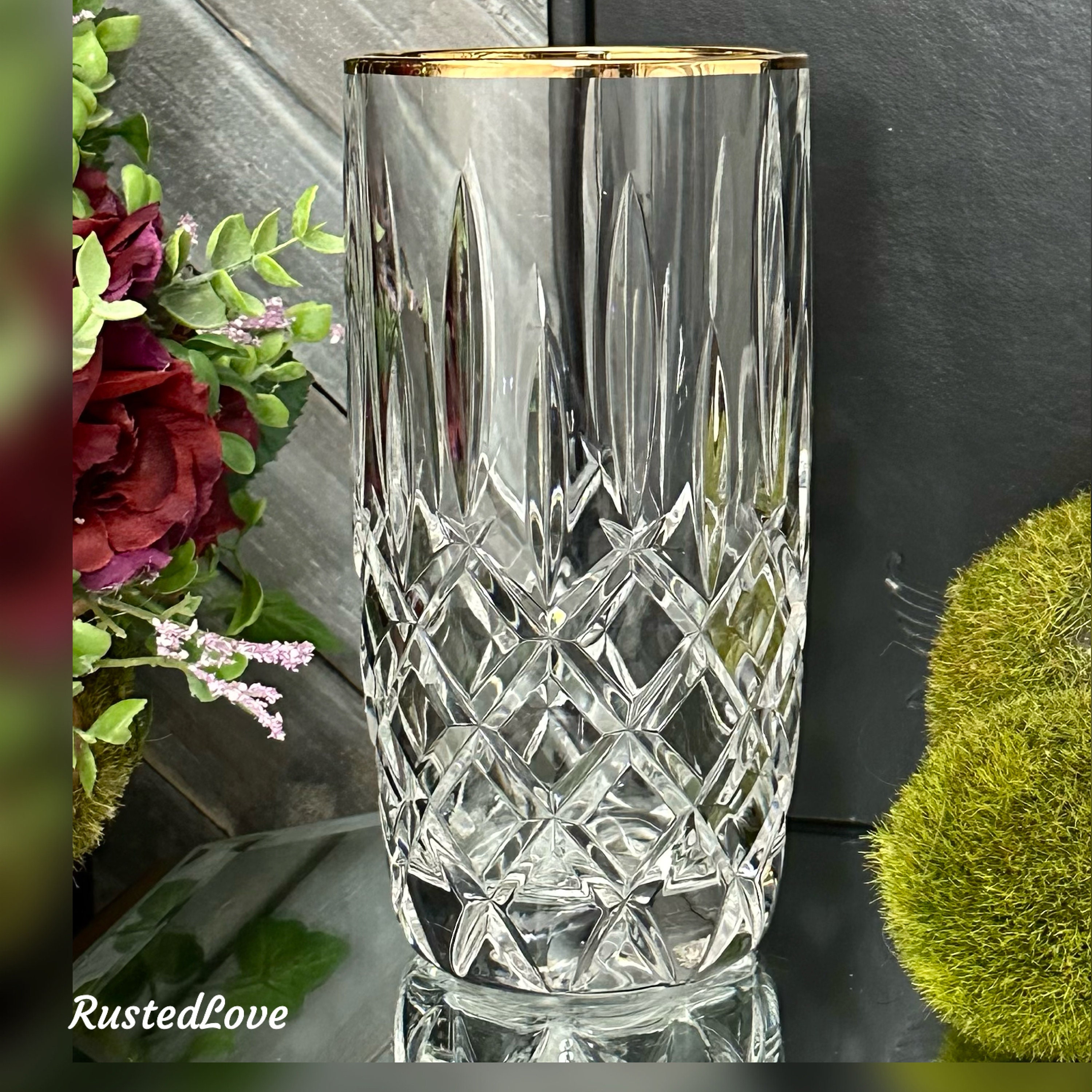 This is for one vintage Gorham Lady Anne Gold Highball glass. This glass has clear cuts with a gold trimmed rim. The highball glass measures 6 inches tall with a 3 inch diameter.