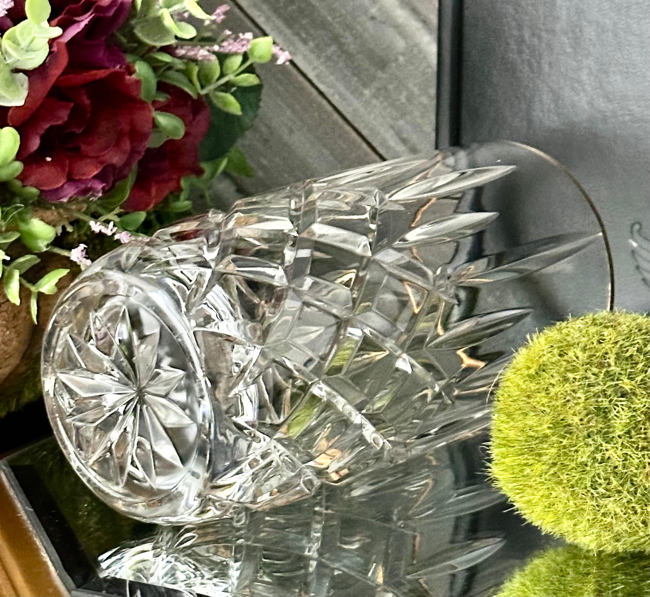 This line was produced from 1989 to 2007 and then discontinued. The highball glass is blown glass with deep criss-cross cuts on the sides along with vertical cuts and a star cut on the foot. This is a very beautiful pattern with how the light reflects thru the cuts and the thickness of the glass. This glass will make for a perfect replacement glass or to start a new set.