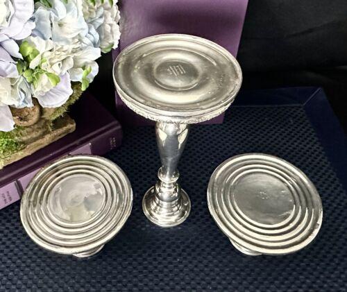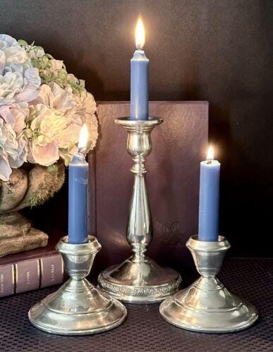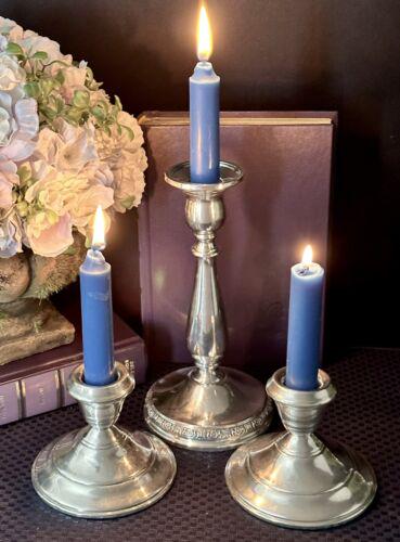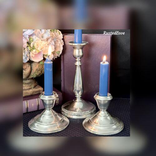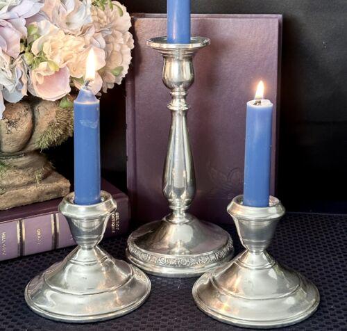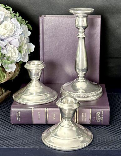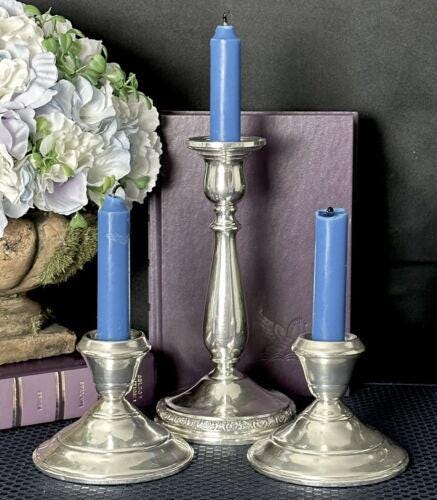 This is for a set of 3 nsole Sterling Silver CandleSticks. There are 2 different sizes and makers. These hold taper candles and are weighted and reinforced. They are marked sterling on the base. These weigh 36.2 total Oz