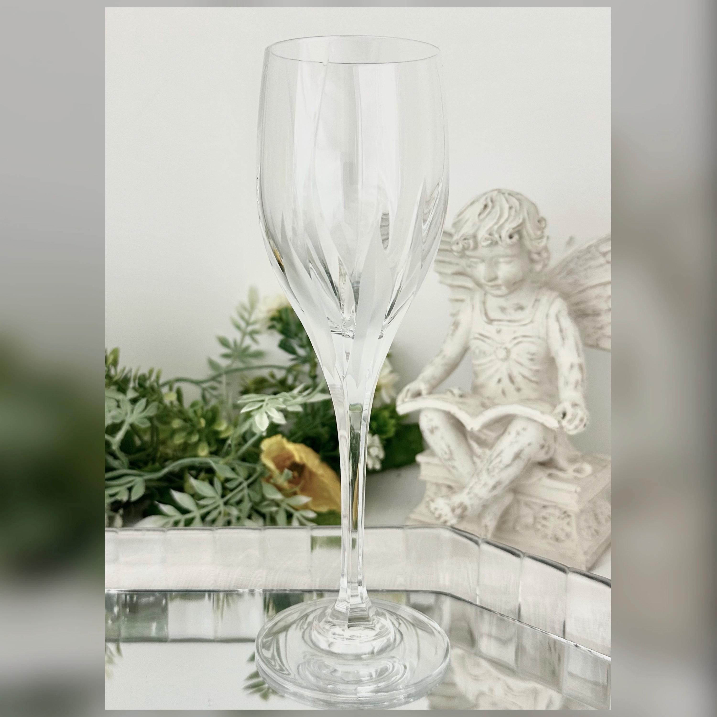 This is for 1 lovely Mikasa Flame D'Amore in the Wine Glass size. These measure: 8.25 inches tall and has a diameter of 2 1/4 inches. These hold 6 Oz of liquid. These beautiful pieces were first crafted in 1991 and is recently discontinued in 2020. These are blown glass from Slovenia. These have frosted swirls / leaf pattern and clear cuts on the bowl and a plain foot.