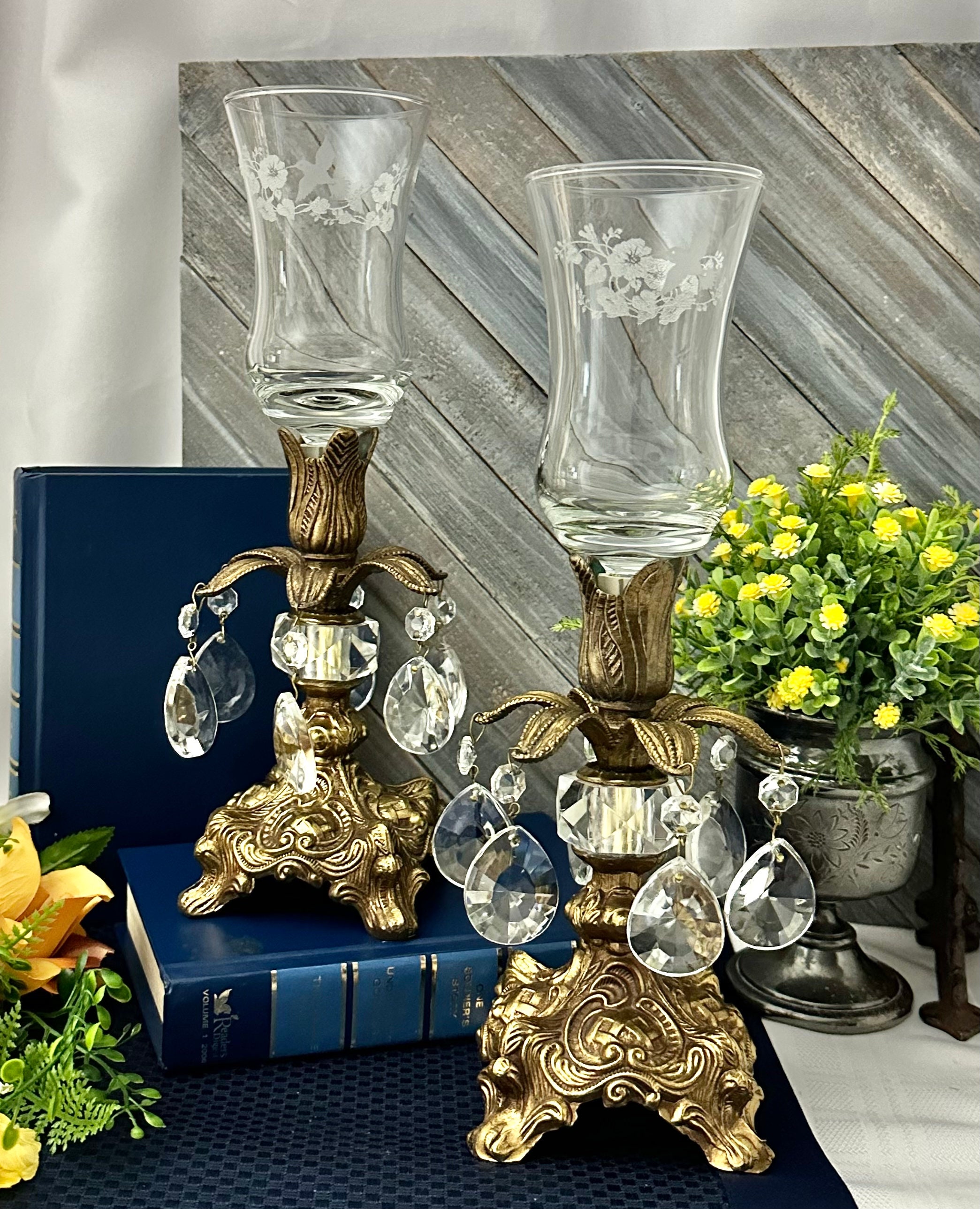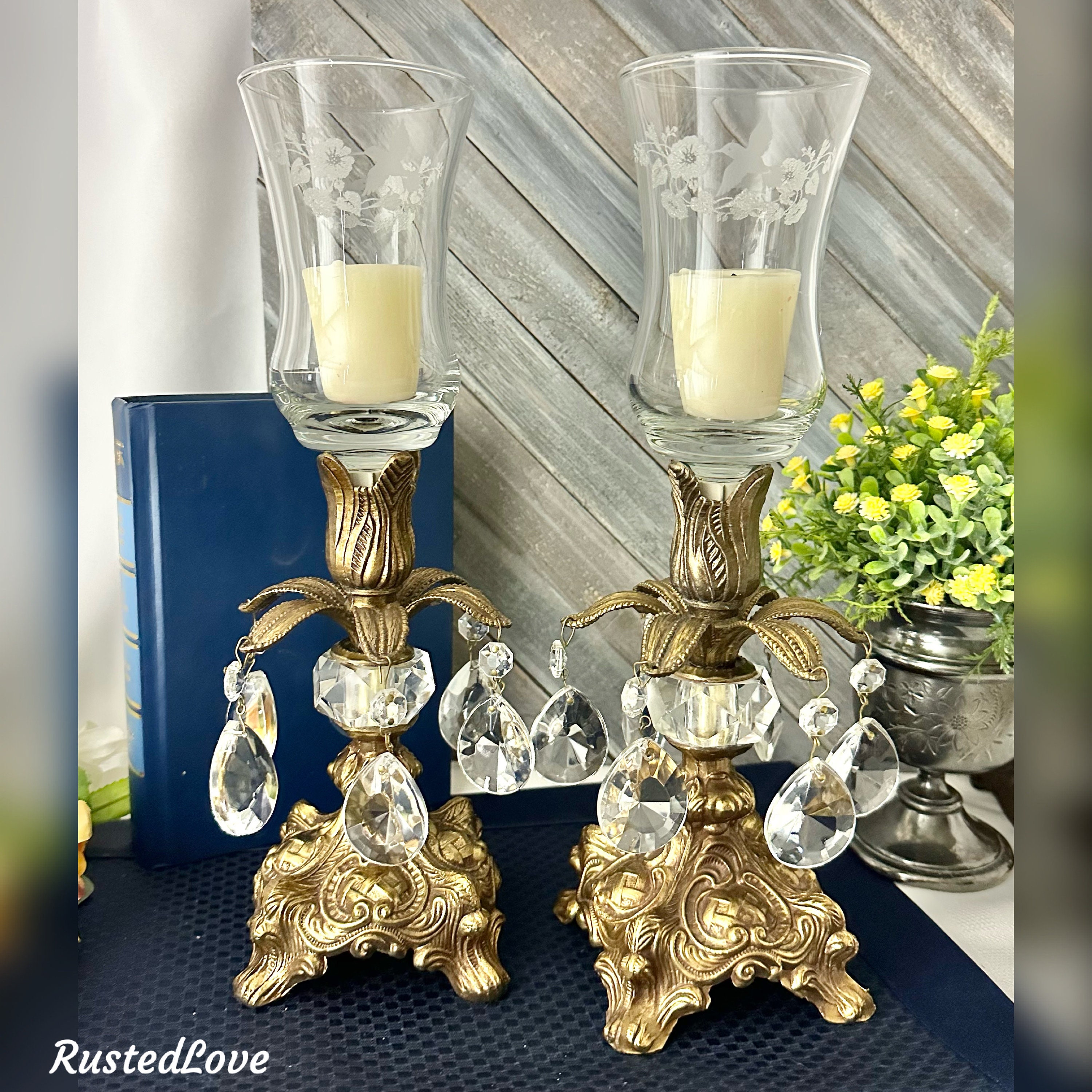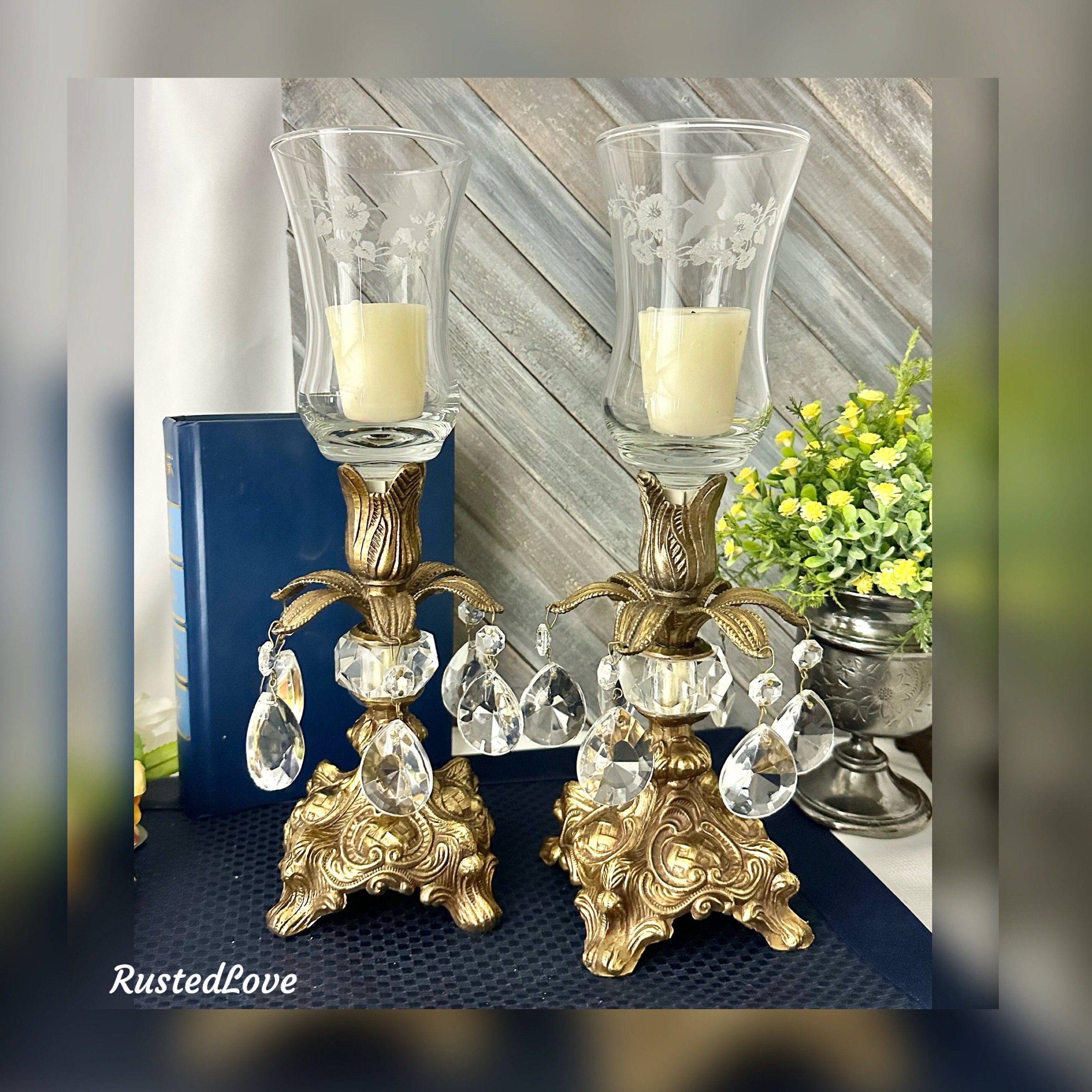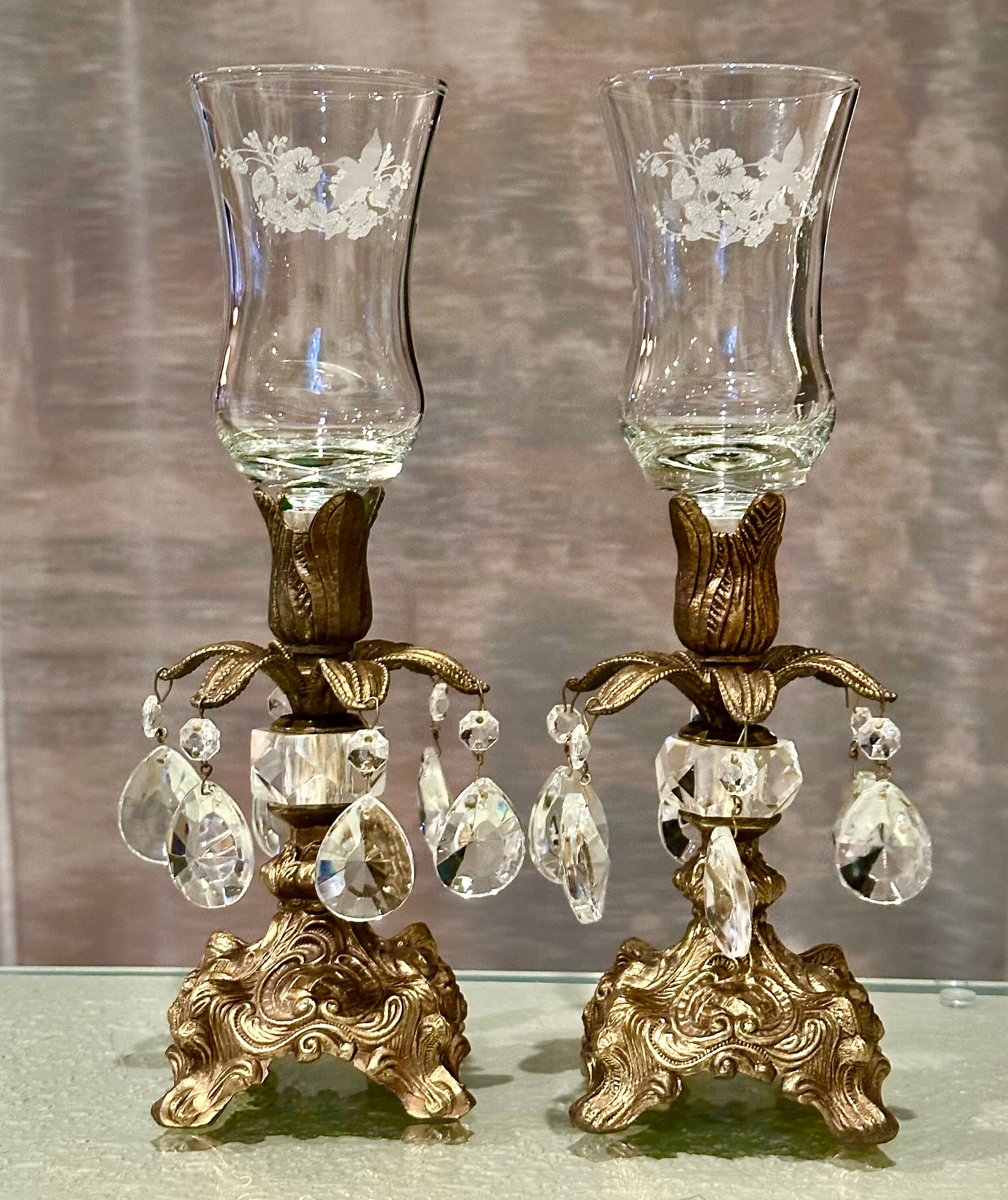 This is for a Pair of lovely vintage baroque style candle holders that are metal that hold small pillars or tea lights or tapers used without the glass. They have wonderful light catching crystals hanging from the stems. The base is marked with makers initials of B.M. and number 818.