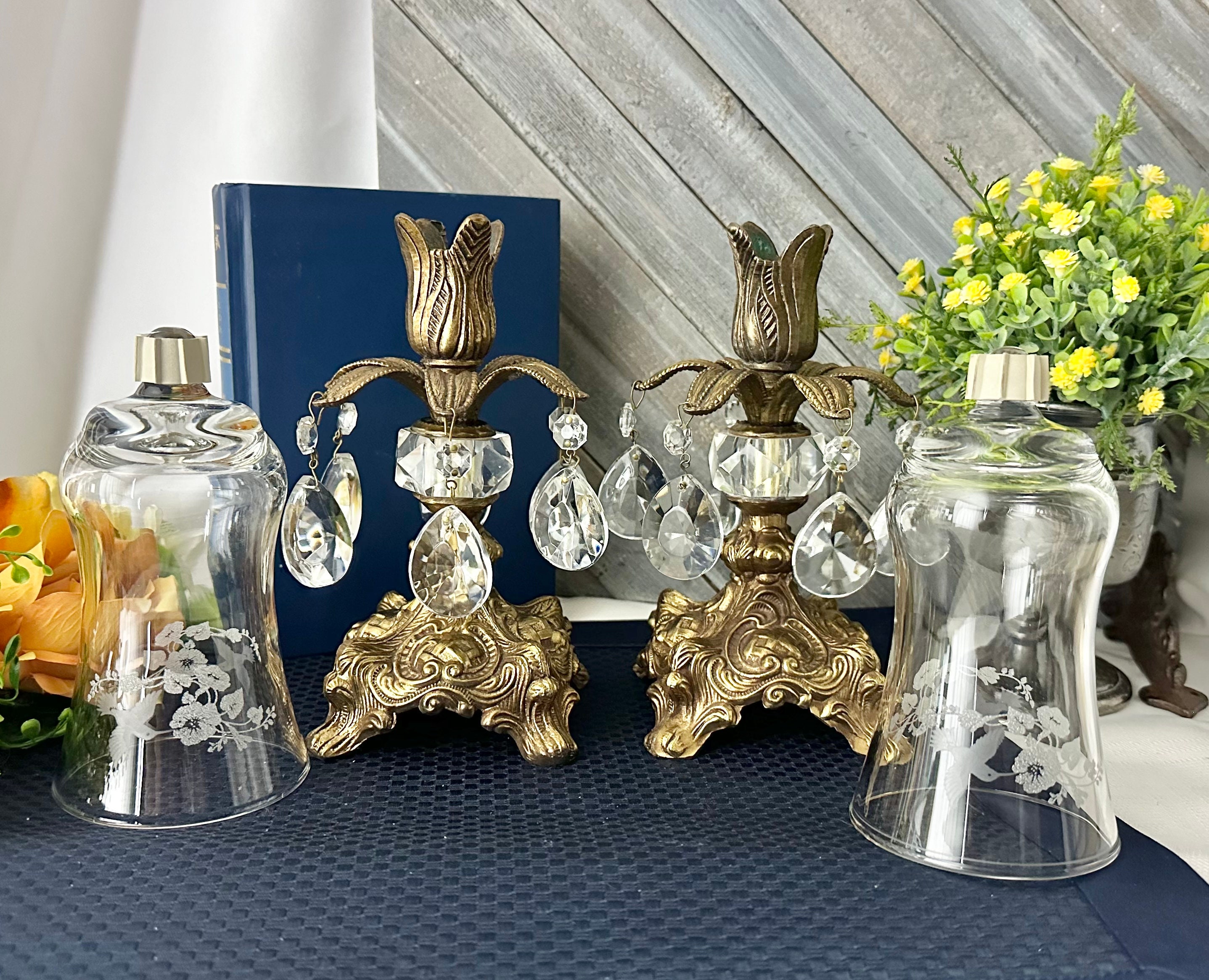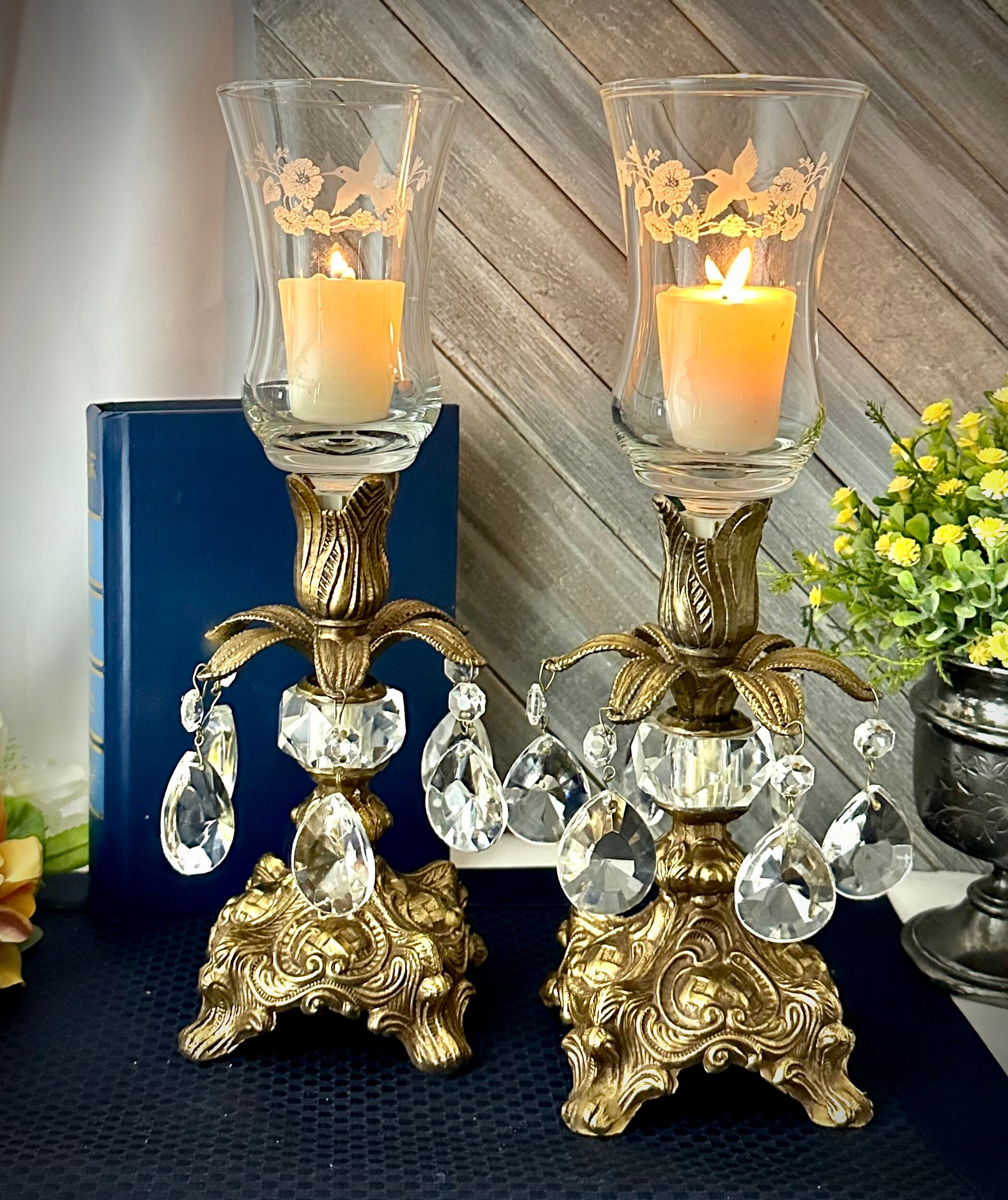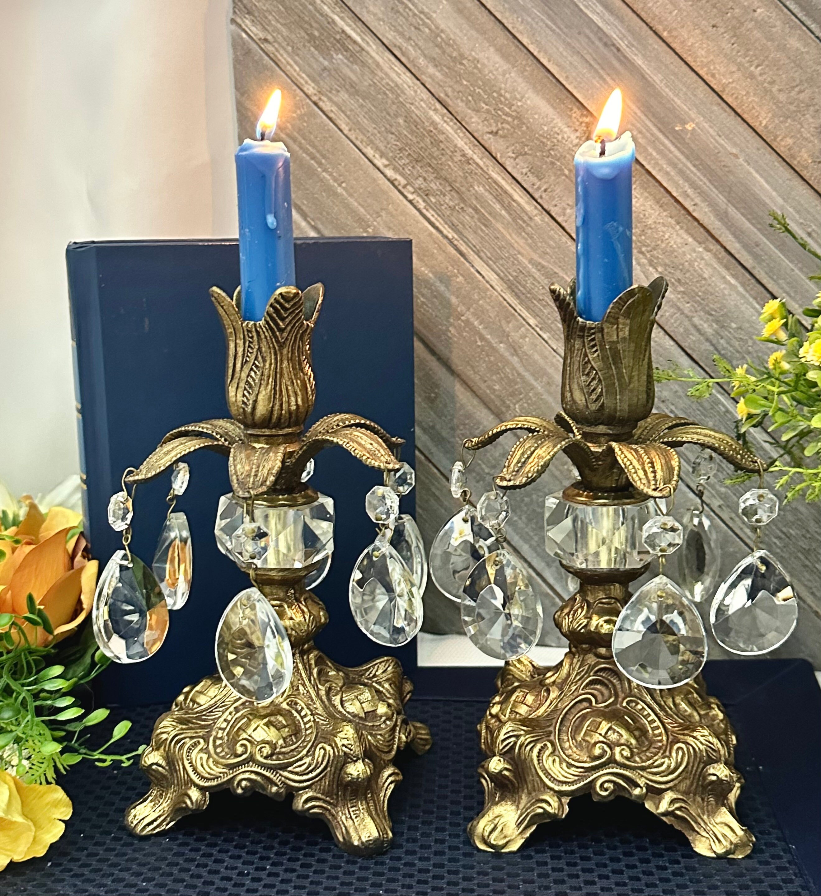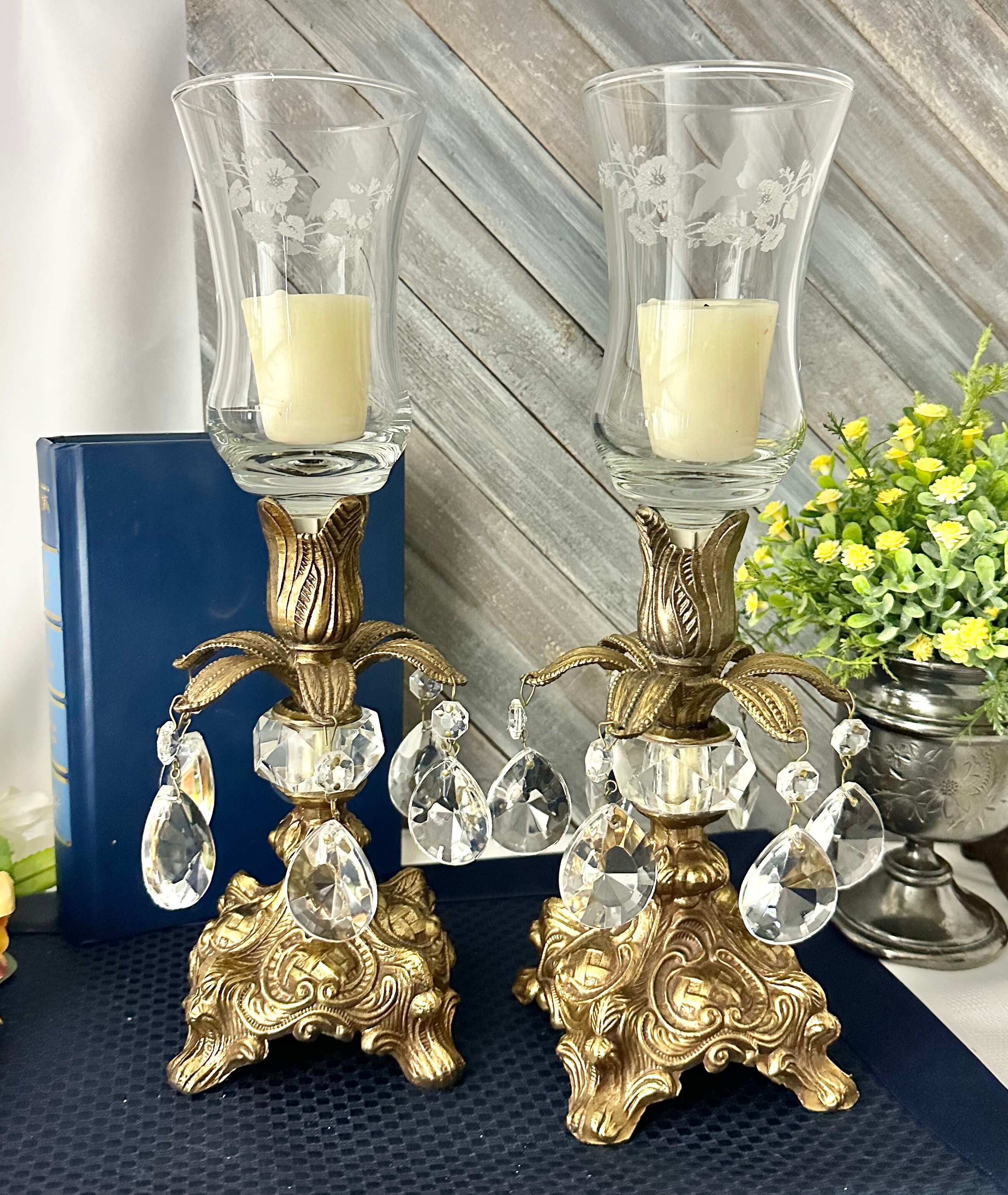 This is for a Pair of lovely vintage baroque style candle holders that are metal that hold small pillars or tea lights or tapers used without the glass. They have wonderful light catching crystals hanging from the stems. The base is marked with makers initials of B.M. and number 818.