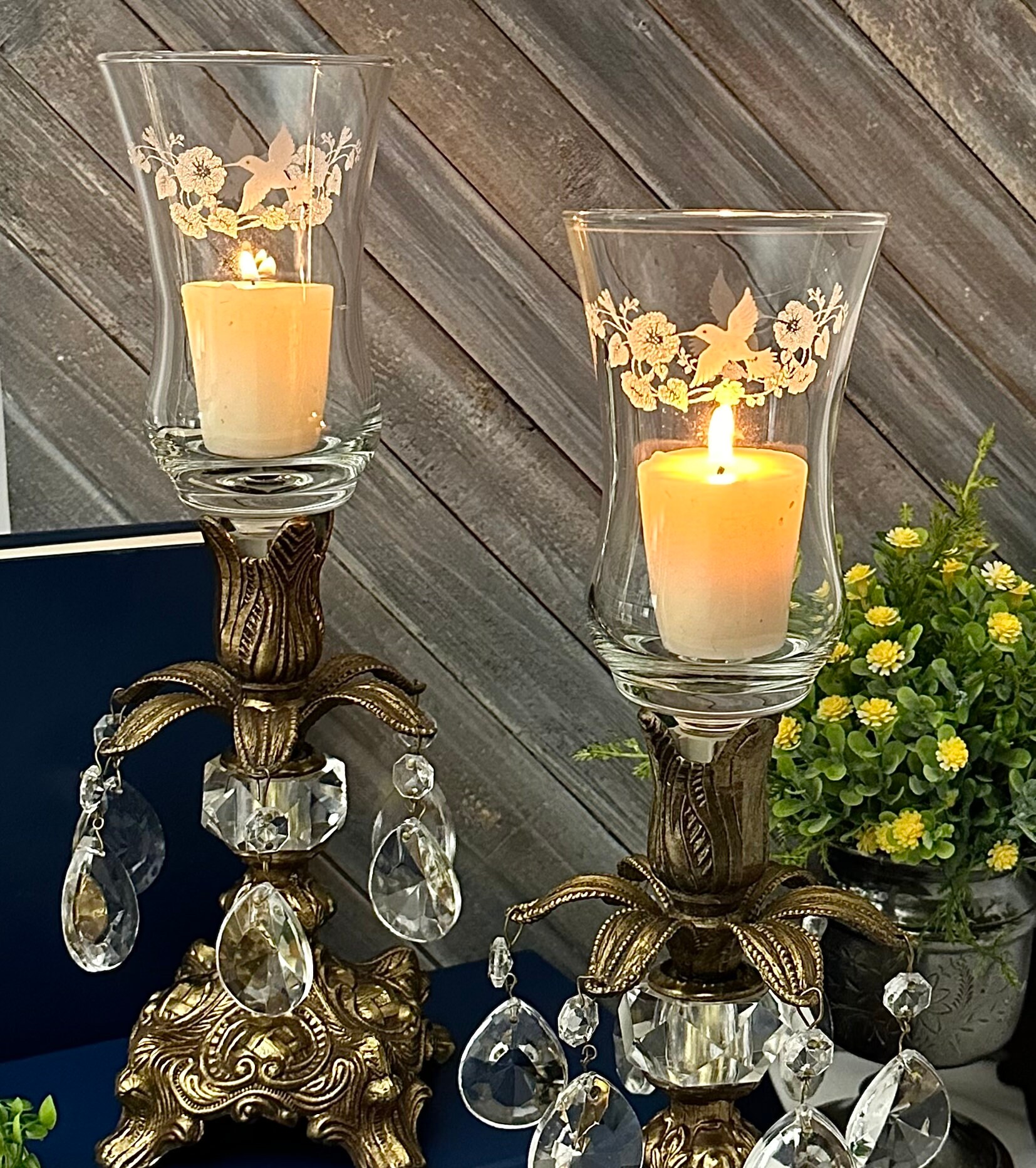 These measure : 12 inches tall x 4 inches wide x 4 inches deep. These have glass hurricanes that are clear with hummingbirds and flowers. The base is molded metal with a brass like finish.