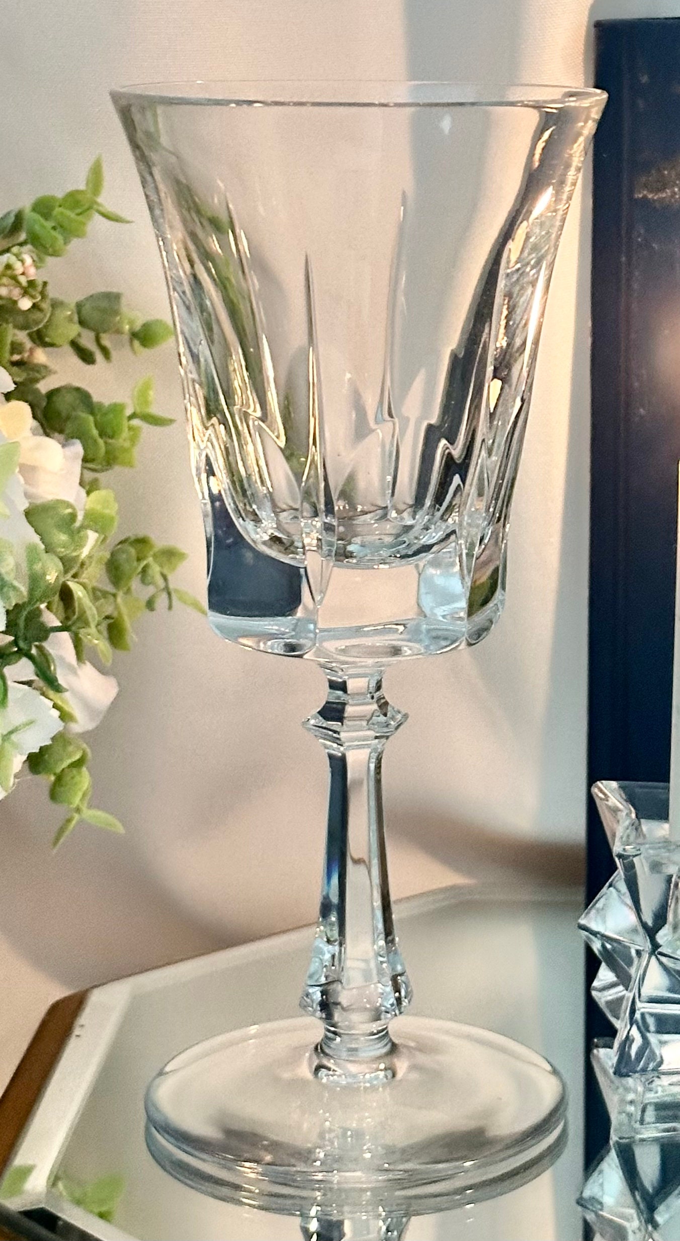 This blown glass water goblet measures: 7.25 inches tall with a diameter of 3 3/8 inches. This is in wonderful condition and makes for a perfect replacement glass to enjoy for years to come.