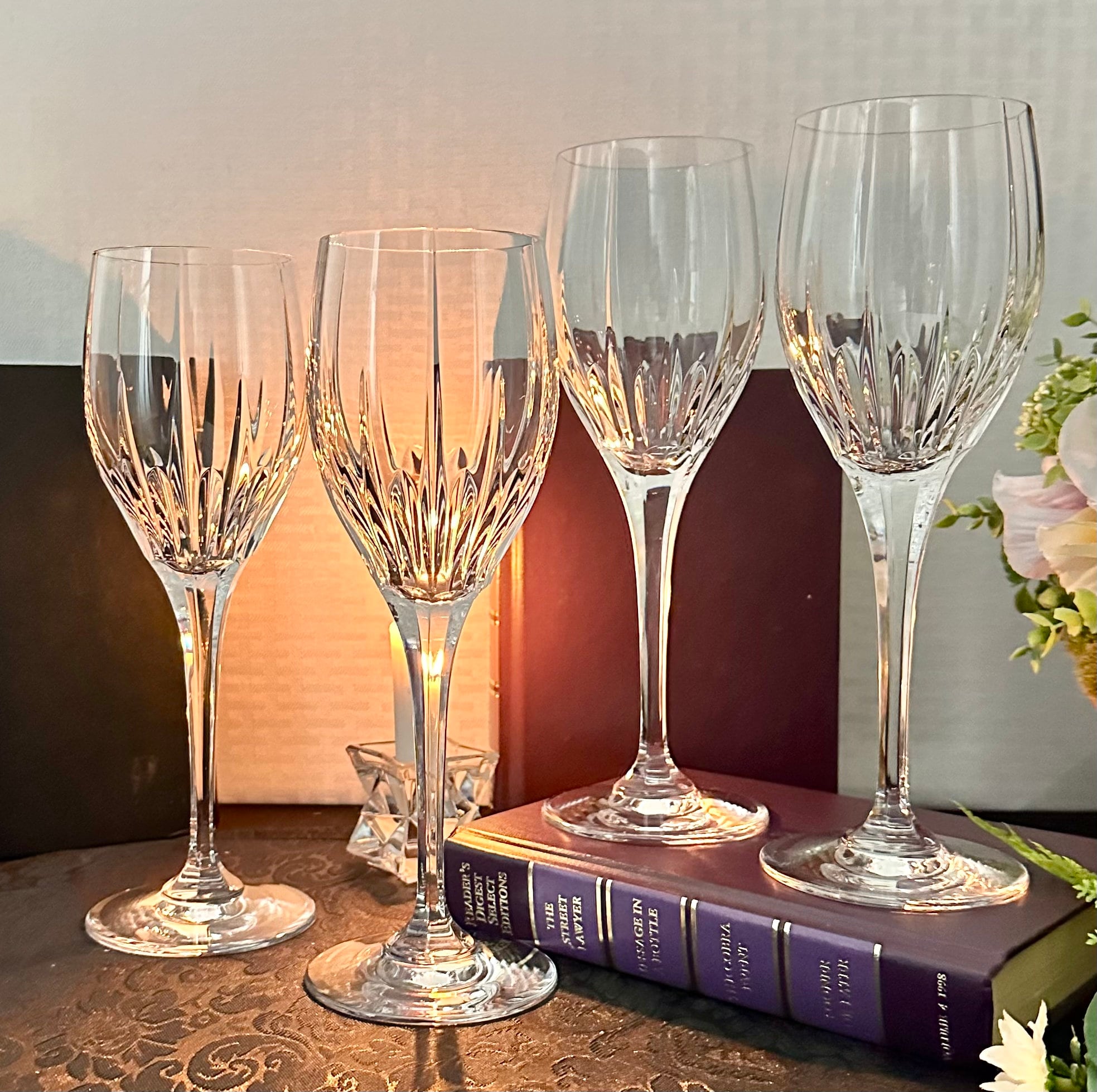 This is for a beautiful set of 4 vintage Mikasa Crystal glasses in the Arctic Lights pattern. These Mikasa glasses have deep vertical cuts on the bowl that lead to a multisided stem. These are beautiful statement glasses in the Water Glass size . These measure: 9 inches tall and have a 2 3/4 inch diameter bowl.