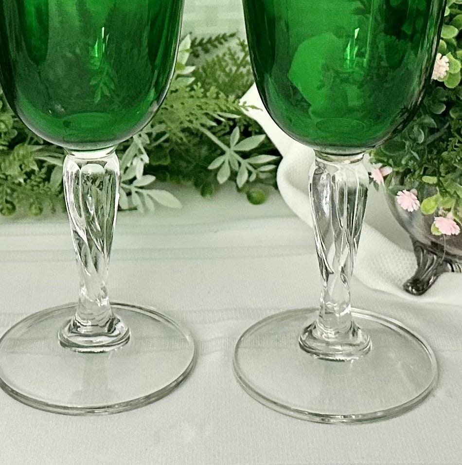 These are blown glass with a molded clear stem. These are in wonderful condition with no chips or cracks and ready to use and would be perfect replacement glasses or to start a new set!