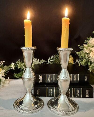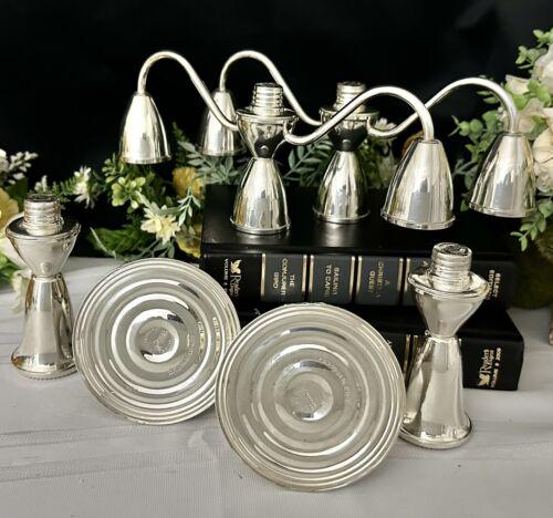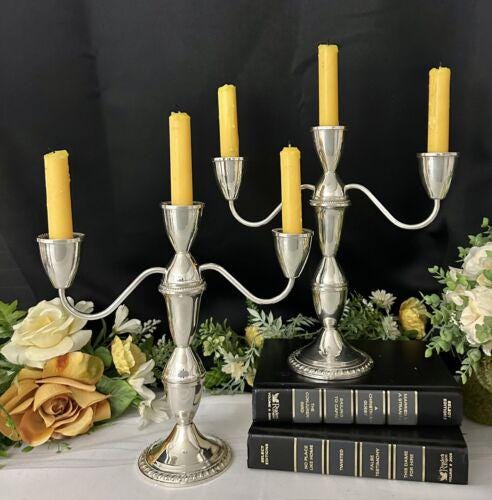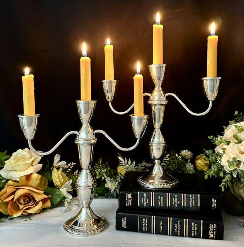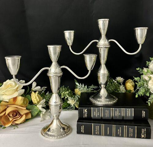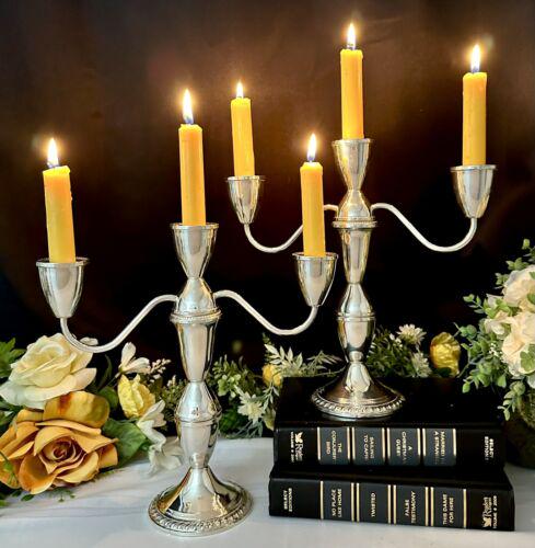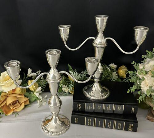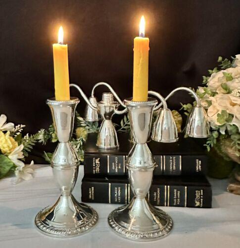 This is for a pair of Duchin convertible Sterling Silver Candelabras that each holds 3 tapper / dinner candles when the arm is used. These are marked on the base with the maker, Duchin Creations. These lovely candelabras are weighted and reinforced. The arm can be set aside and the center candle holder will hold a single taper / dinner candle. Each of these uses 3 pieces screwed together to make the tallest configuration.