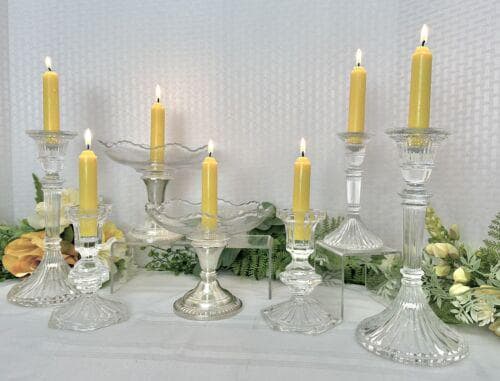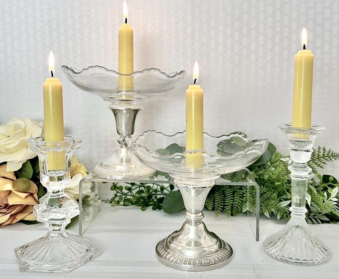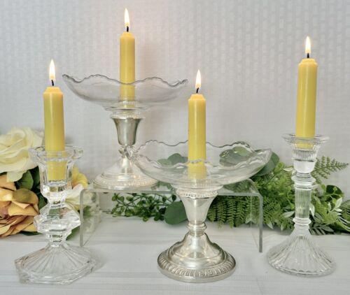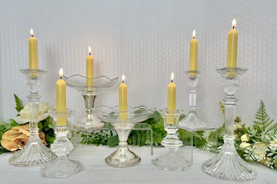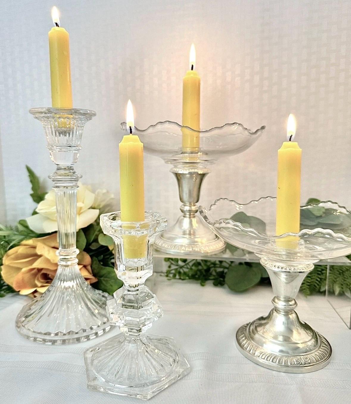 The glass bowl, Bobeche Bowl, has a center holder for a candle but could also hold some low fresh flowers. The set works perfectly as a grouping for a table centerpiece or to place on top of perhaps a mantle or buffet table.