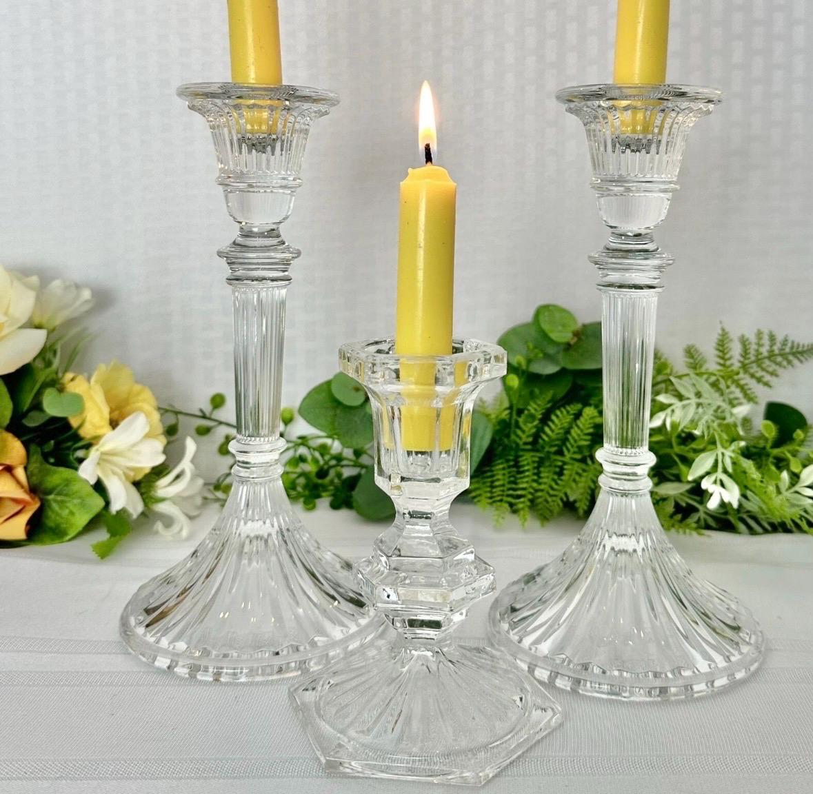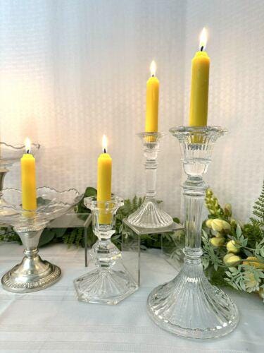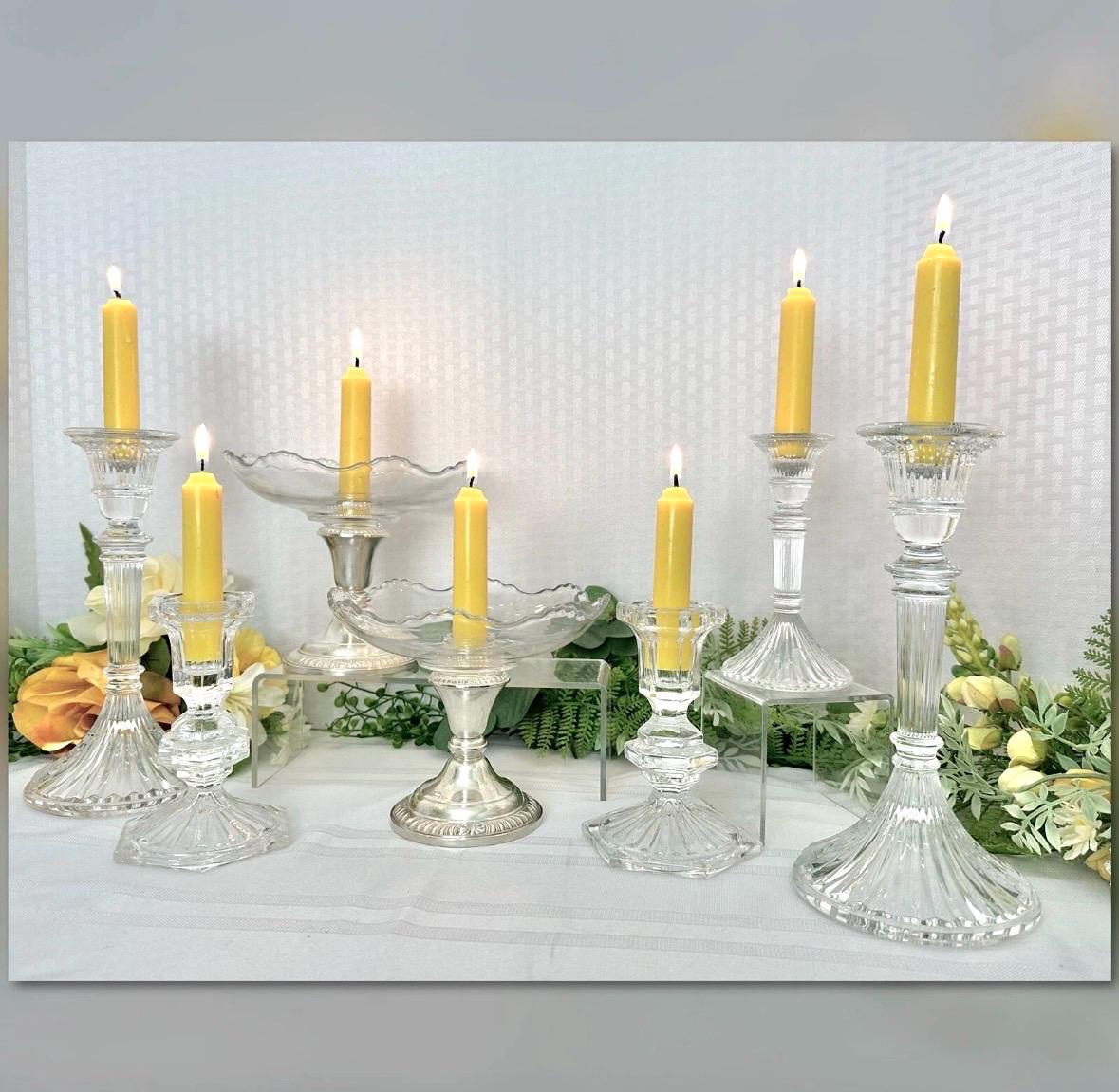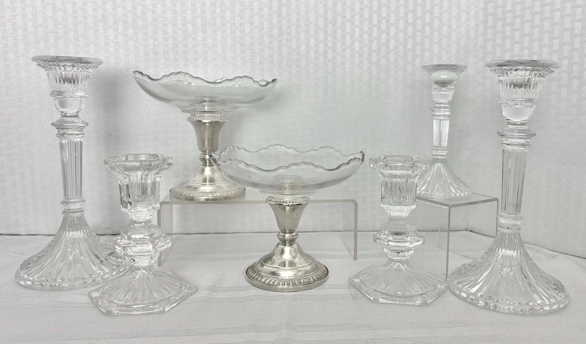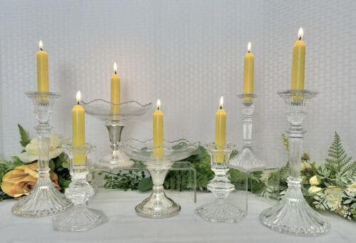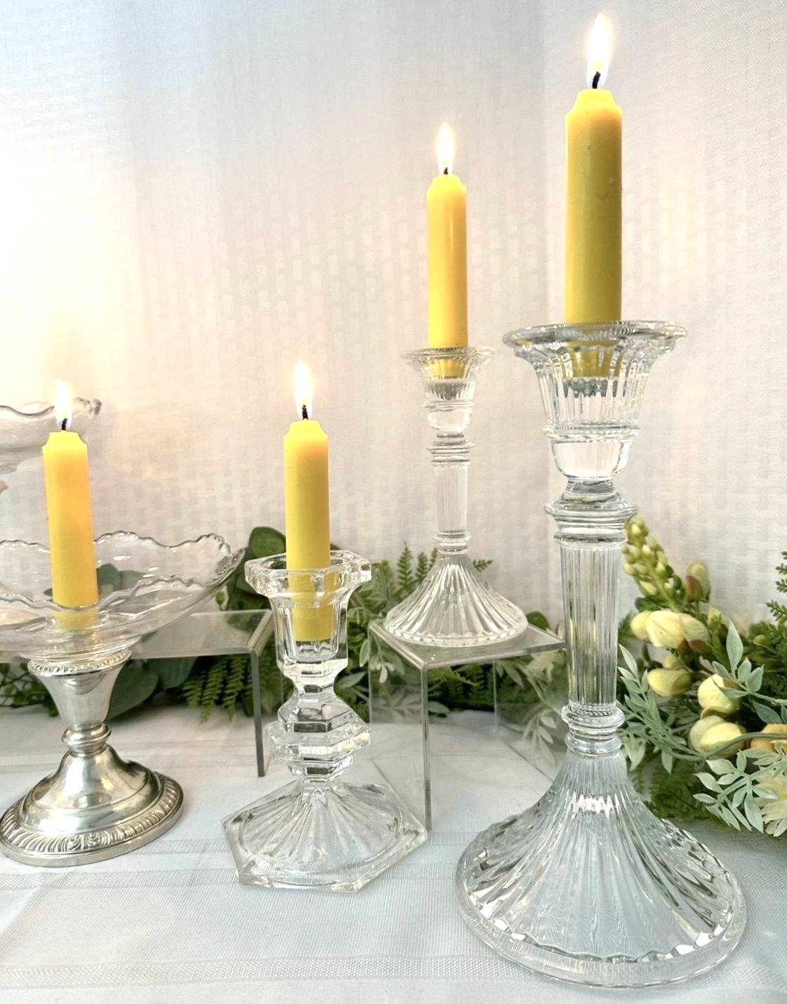 The glass bowl, Bobeche Bowl, has a center holder for a candle but could also hold some low fresh flowers. The set works perfectly as a grouping for a table centerpiece or to place on top of perhaps a mantle or buffet table.