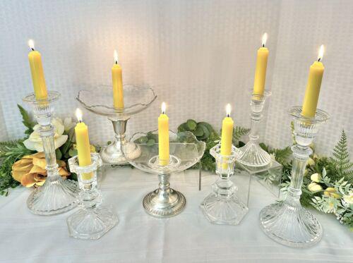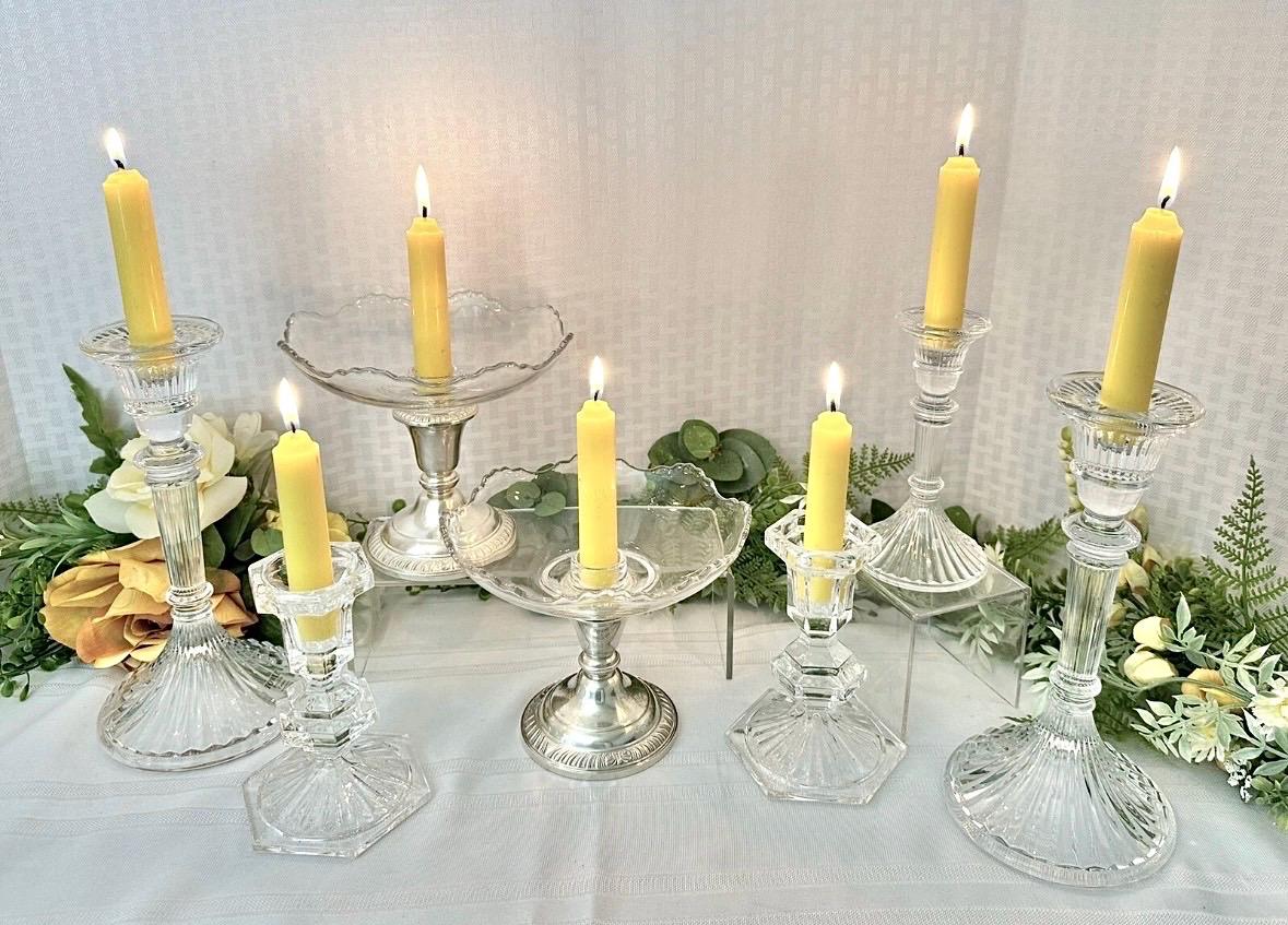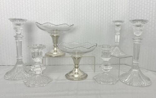 This is for a mixed set of candle holders. There are single candlesticks mixed with sterling silver candle holders that have screwed in glass vintage bowls, which can or cannot be used. The set includes 9 pieces.