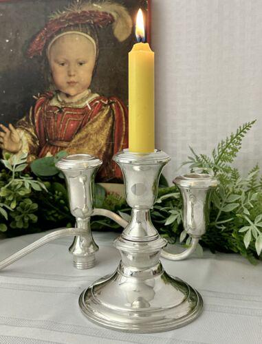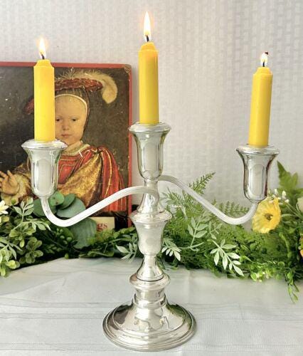 This is for a Sterling Silver Candelabra. This is in The Pilgrim pattern from Reed and Barton. This 3 arm candle holder is comprised of 3 pieces screwed together. The piece is marked with Sterling, makers name and weighted and reinforced.