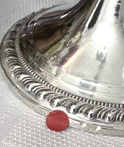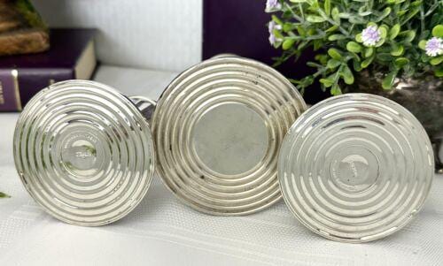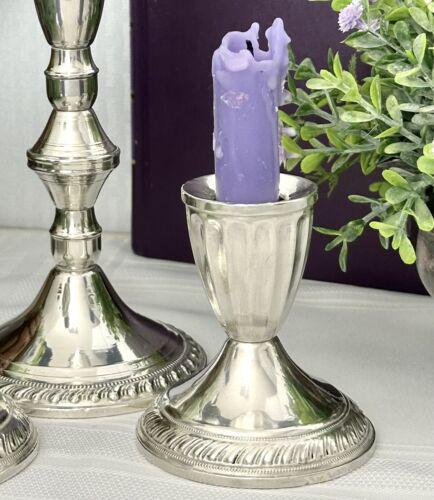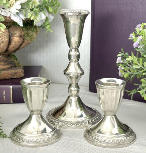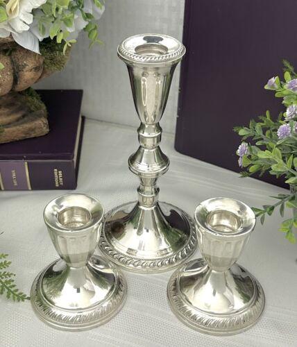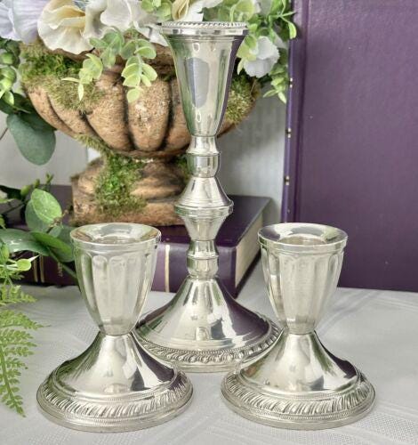 This is for a set of 3 Sterling Silver nsole candle holders. These are 2 different makers yet go together with the styling and the decorated styled rims. These each hold one dinner / taper candles. They are polished and ready to use and display and surely will be enjoyed for years to come. Please not one small dent on base as shown in the pictures.