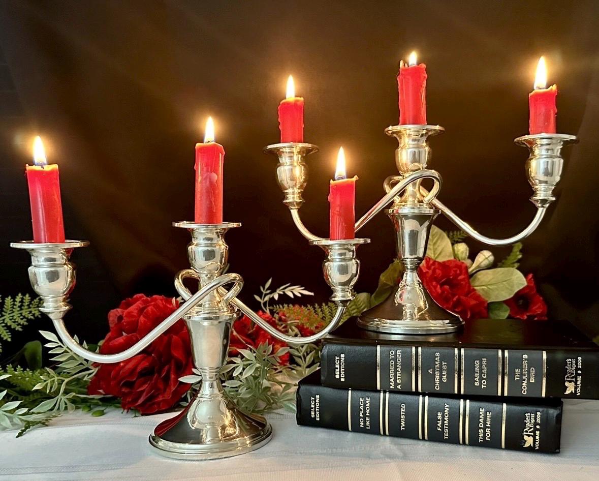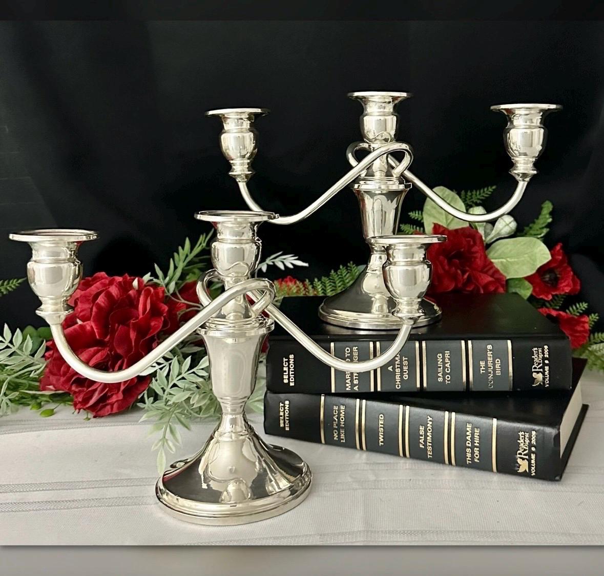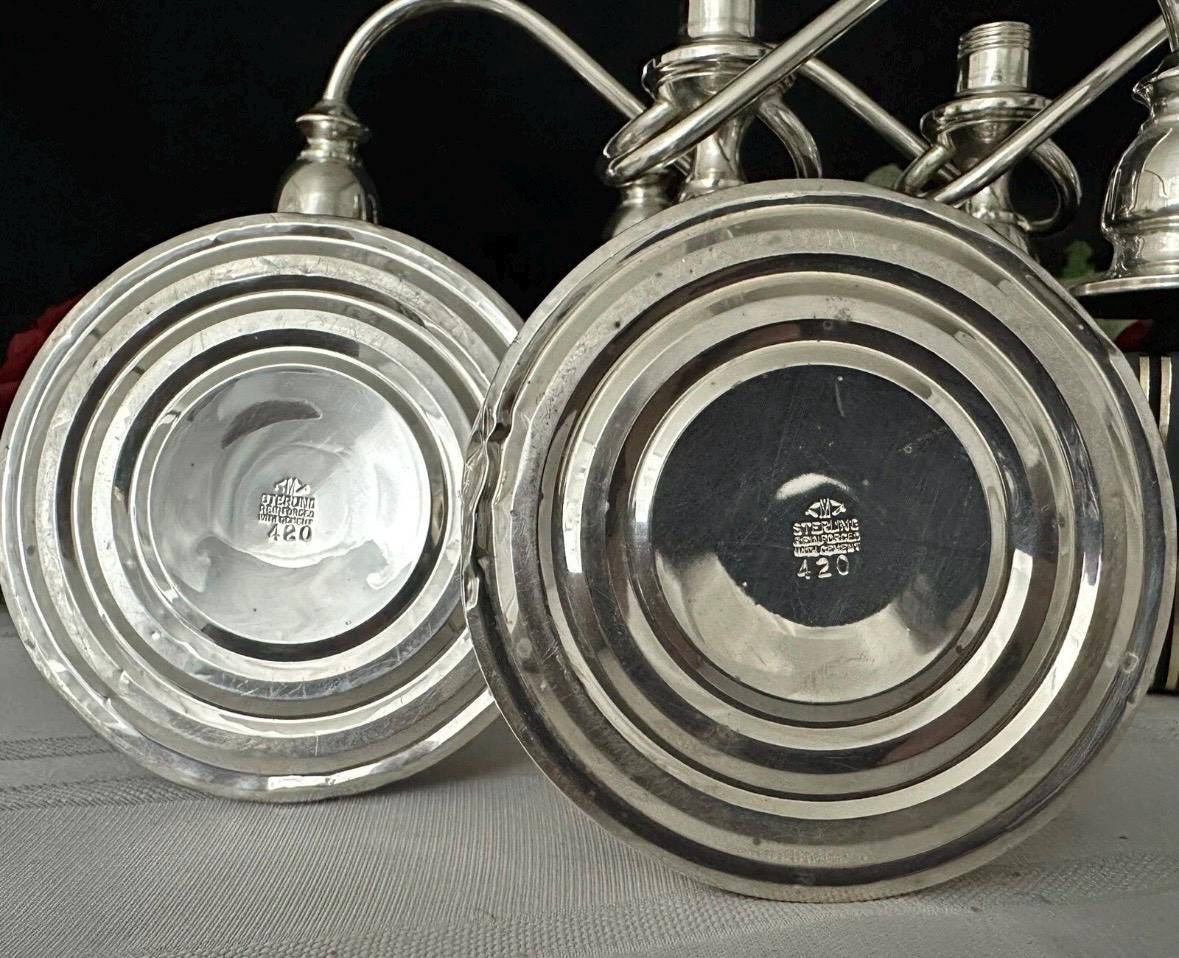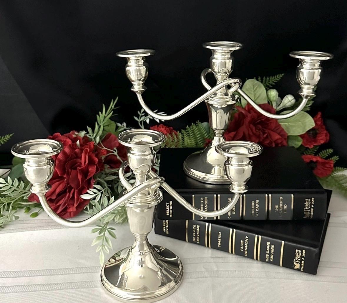 This is for a vintage pair of collectible Sterling Silver Vintage / Antique Candelabras. These have twisted arms and each holds a total of 3 taper Candle sticks. These elegant candle holders are Sterling Silver from JW Mueck (maybe later to be Mueck-Cary ... Inc., New York, NY - which is now owned by Towle silversmiths.