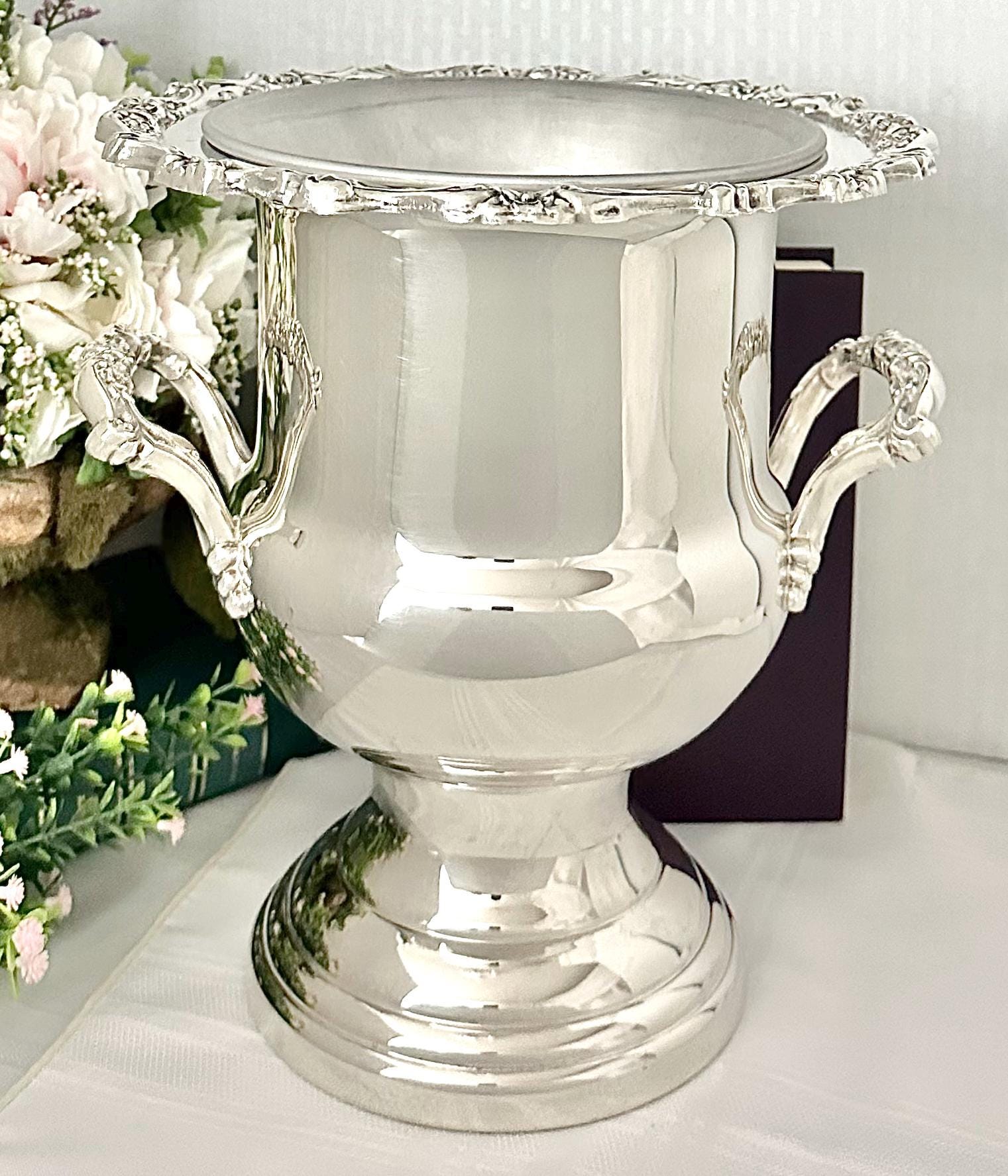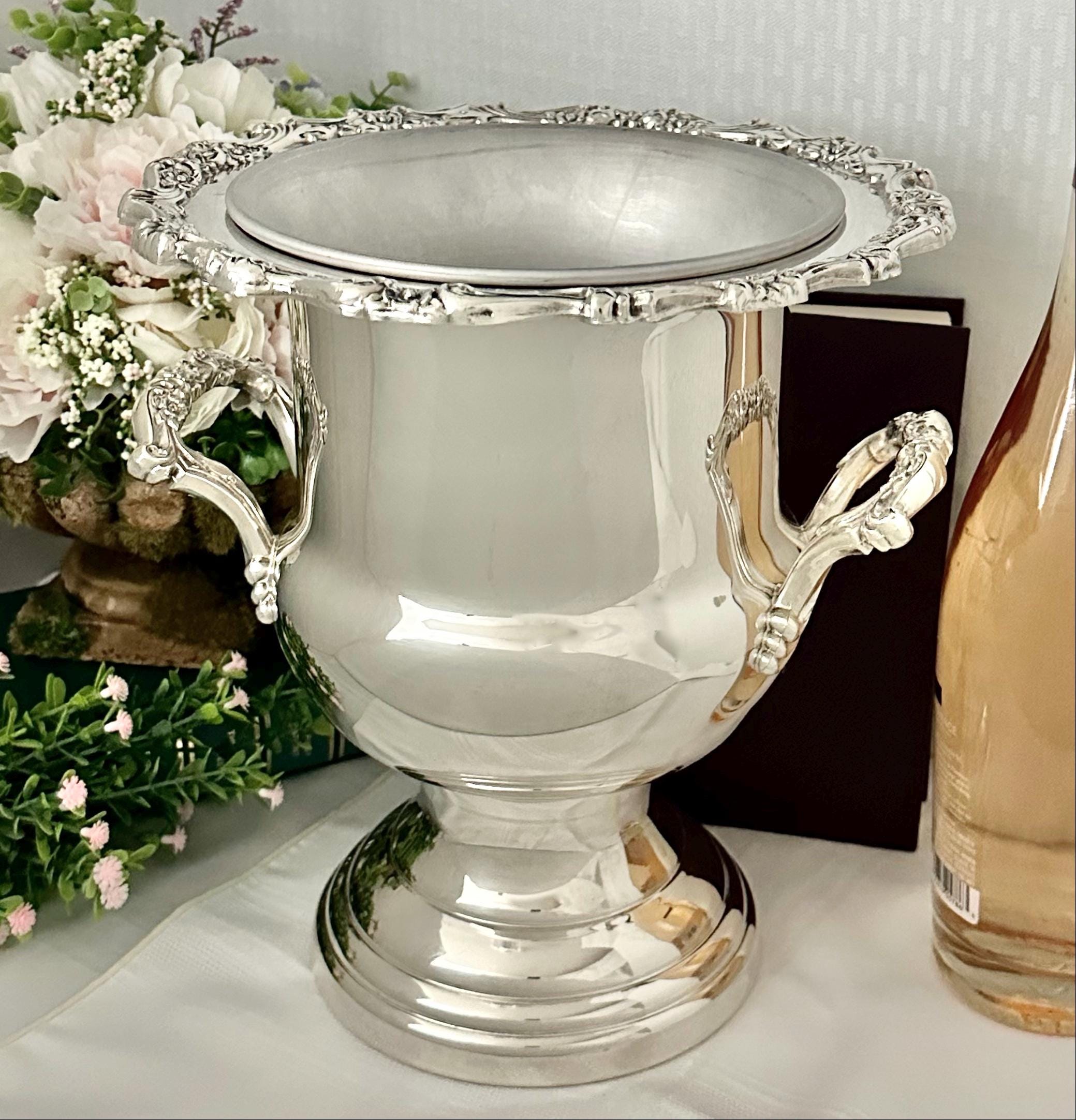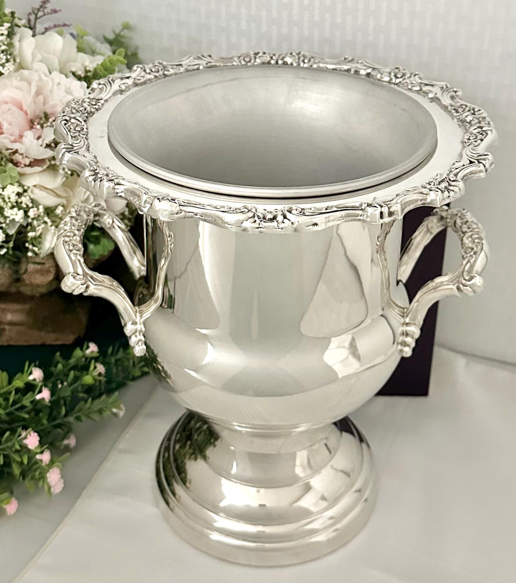 This is for a Vintage Oneida Champagne bucket / Wine chiller / Flower Urn / Trophy vase. This champagne bucket is Silver Plated with a floral rim and decorated handles.