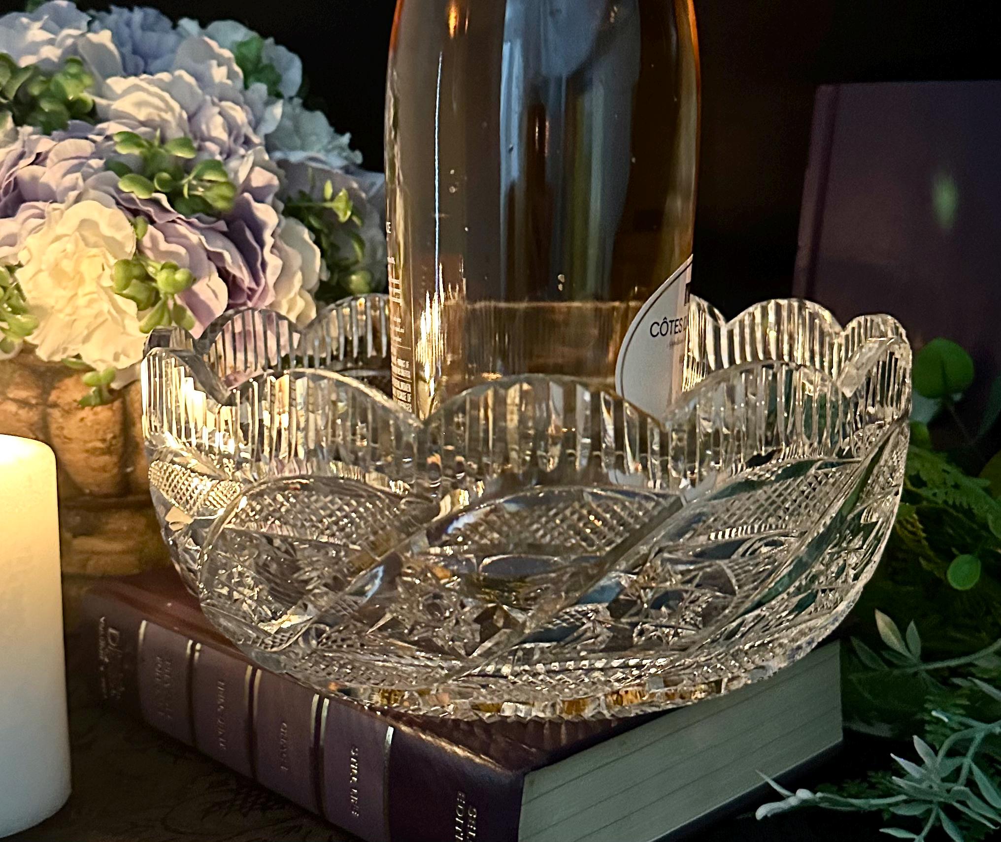 This wonderful Waterford Bowl has a decorated scalloped rim and cuts through out the bowl to catch the light and add to the prisms it reflects through the piece.