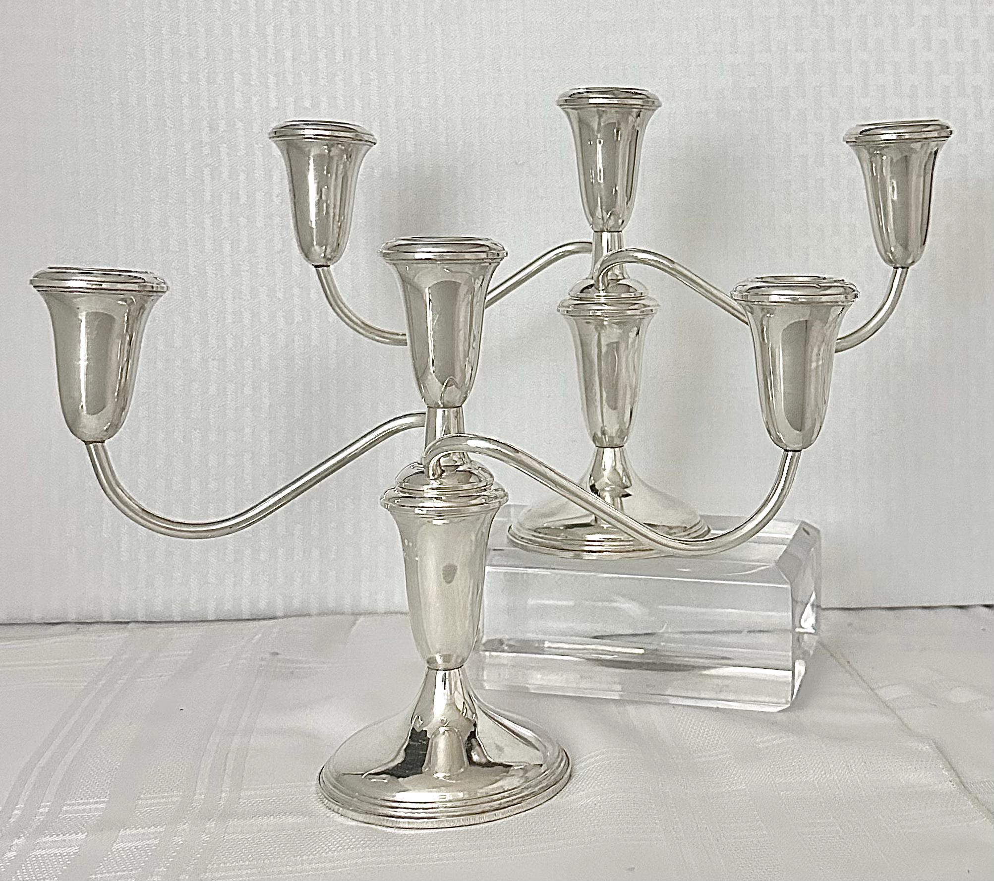 This is for a pair of Sterling Silver Empire #384 Candelabras that measure: 7.5 inches tall x 11.5 inches wide x 3.5 inches deep. They are in beautiful condition pieces and ready to use and enjoy for years to come.