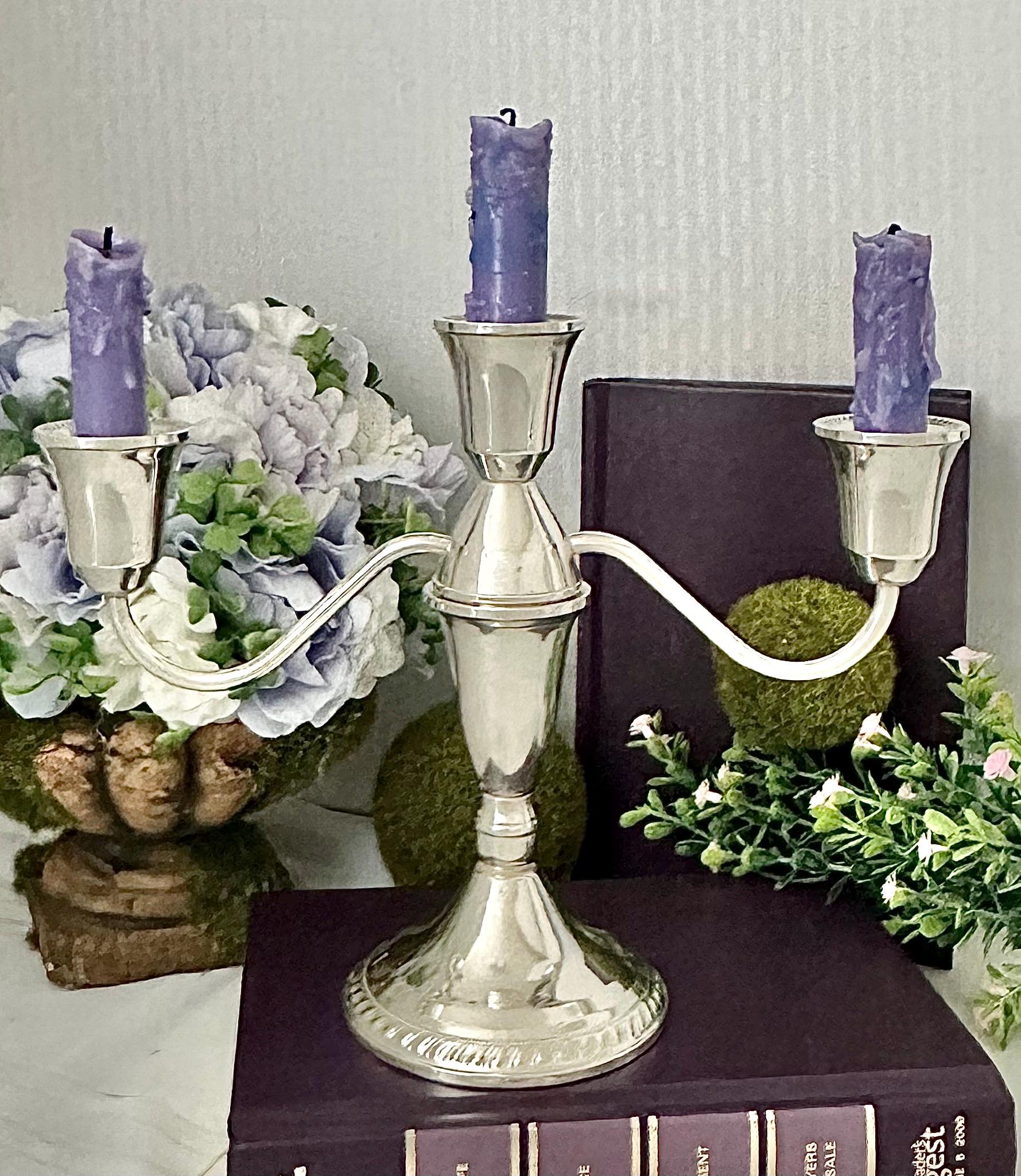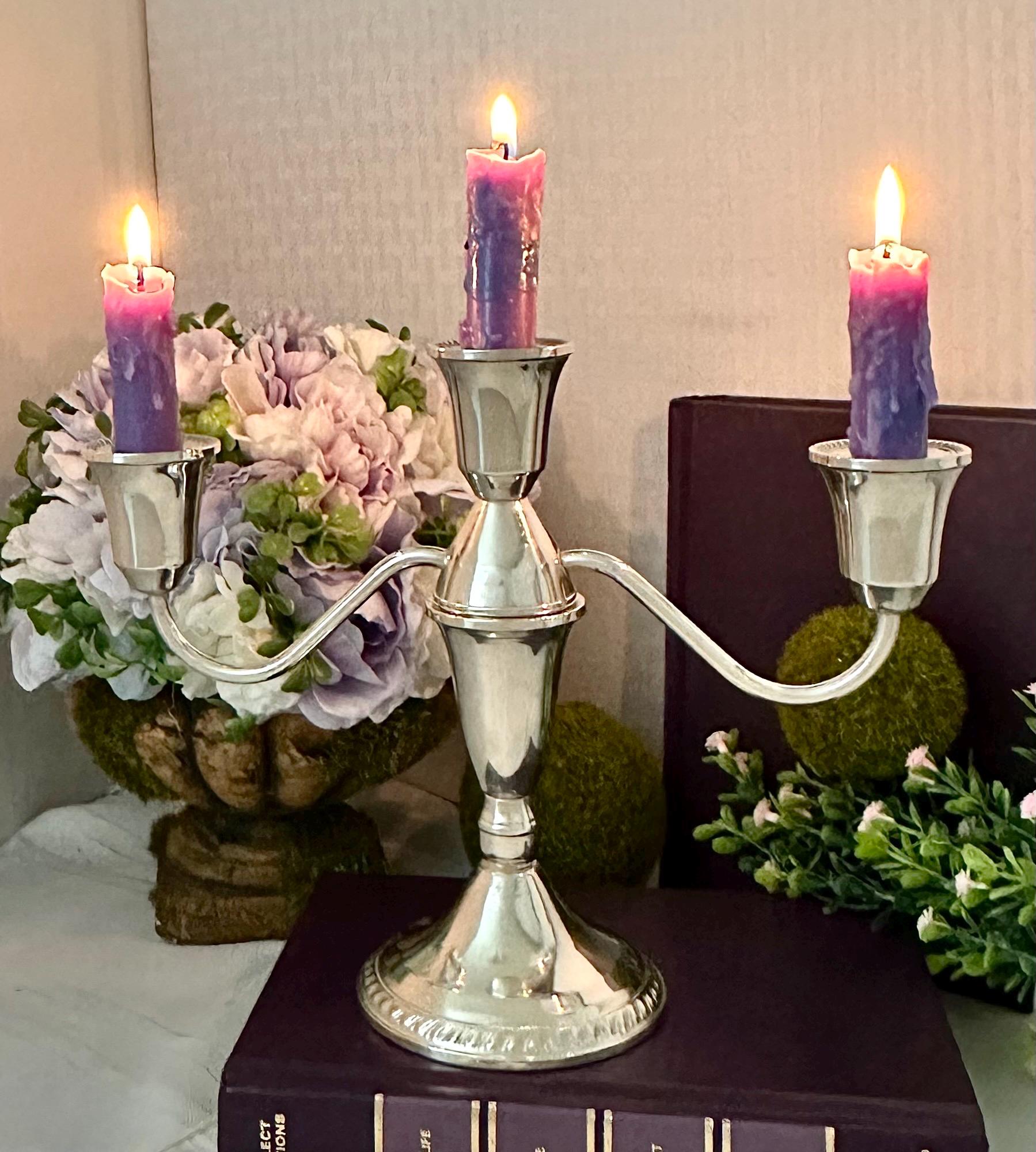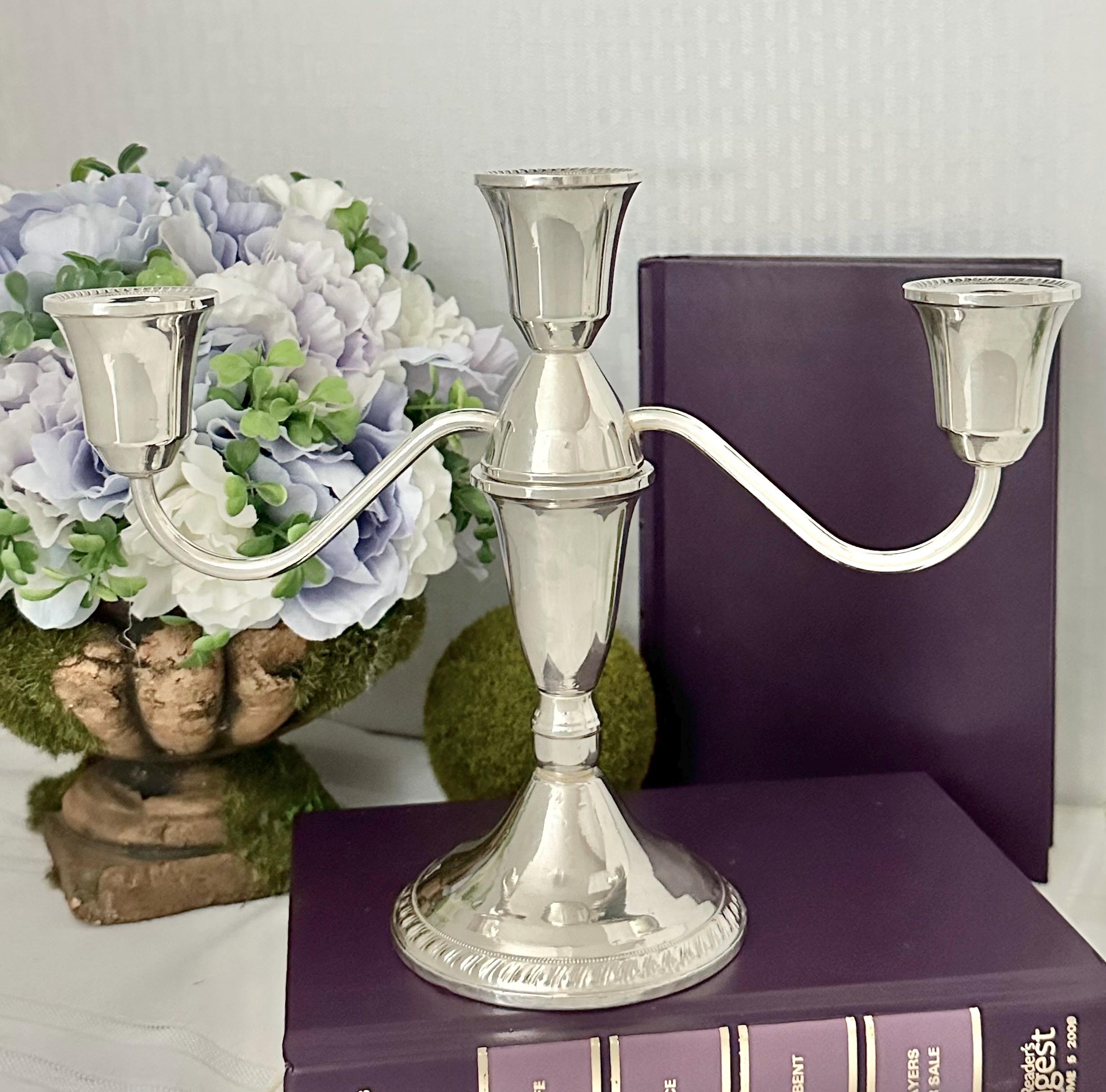 This is for 1 Vintage Duchin Sterling Silver Candelabra that holds 3 taper dinner candles. This comes apart and is 2 pieces put together to measure: 7.5 inches tall x 9.5 inches wide x 3.5 inches wide.