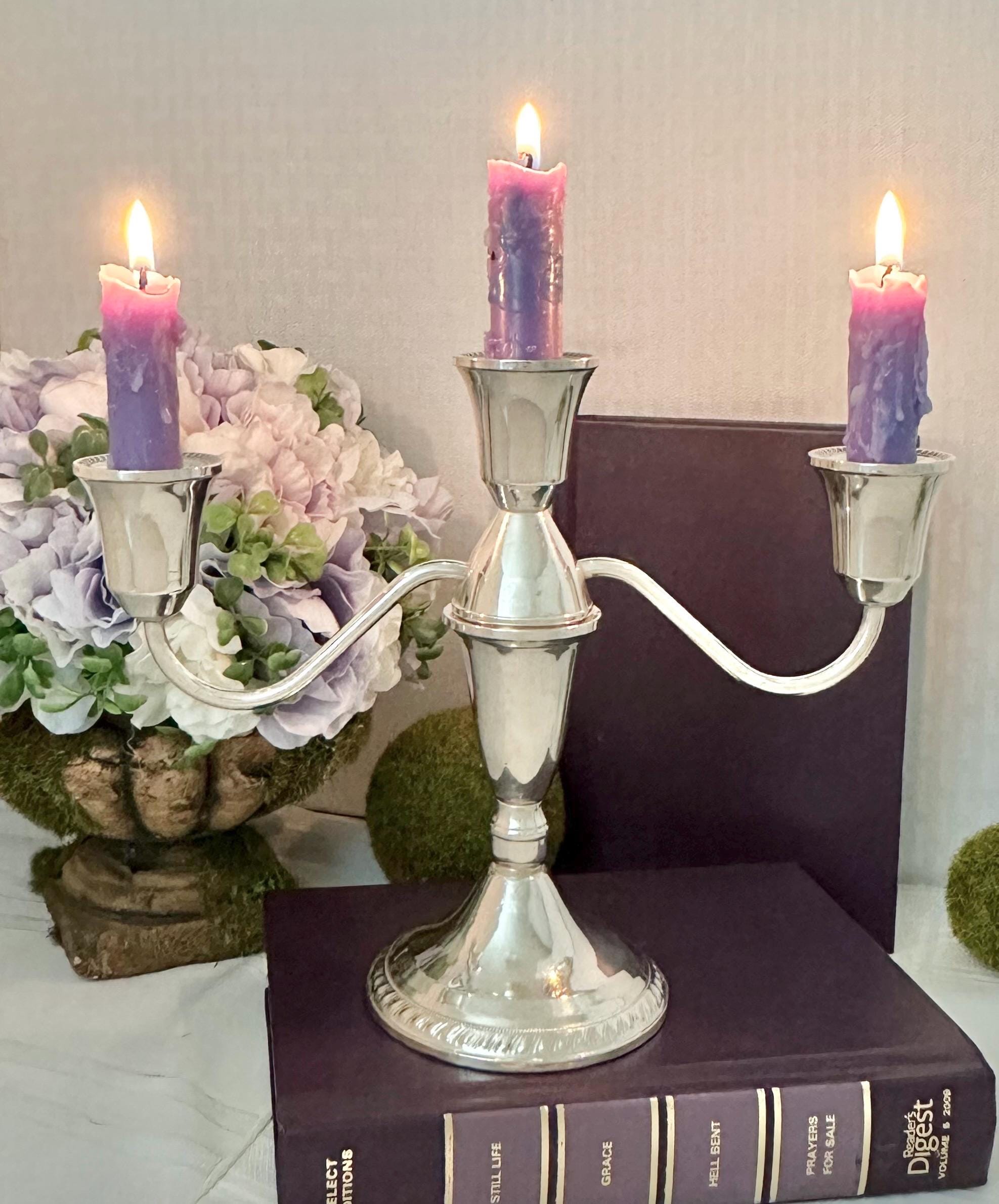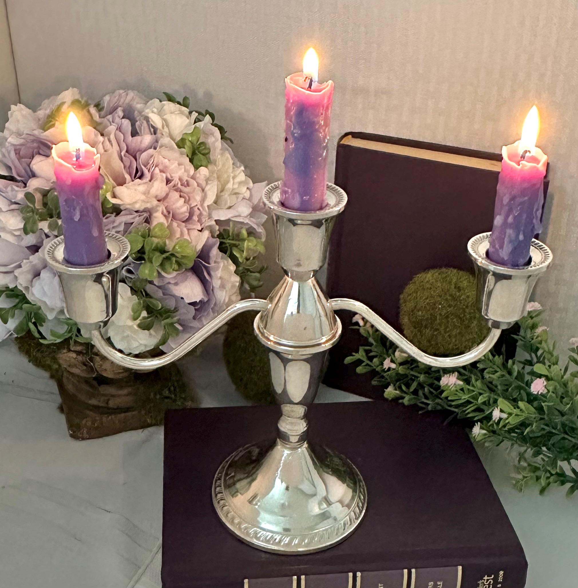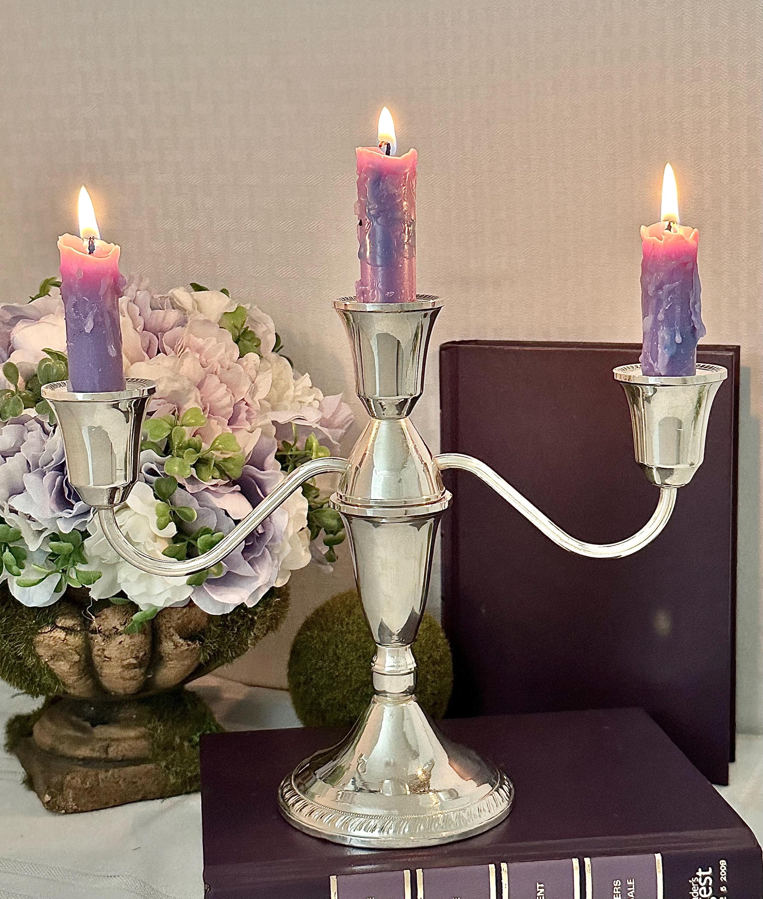 This is for 1 Vintage Duchin Sterling Silver Candelabra that holds 3 taper dinner candles. This comes apart and is 2 pieces put together to measure: 7.5 inches tall x 9.5 inches wide x 3.5 inches wide.