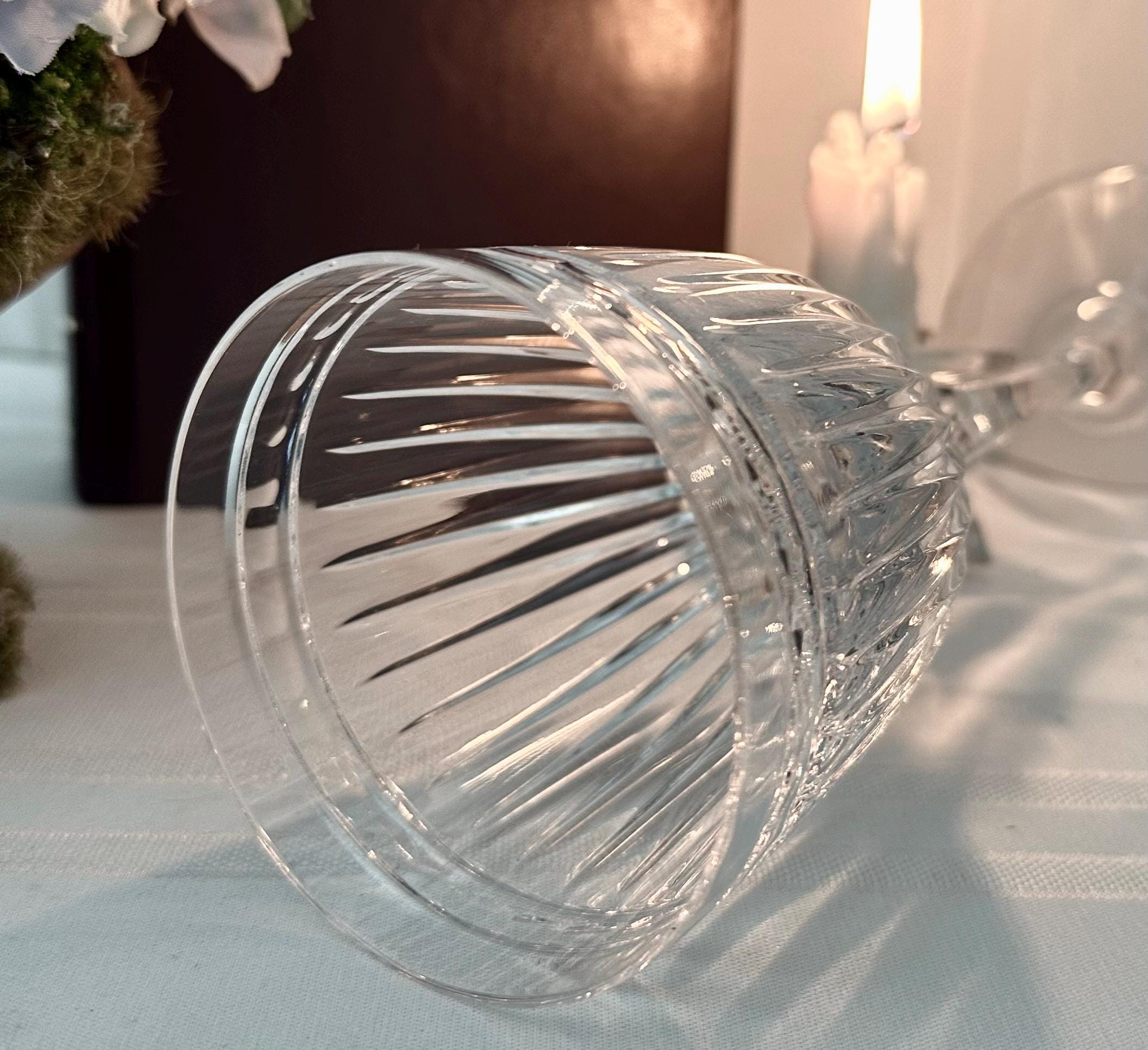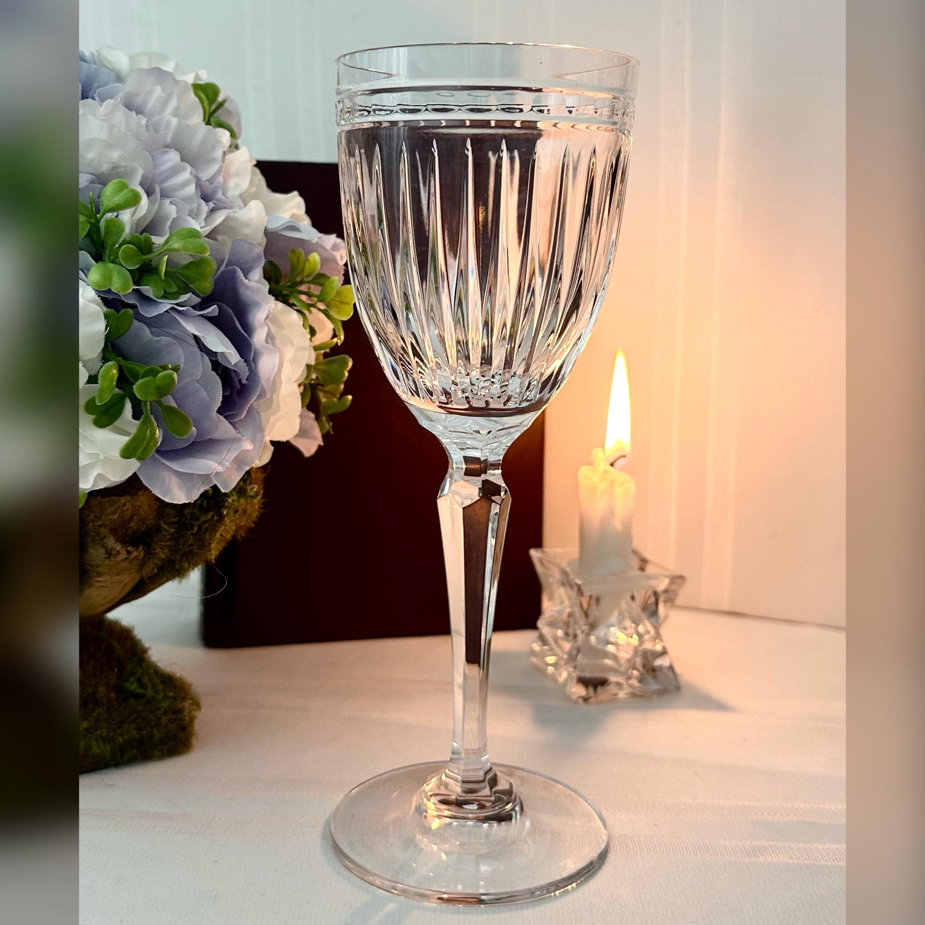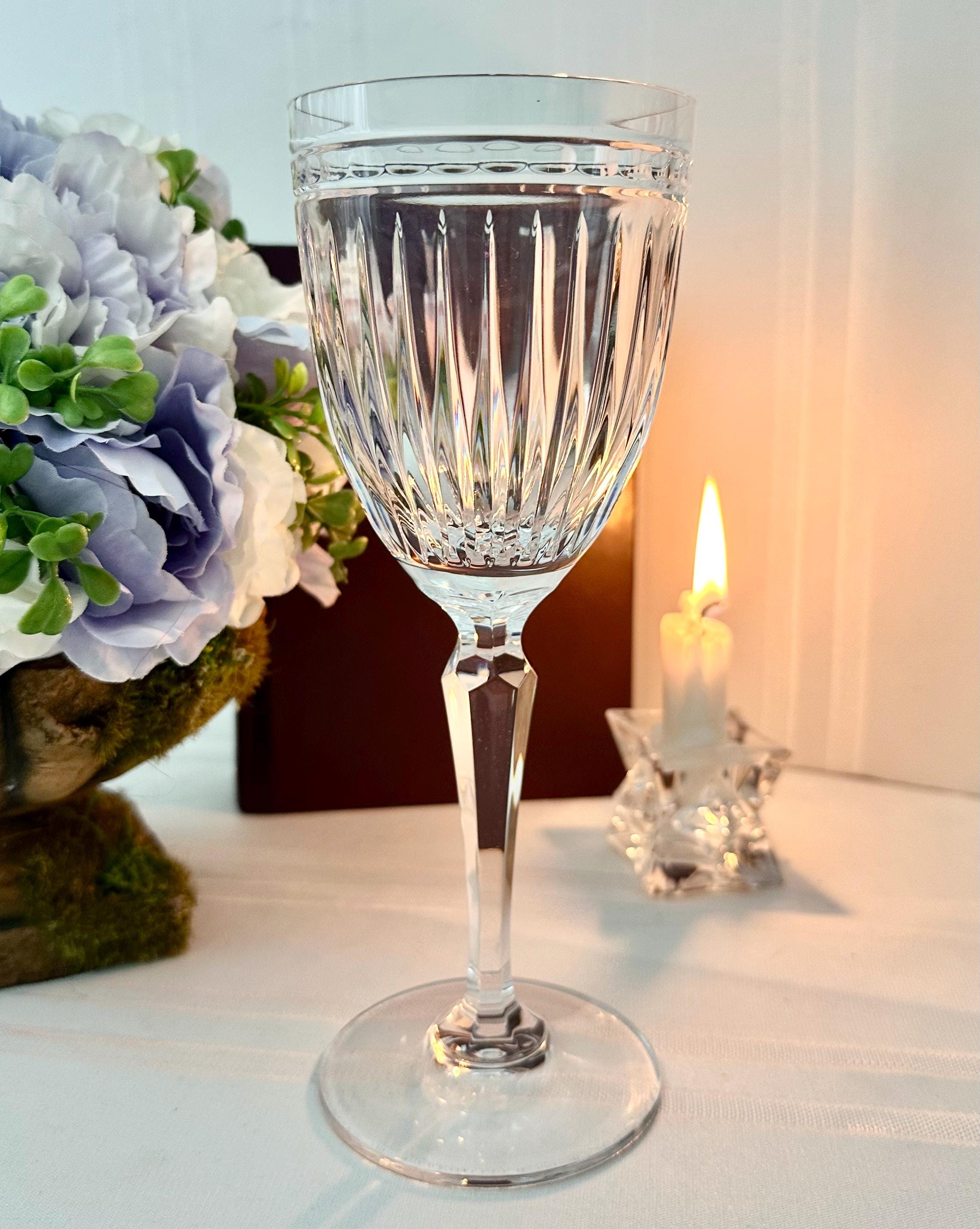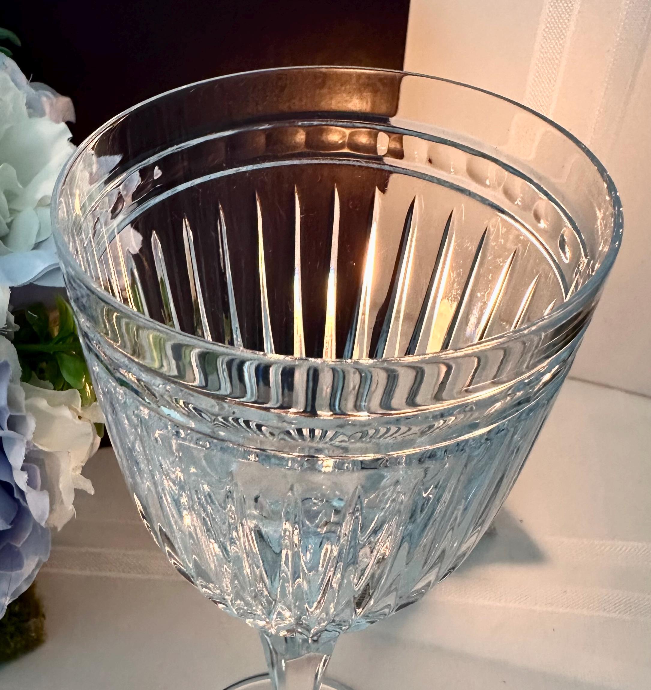 This is for 1 vintage Water Hanover goblet. This is from Waterford Crystal from the Marquis collection in the Hanover pattern. This lovely beautiful blown glass is clear with no trim. The bowl has vertical cuts and then a multi-sided stem and a plain foot. This line of glasses was crafted from 1993 to 2010 and then discontinued.