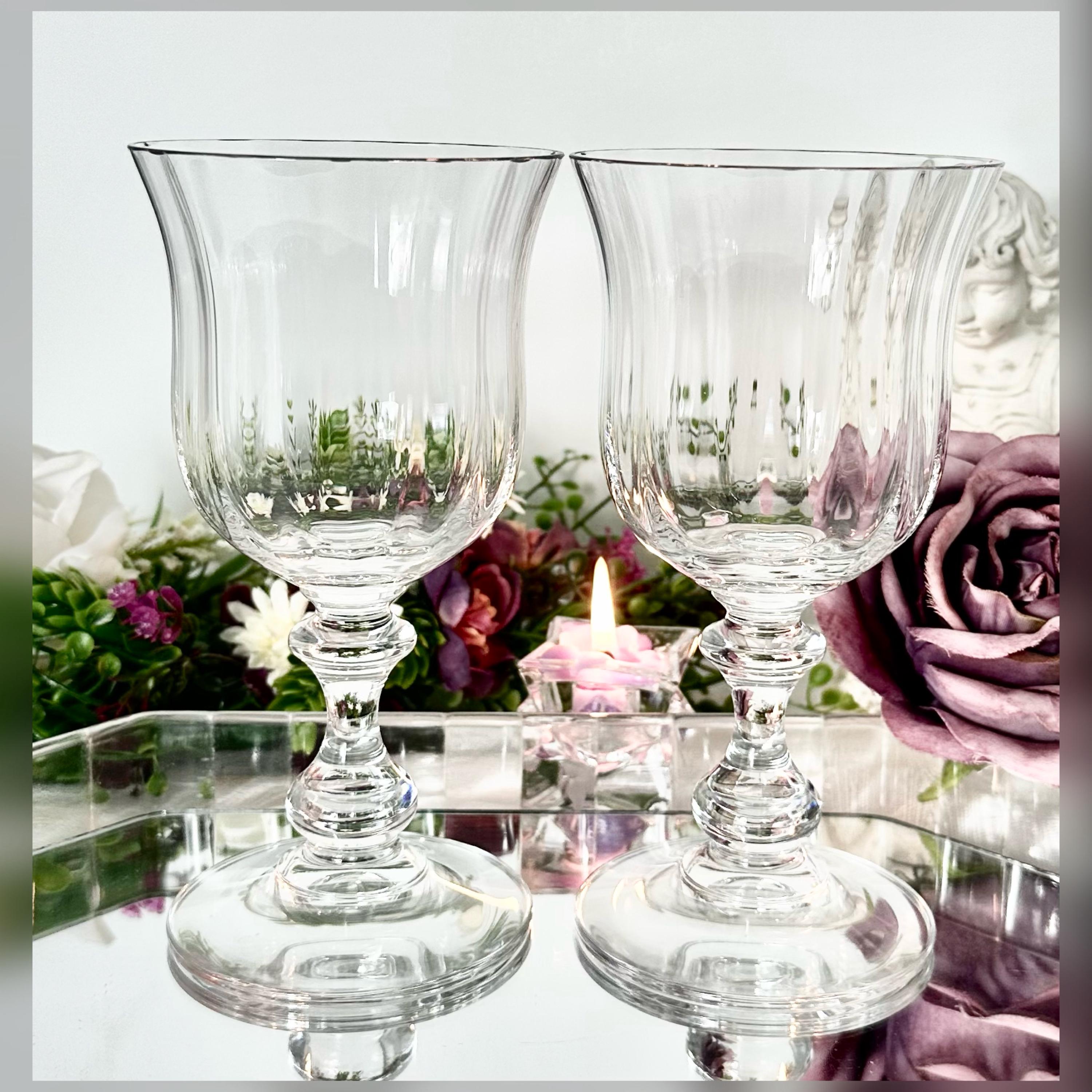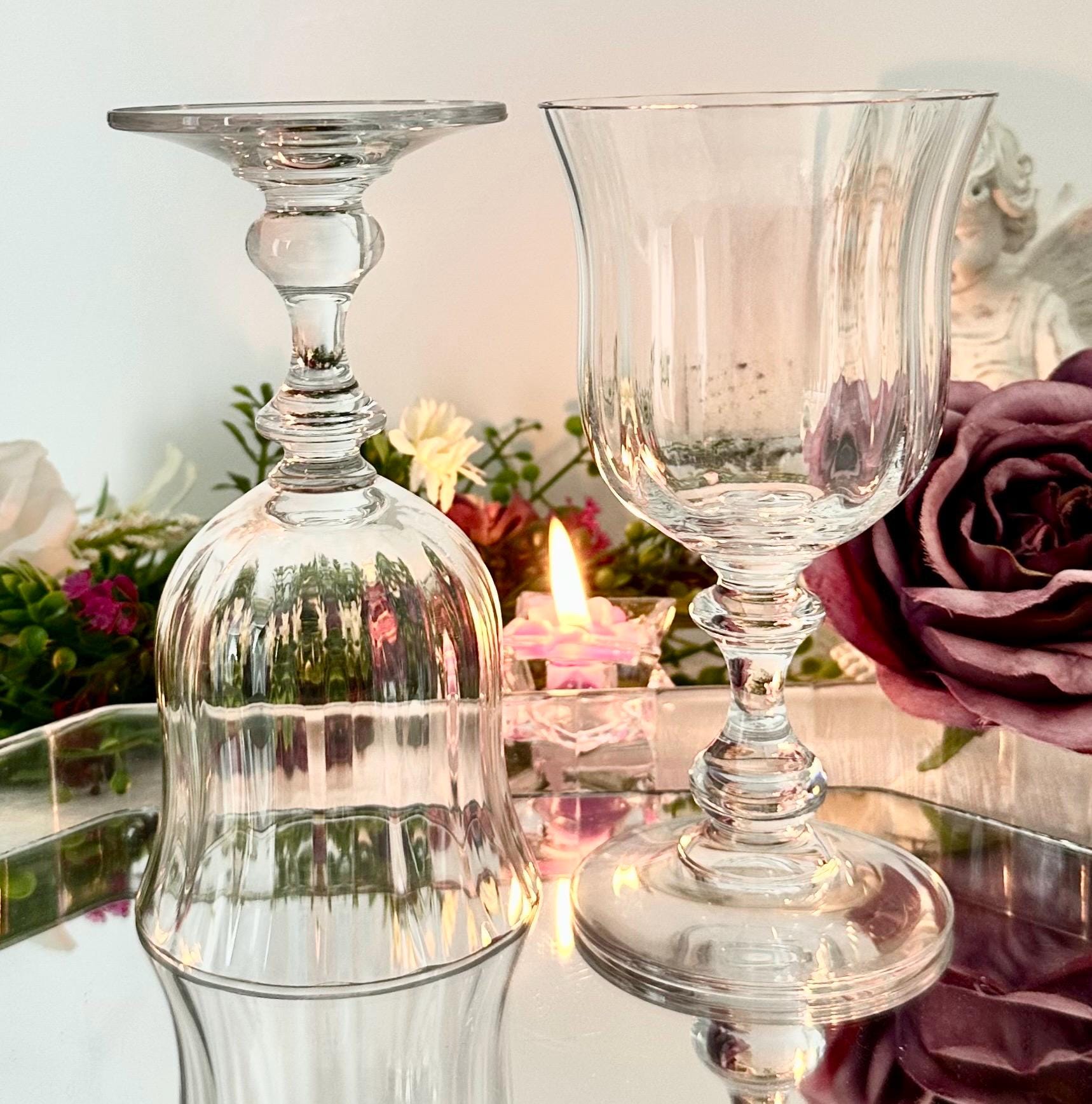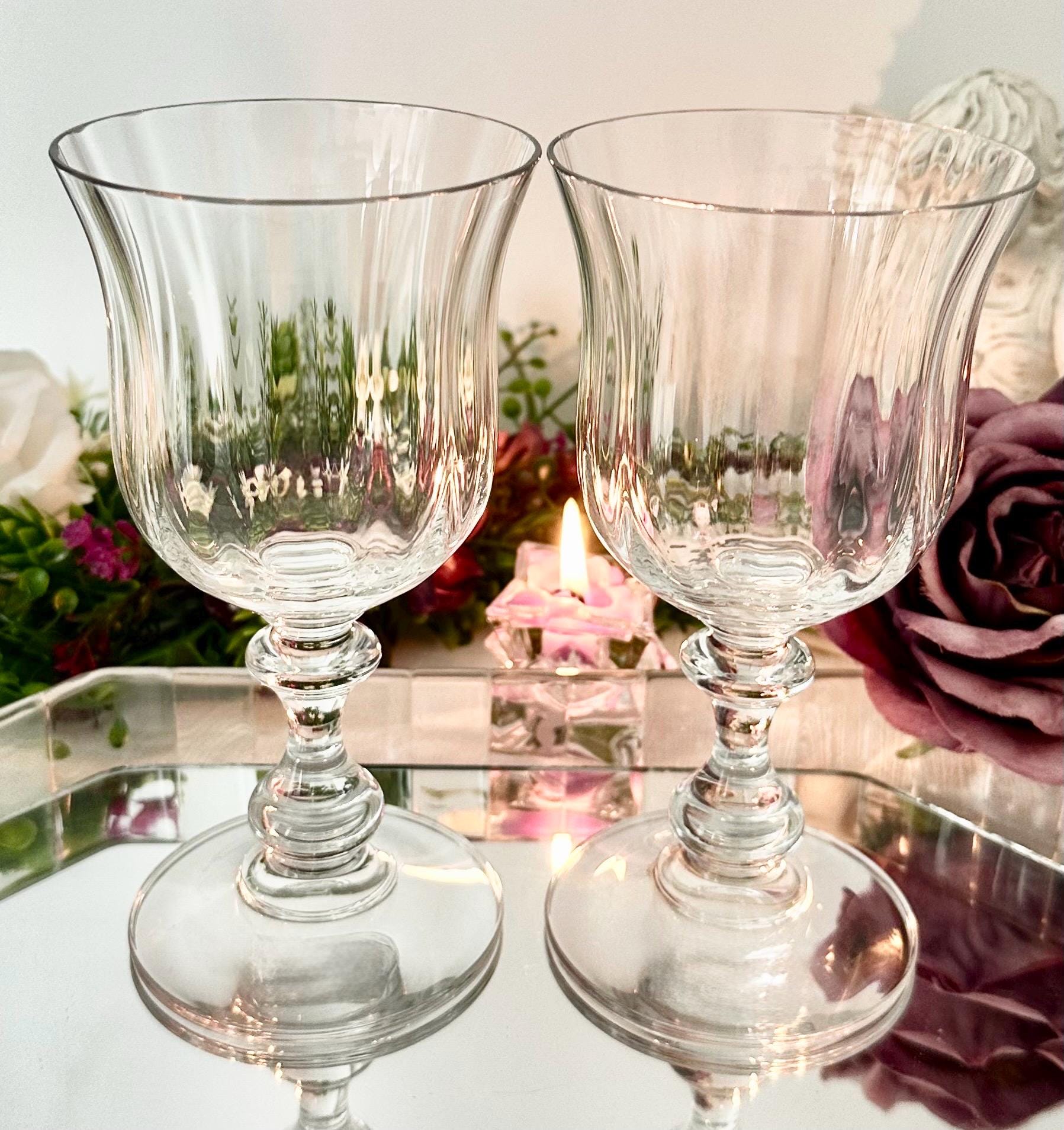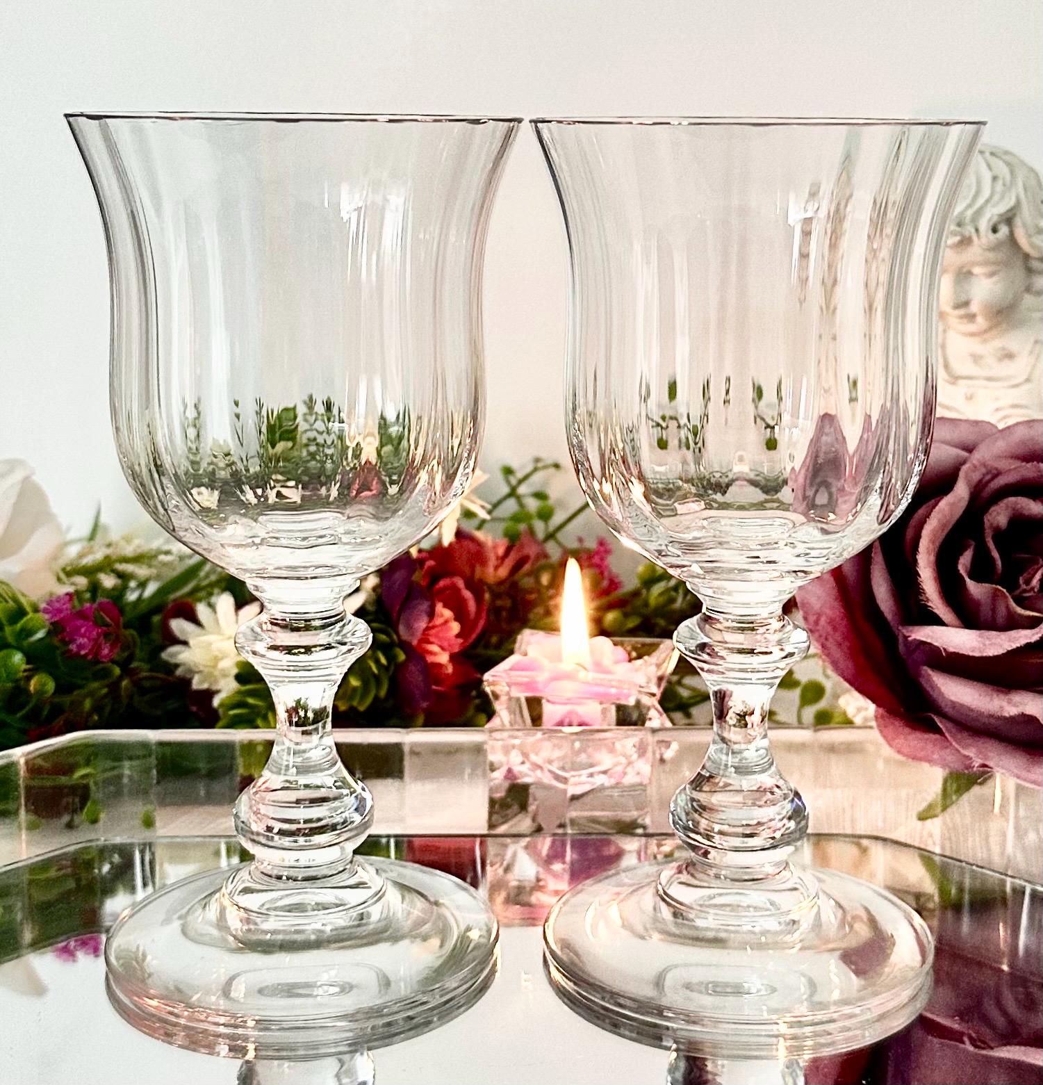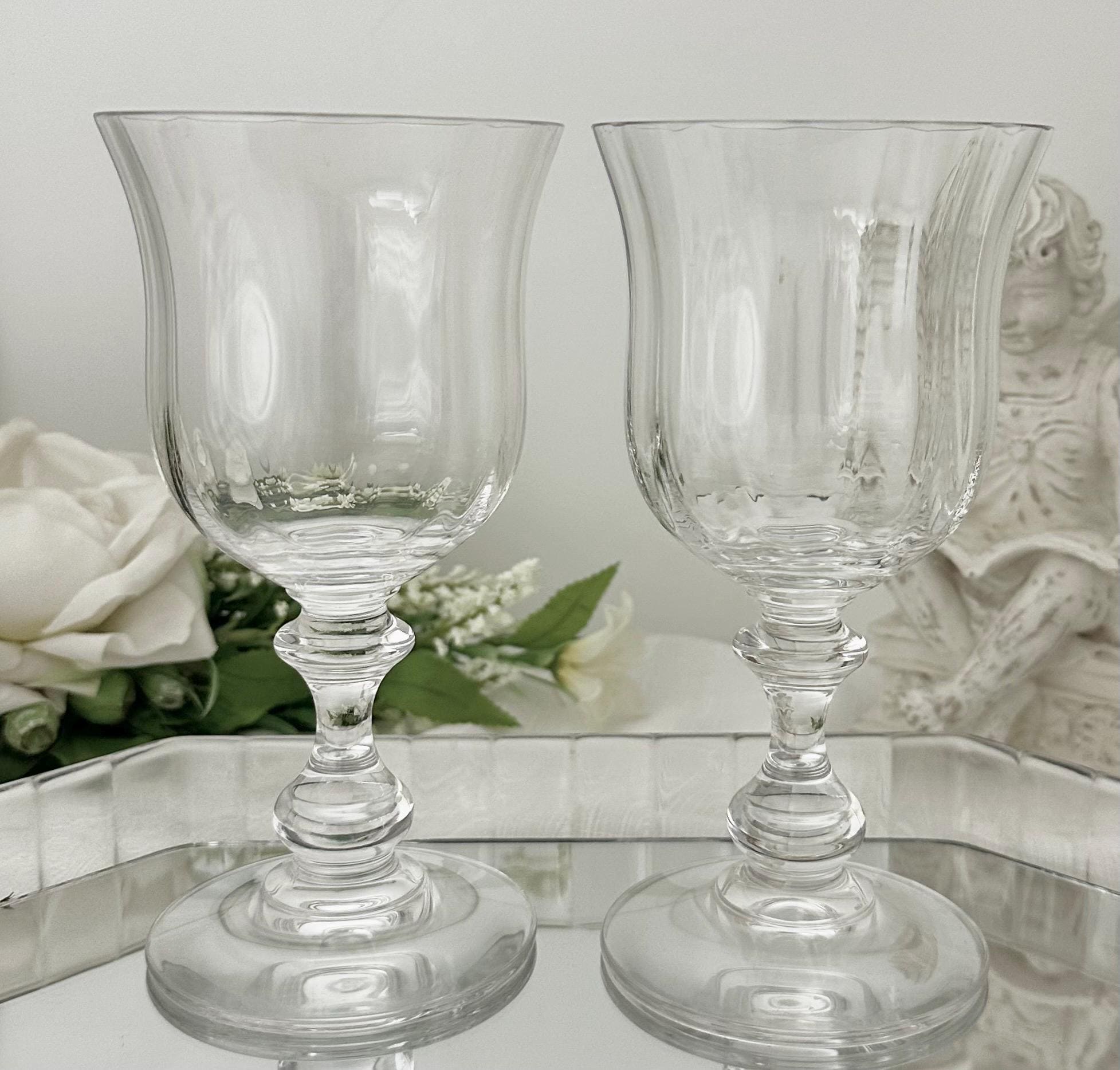 This is for a set of 2 lovely Wine glasses by Mikasa in the French Countryside pattern. These are in the Wine glass size, but are also good for any other cold drink like ice tea. These are hand blown glasses with a clear optic bowl and have no trim but a wonderful decorated stem with a "wafer" and a "ball" in the design with a plain foot. They were produced from 1990 to 2016 and measure 6 3/4 tall by 3 1/2 in diameter. They are very light reflective and beautiful.