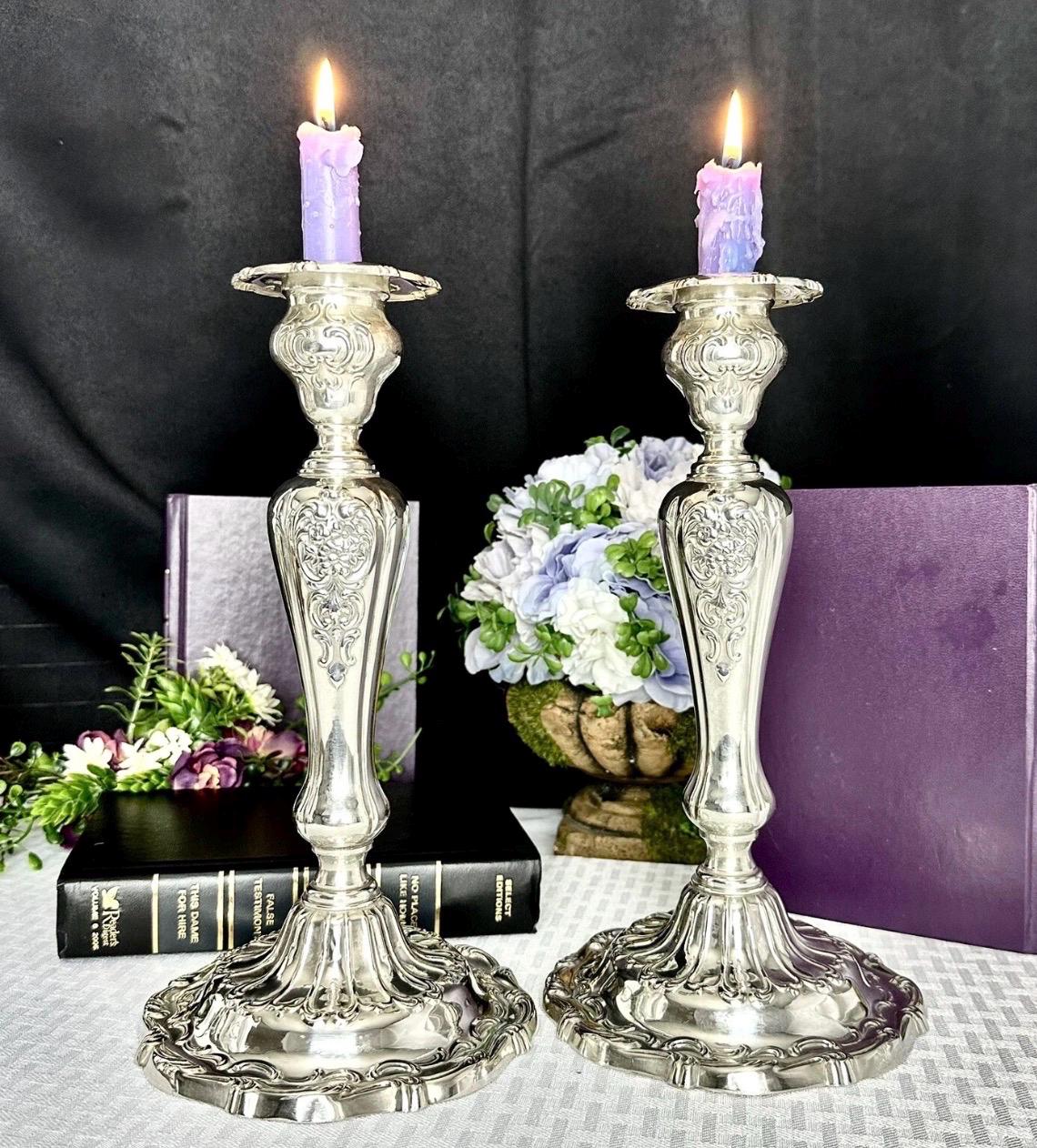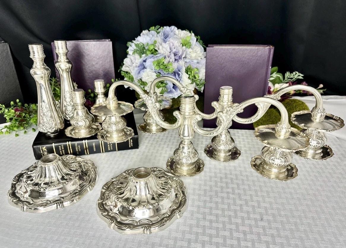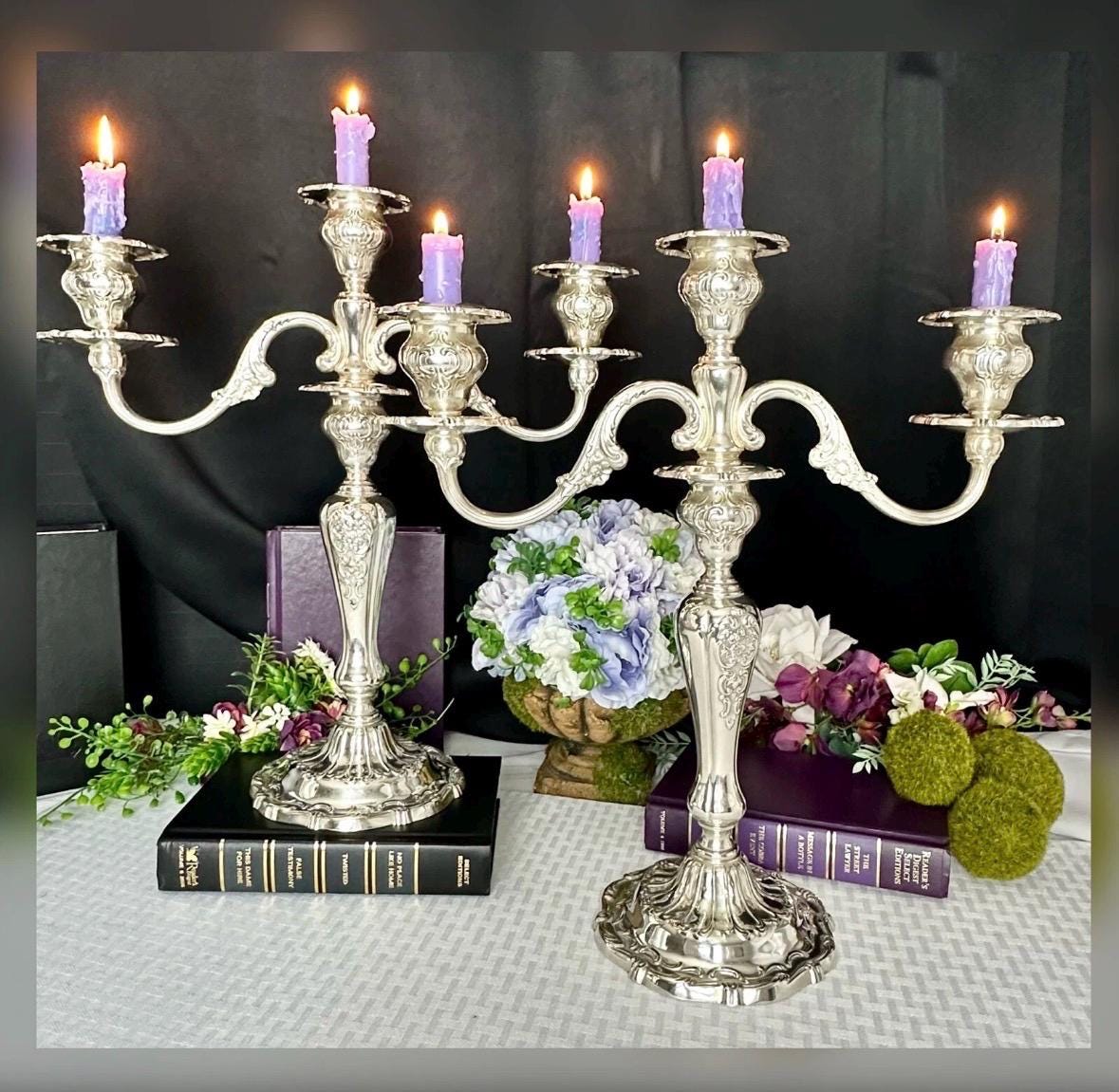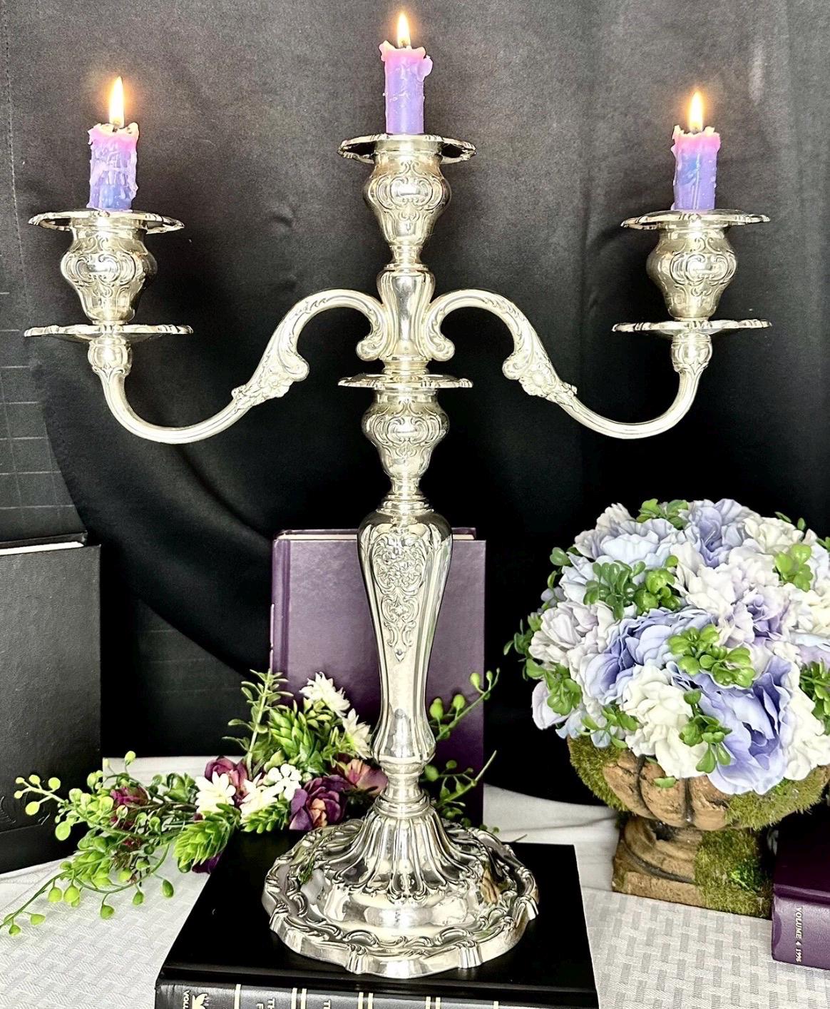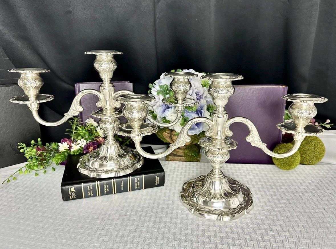 This is for a lovely pair of Vintage Sterling Silver 3 Arm Candelabras. These are from Gorham Silver, in the Louis XV pattern marked #935 and come apart into 4 pieces.