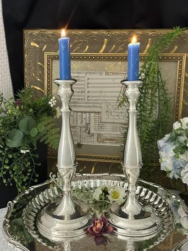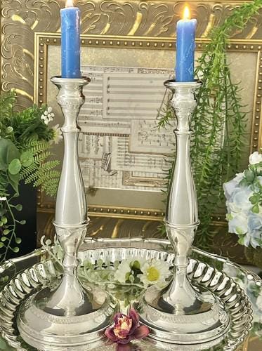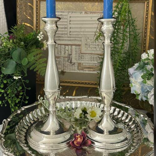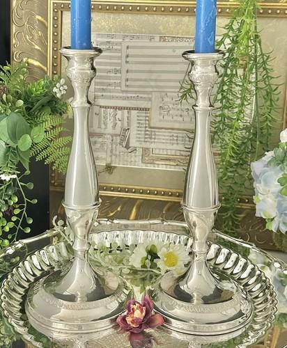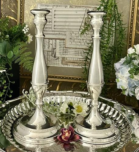 Elevate your home's ambiance with this pair of Sterling Silver Candle Holders, embodying the grandeur of the Victorian era. Their intricate design and lustrous finish reflect light beautifully, creating a warm and inviting atmosphere in any room. Perfect for tall tapers, these candleholders add a touch of sophistication to your dining table or mantlepiece. There is a small pattern on the base and near the rim.