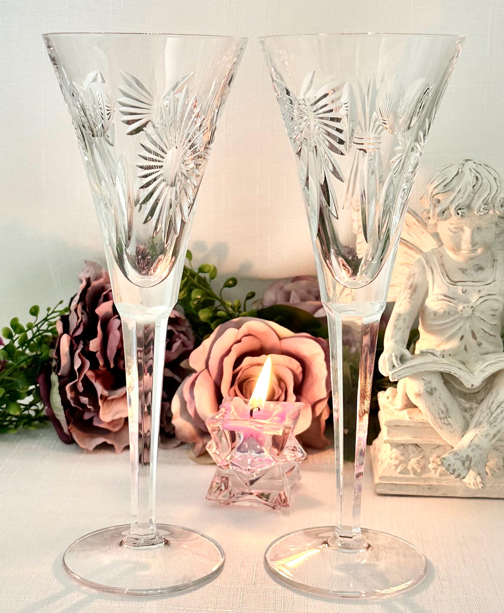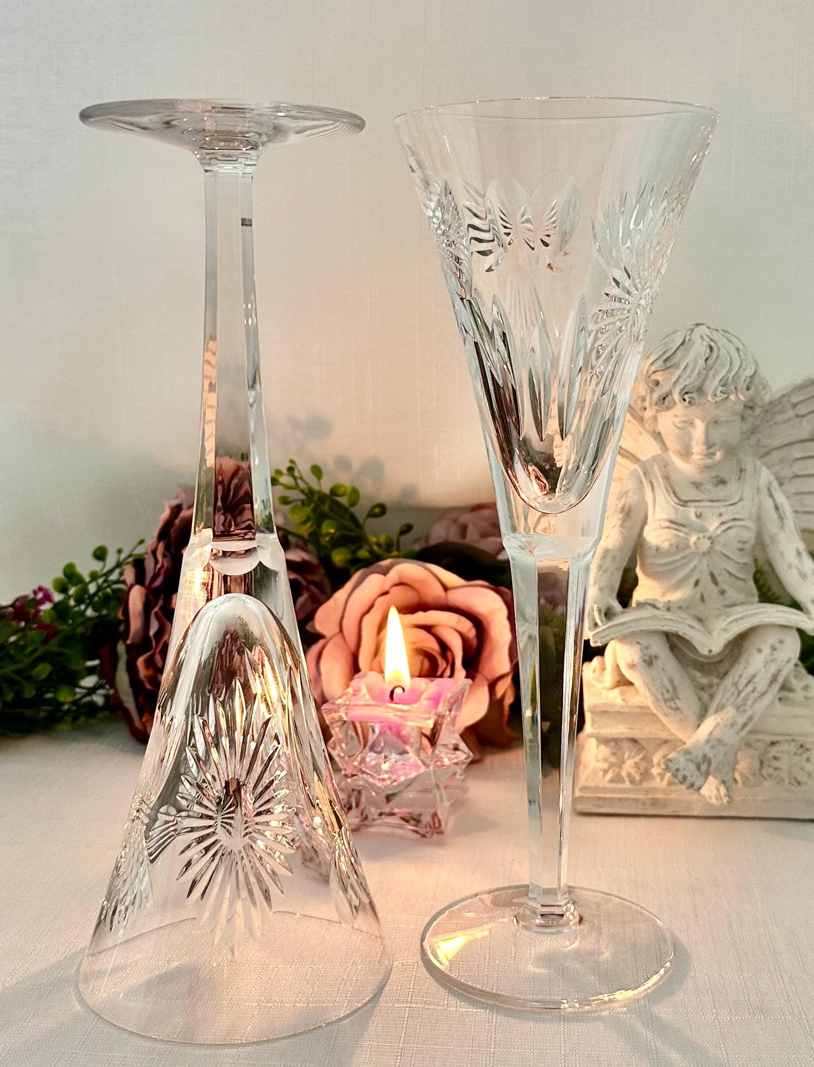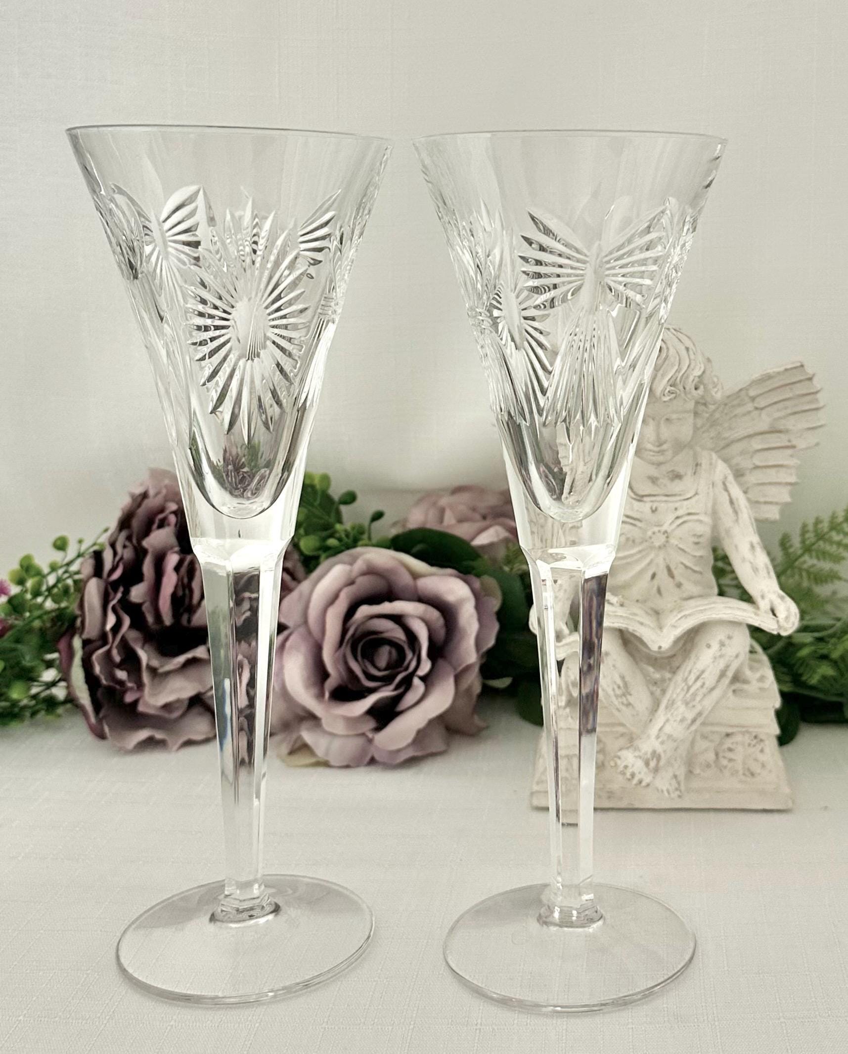 This is for a pair of lovely Waterford Champagne flutes from the Millennium Series in the 5 Toasts pattern. These were crafted in Italy and have wonderful deep pattern on the bowl and then a multisided stem which leads to a pain foot. They have the traditional Waterford frosted name on the bottom. These vintage toasting glasses are perfect for any special occasion from a wedding to a retirement party.