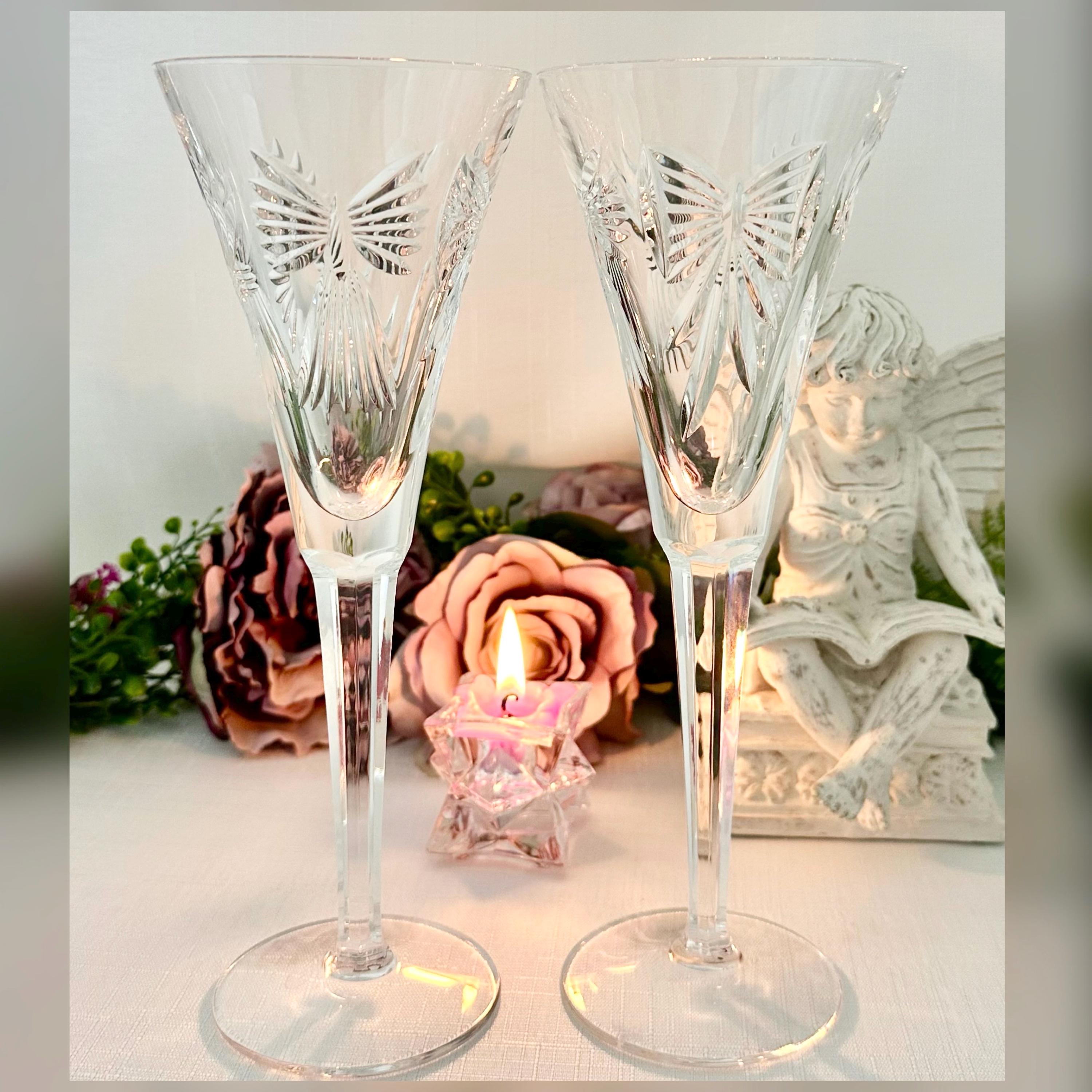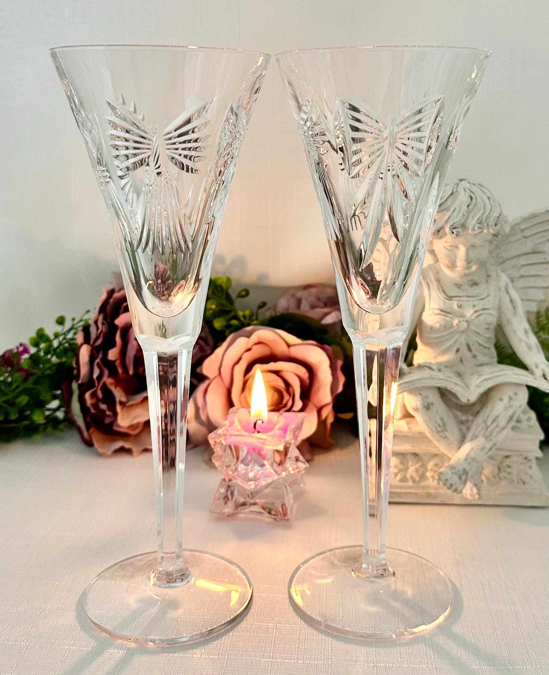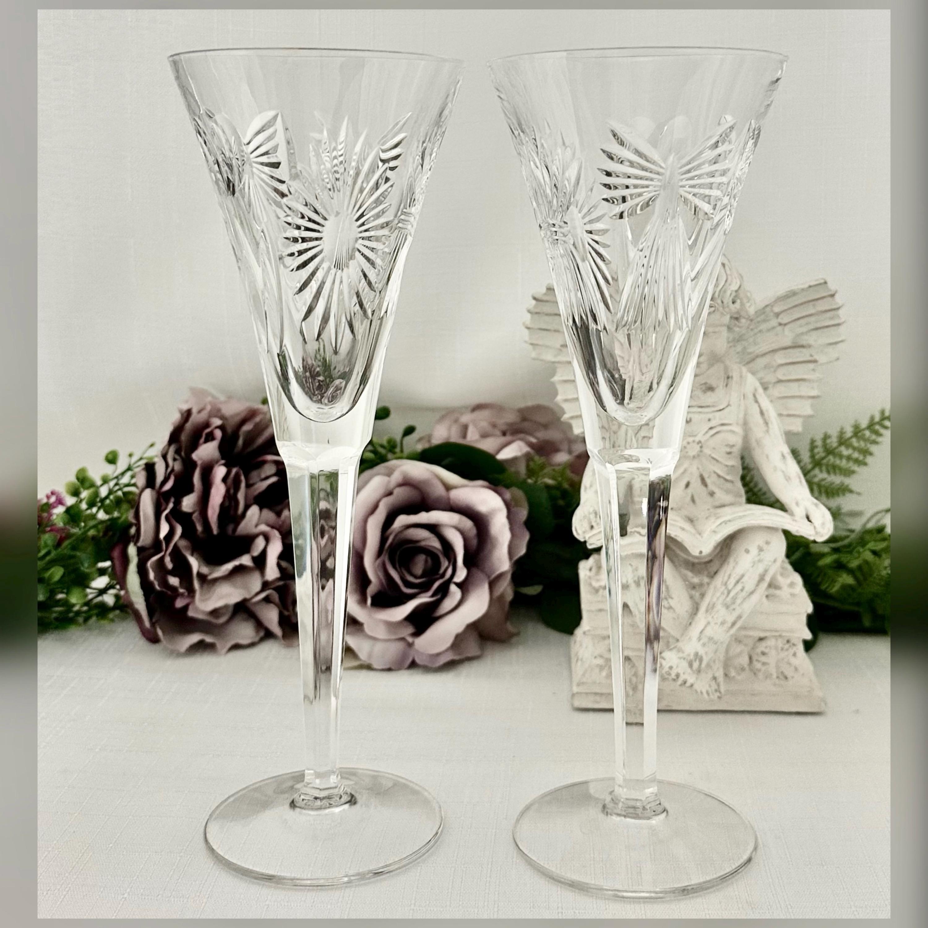 This is for a pair of lovely Waterford Champagne flutes from the Millennium Series in the 5 Toasts pattern. These were crafted in Italy and have wonderful deep pattern on the bowl and then a multisided stem which leads to a pain foot. They have the traditional Waterford frosted name on the bottom. These vintage toasting glasses are perfect for any special occasion from a wedding to a retirement party.