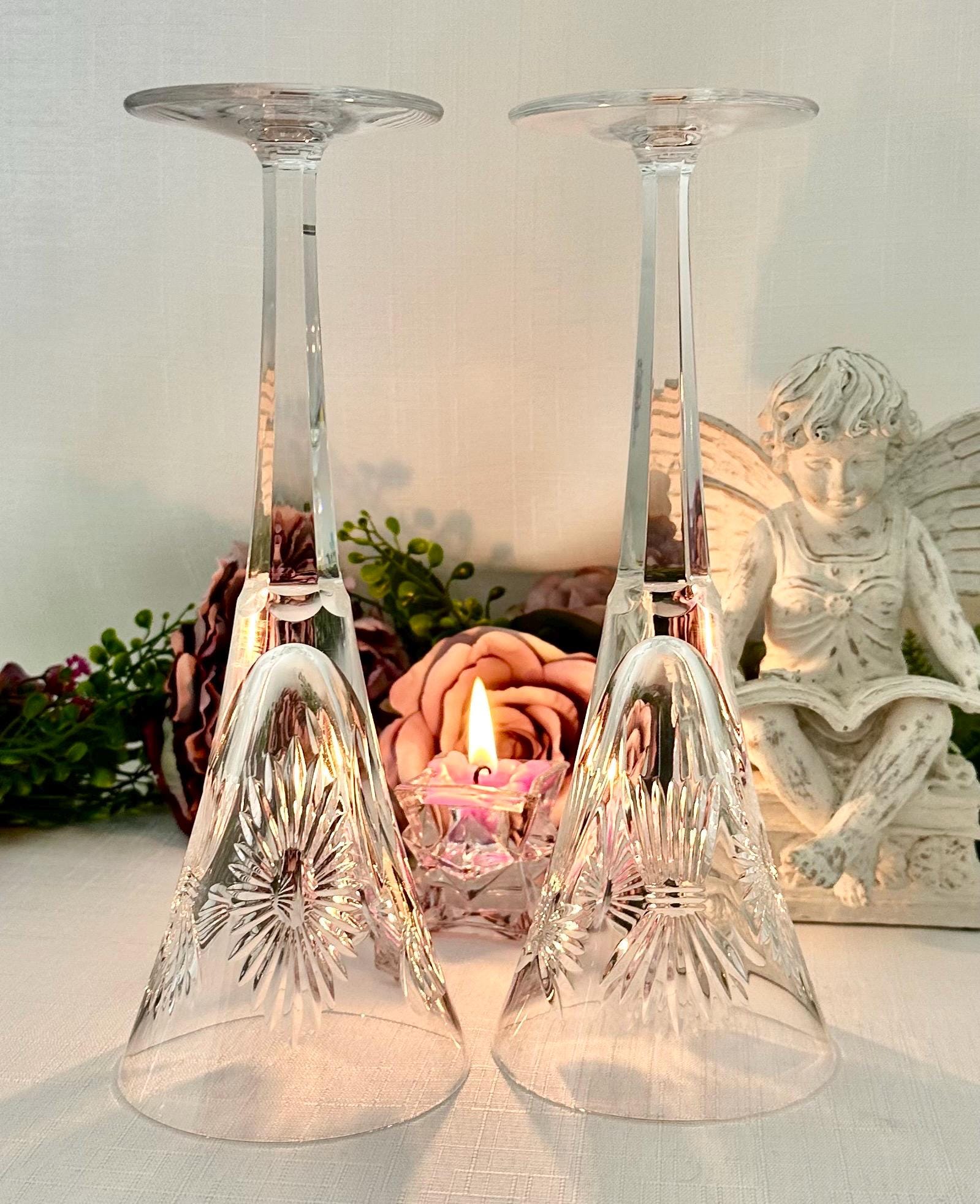 The 5 Toasts champagne glasses are decorated with 5 different patterns for different meanings which are : Health, Peace, Happiness, Love and Prosperity. Note that the glasses have the original Waterford seahorse stickers on them.
