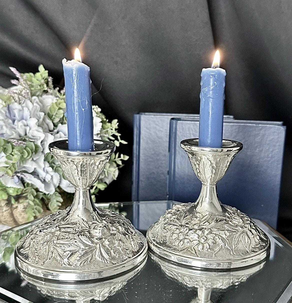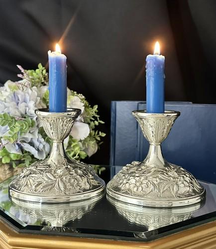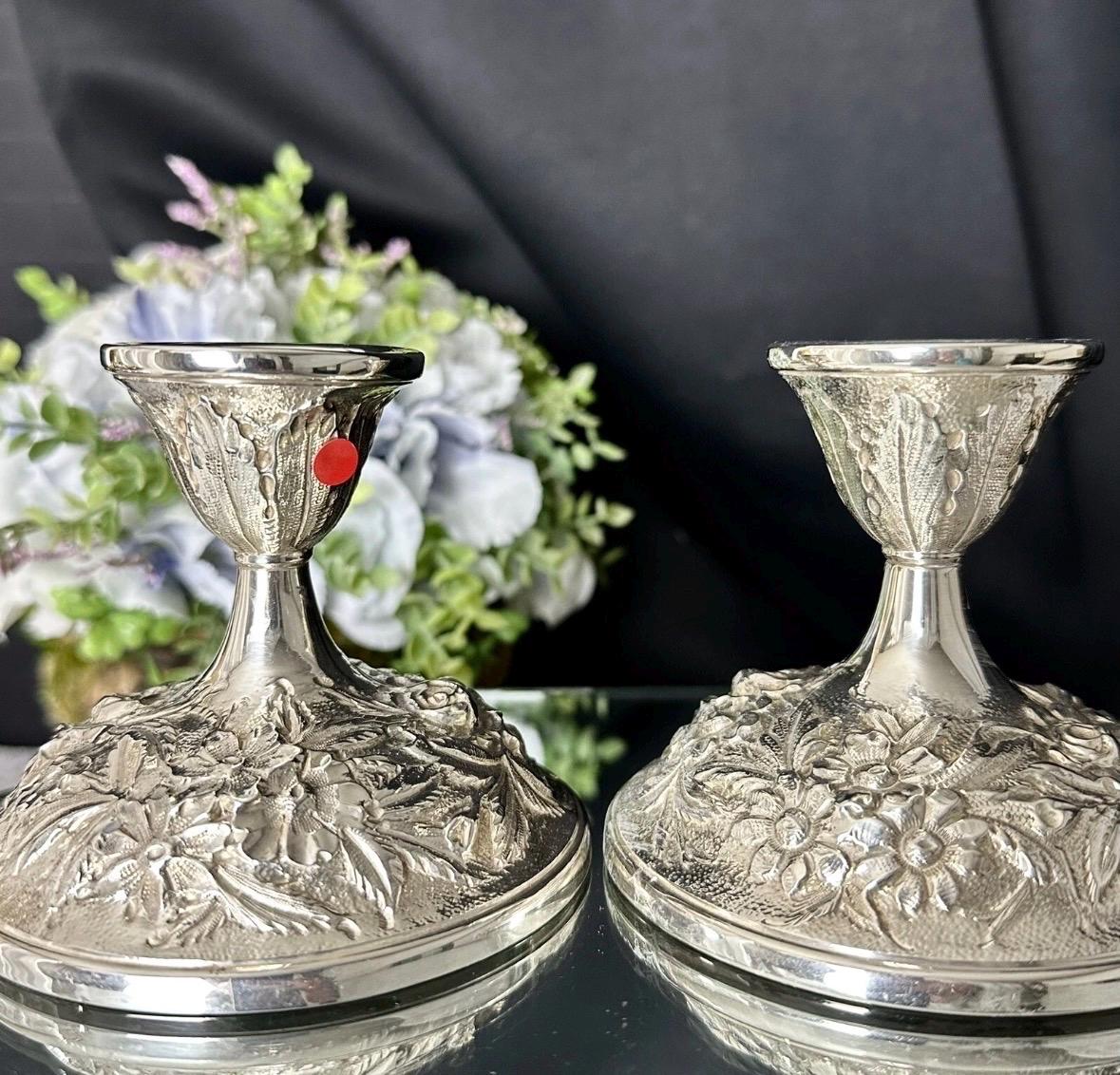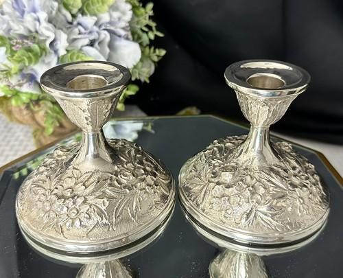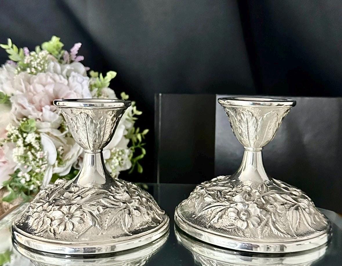 Elevate your home decor with the elegance of S. Kirk & Son Inc. Sterling Silver candle holders. Exquisitely crafted in the USA, these Victorian-style repousse pieces showcase a intricate hand-chased design that brings a touch of sophistication to any setting. These are marked with makers name, Sterling, 118F and Hand Decorated on the foot of each one.