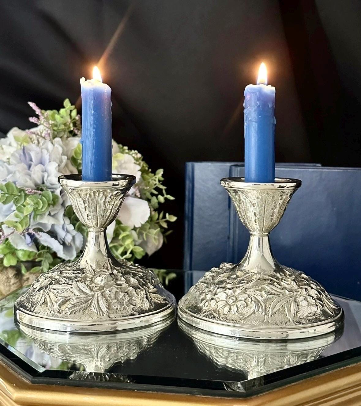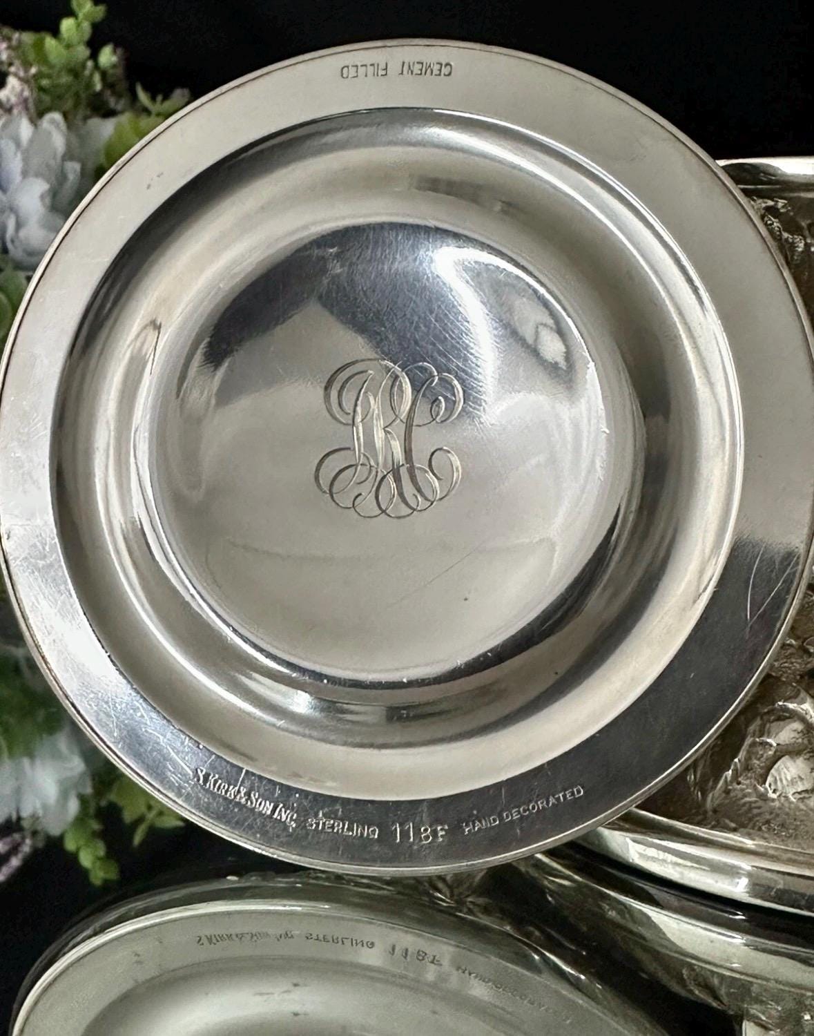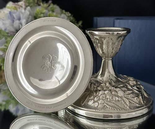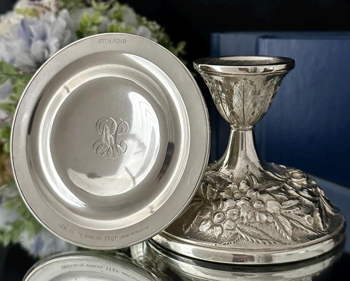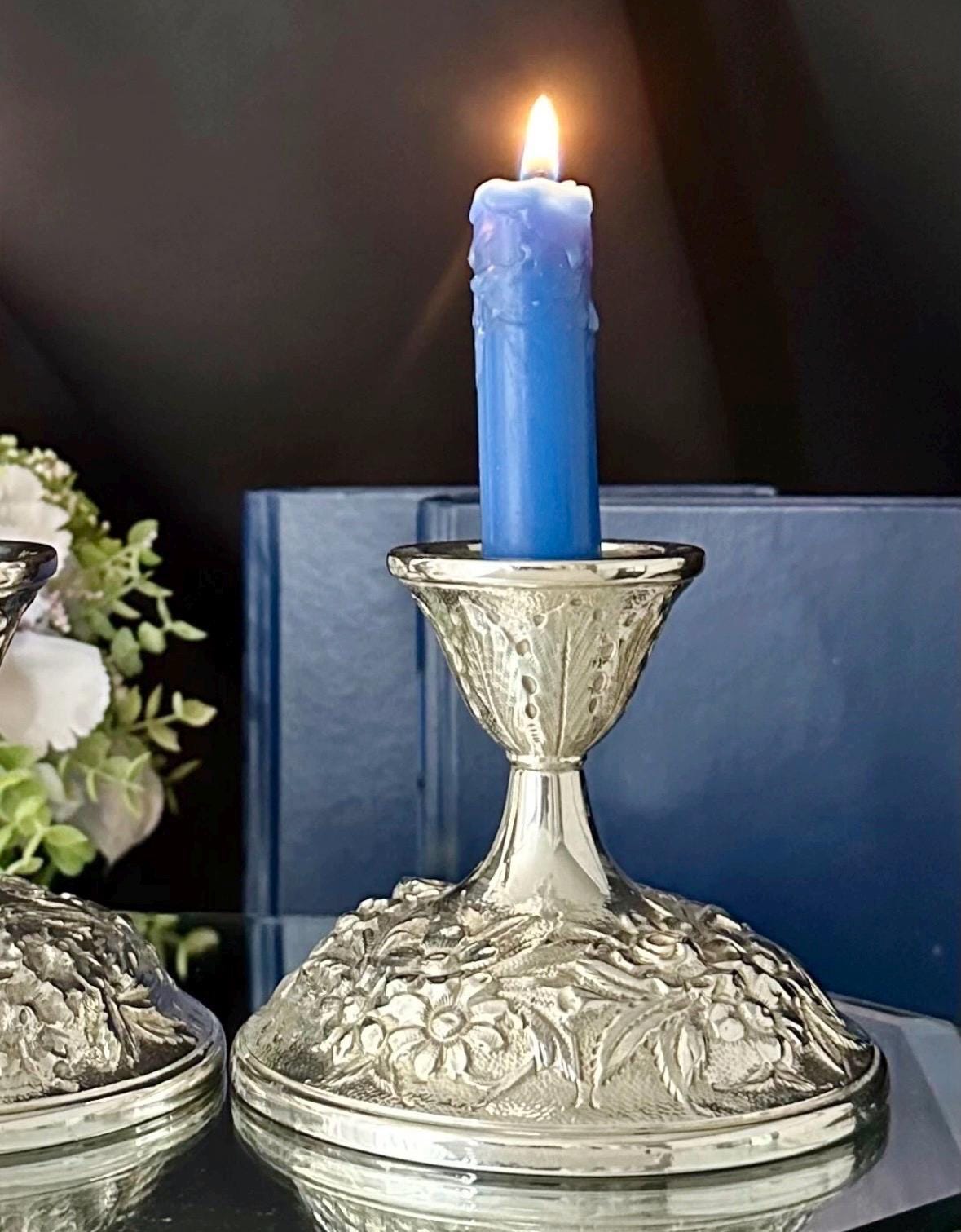 Elevate your home decor with the elegance of S. Kirk & Son Inc. Sterling Silver candle holders. Exquisitely crafted in the USA, these Victorian-style repousse pieces showcase a intricate hand-chased design that brings a touch of sophistication to any setting. These are marked with makers name, Sterling, 118F and Hand Decorated on the foot of each one.
