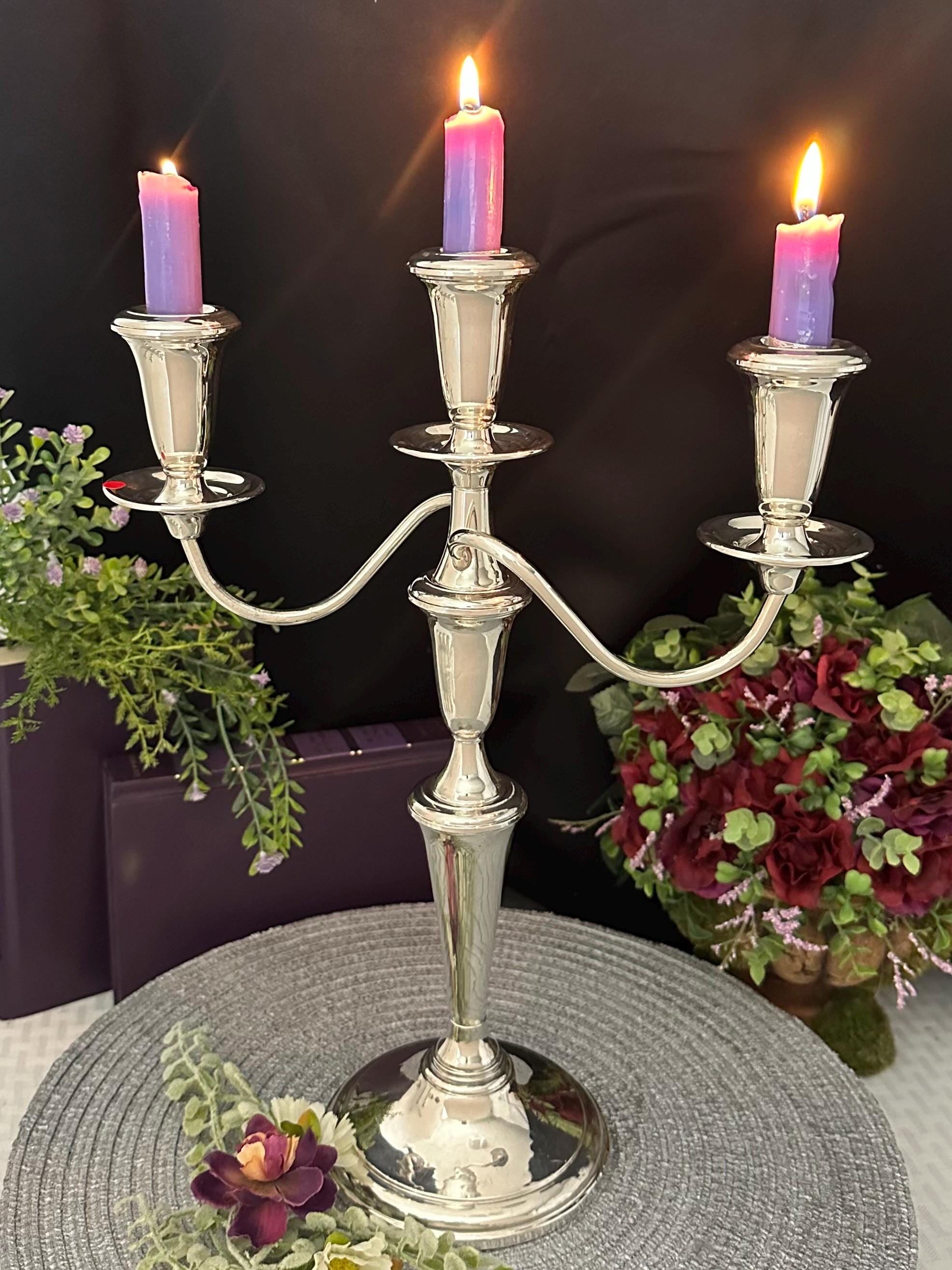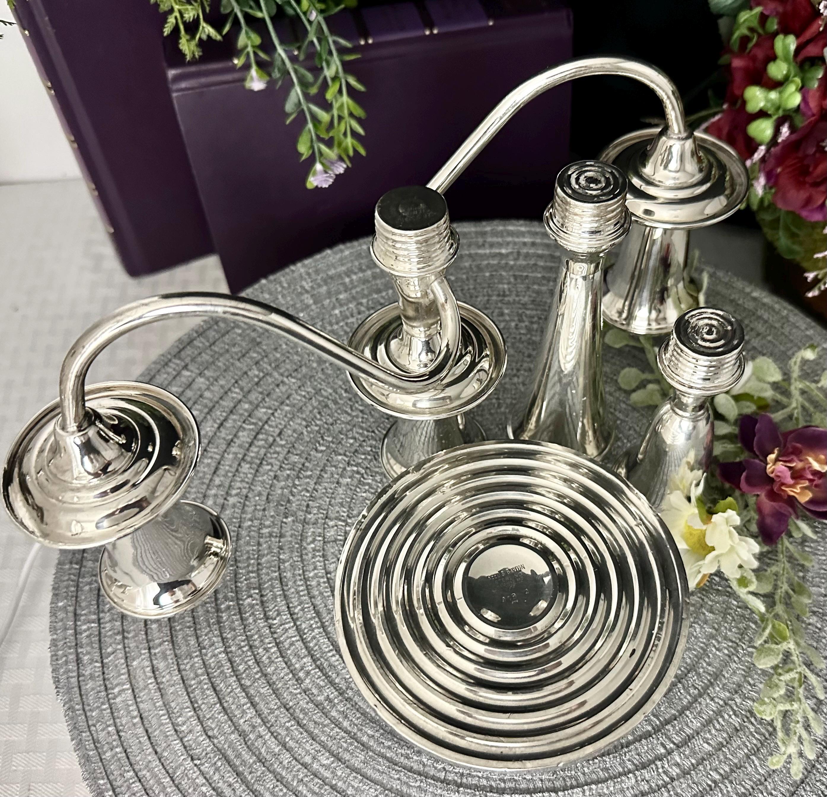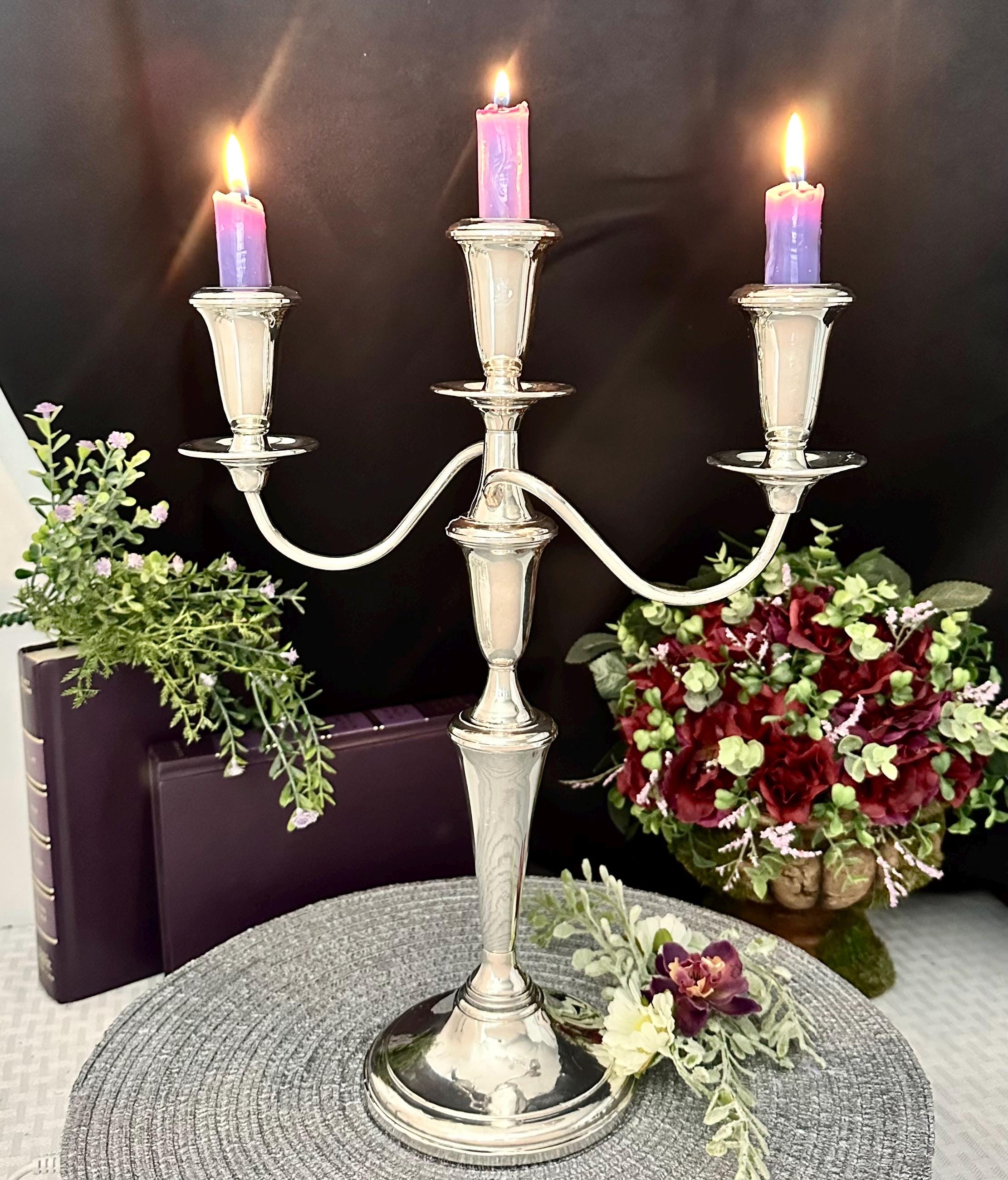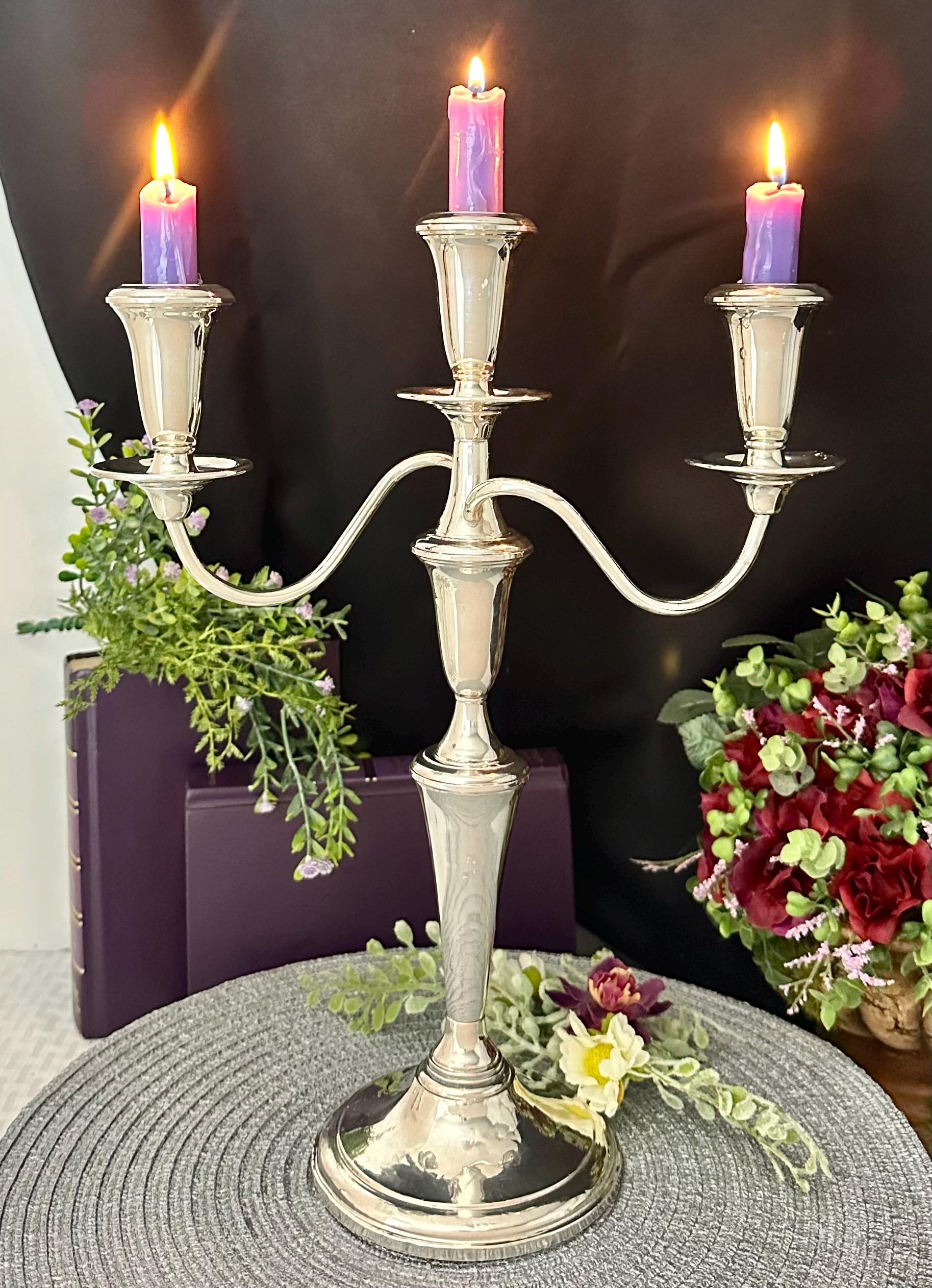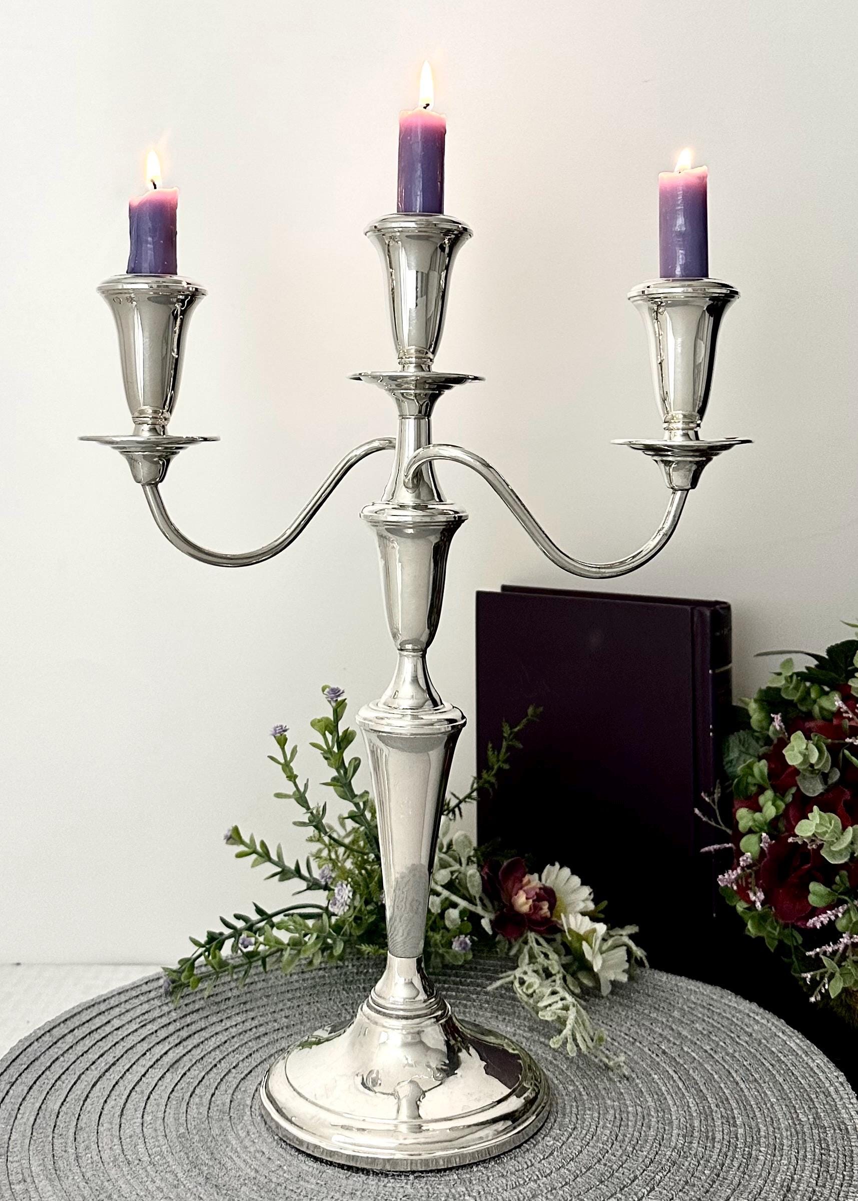 This is for a convertible Vintage Reed and Barton Sterling Silver Candelabra. This has candle cups on all the holders and slightly twisted arms, While it holds a total of 3 candles. This sterling silver candle holder measures: 14 inches tall x 11.5 inches wide x 4.5 inches deep. This can be used in many configurations from single taper holders to holding 3 candles. There are 4 pieces total used to make the tallest largest configuration.