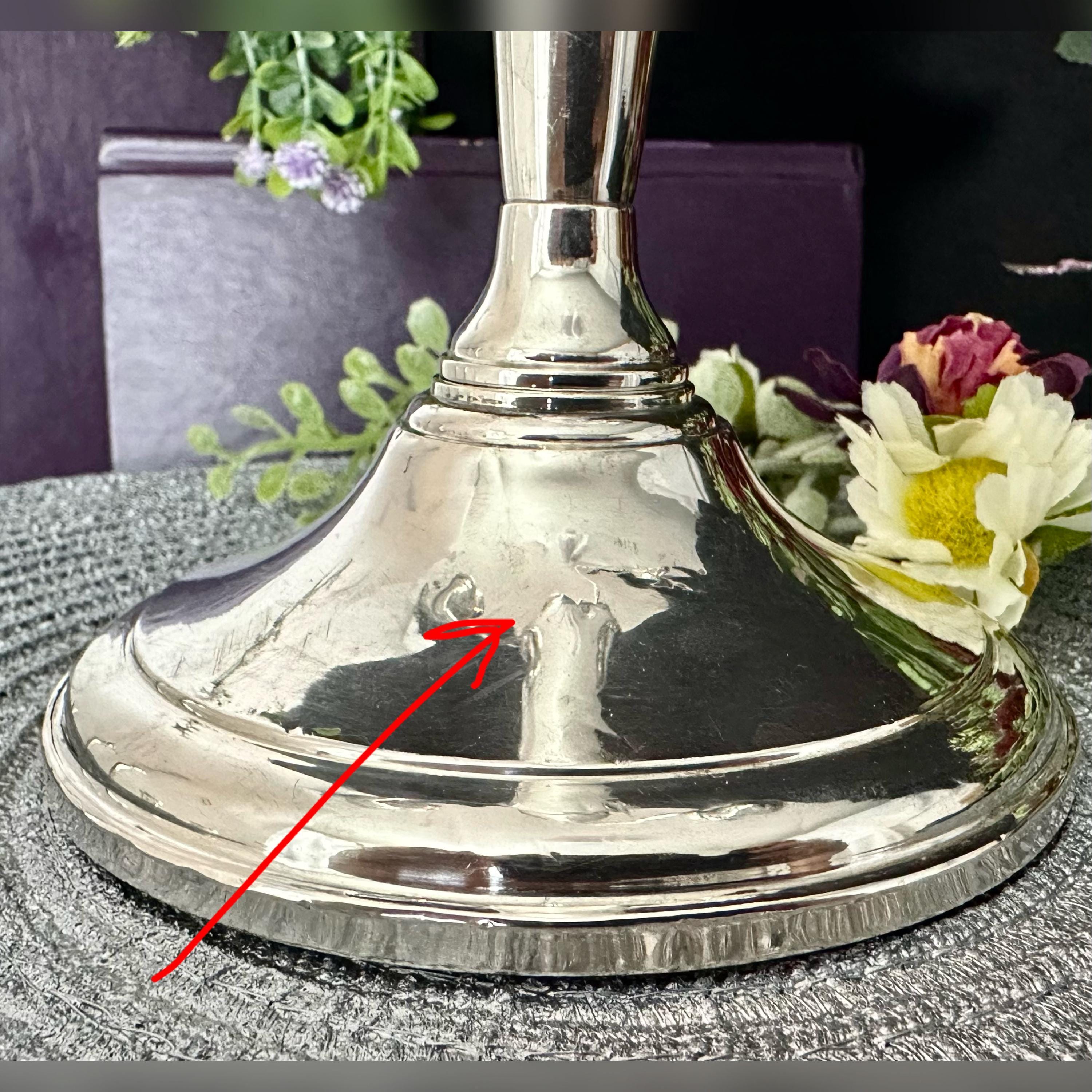 This is weighted and reinforced along with marked on the base with the makers name and 14. There are slight imperfections on the base and one of the candle cups - shown in close up pictures with the red arrows, no other issues noted and in nice condition.