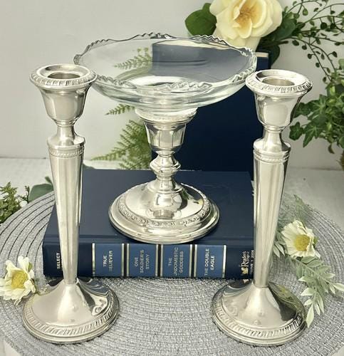 This is for 3 Vintage Sterling Silver candle holders by Crown Silver and Whiting Silver. All are crafted with a Victorian vintage styling. All 3 pieces are Crafted with .925 sterling silver. These console silver candlesticks are perfect for adding a touch of elegance to any space or dining table while the glass bowl can hold candles, candy to flowers. The glass bowl is removable so the third candle holder can also hold a taper dinner candle.