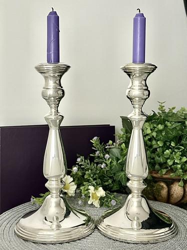 This is for a pair of Sterling Silver Candle Holders by Empire Silver Co. These vintage silver candlesticks are designed with a classic Empire pattern. Made from high-quality sterling silver, these candle holders have a diameter of 5 inches and a height of 10 inches, making them a substantial and stylish addition to any room.