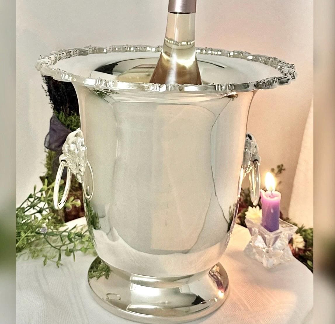 This is for a lovely Leonard Silver Company Vintage Silver plated Champagne Bucket / Ice Bucket or Wine Chiller. This Silver Urn has wonderful lion handles with a ring in the mouths, has a decorated rim and a solid foot. This will make for a lovely Wedding Gift or a beautiful decoration for the home as perhaps used as an Urn for holding fresh flowers, as a centerpiece or used as a Trophy.