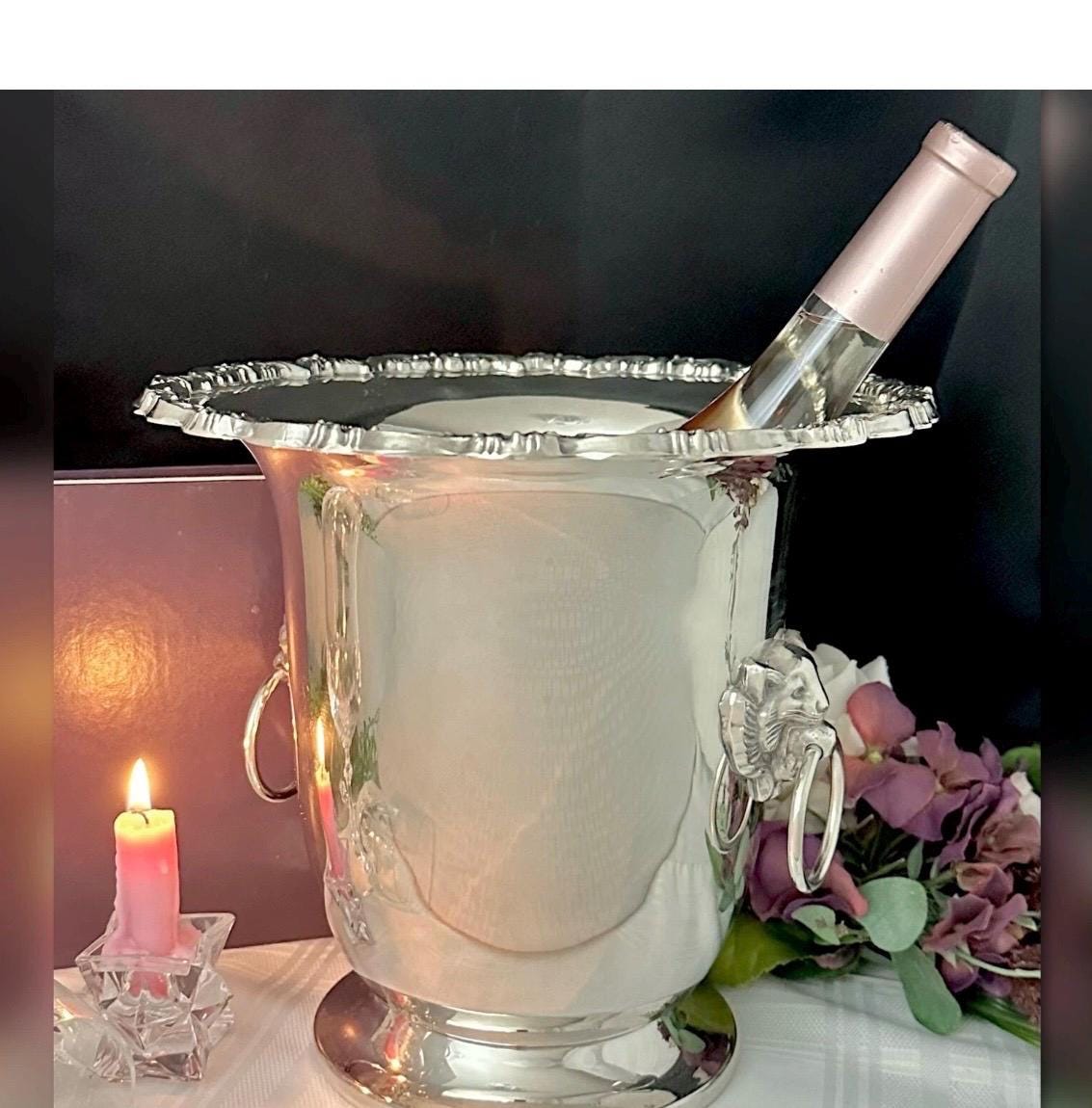 This large champagne bucket is polished and very shiny and ready to use and display along with being enjoyed for years to come. The inside of the piece is also in lovely condition. To keep in this wonderful condition always dry after use to keep from spotting.