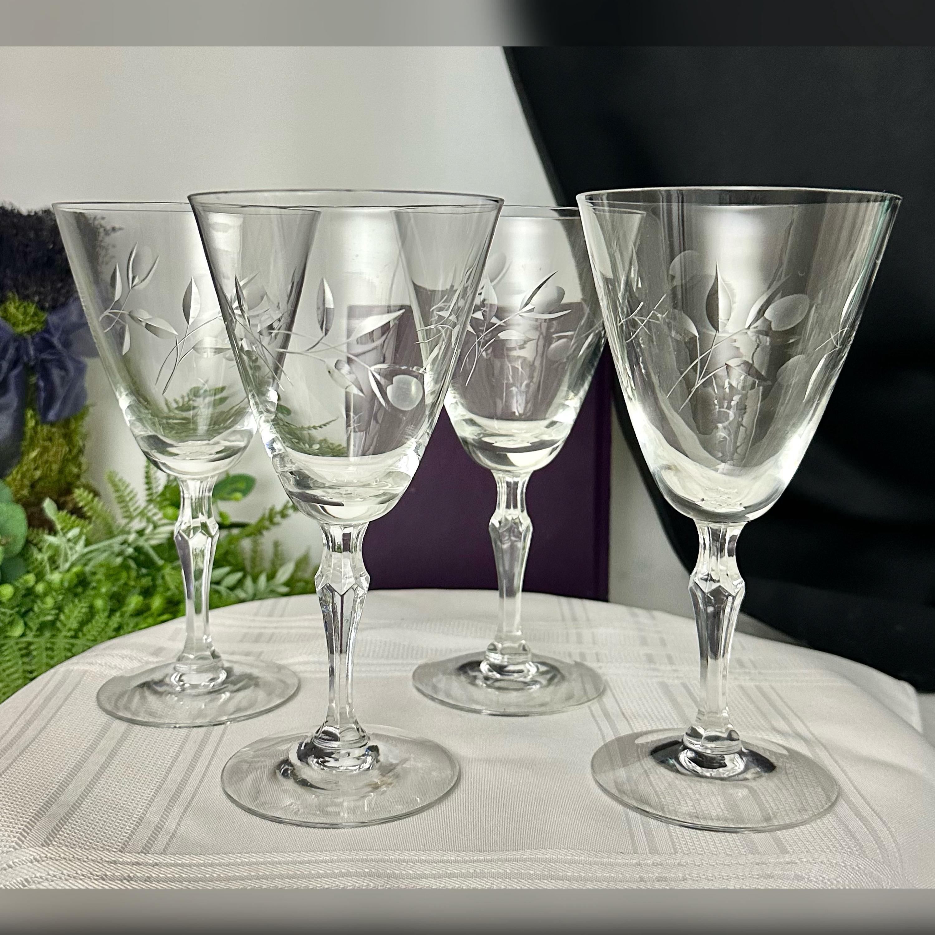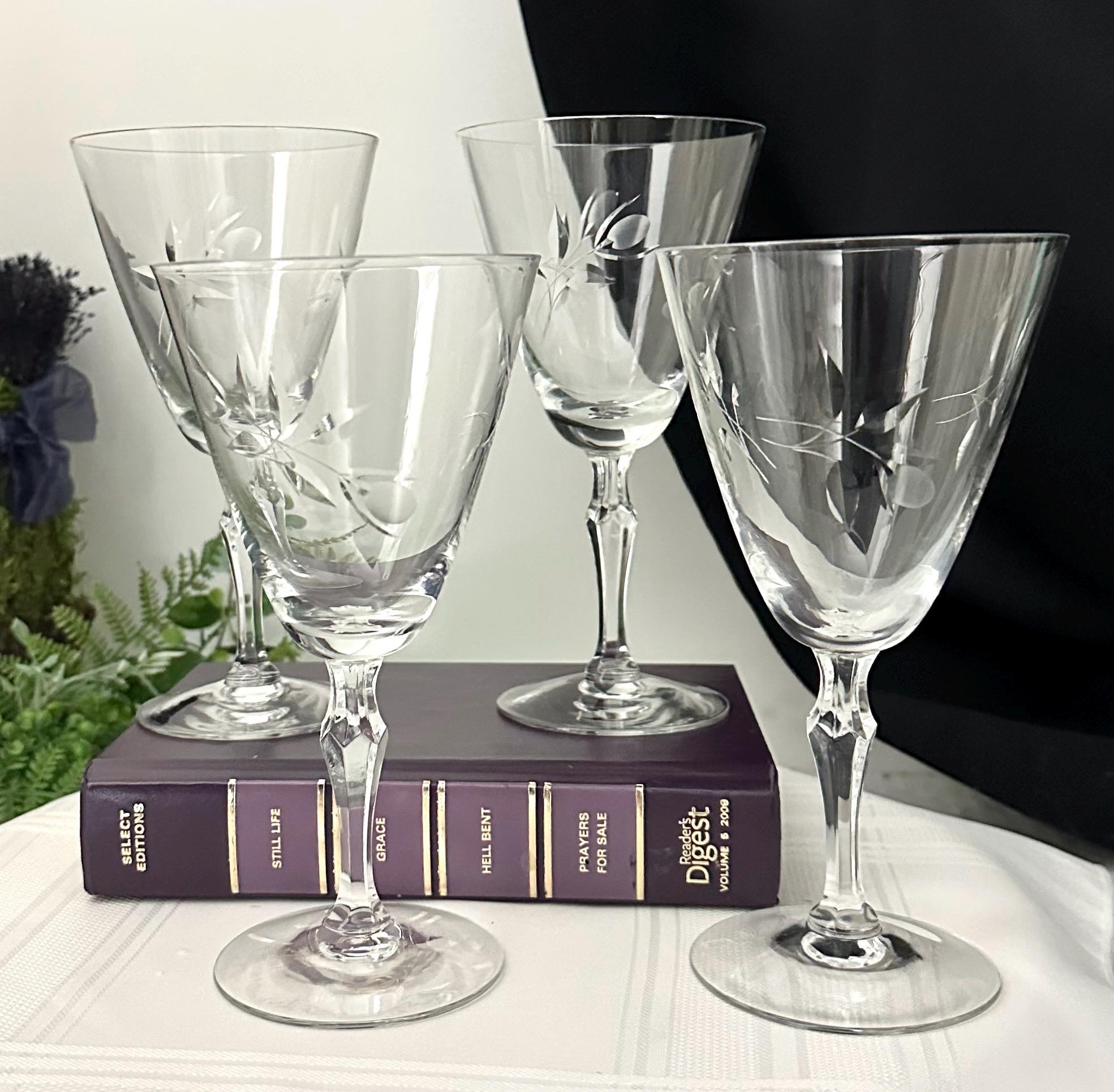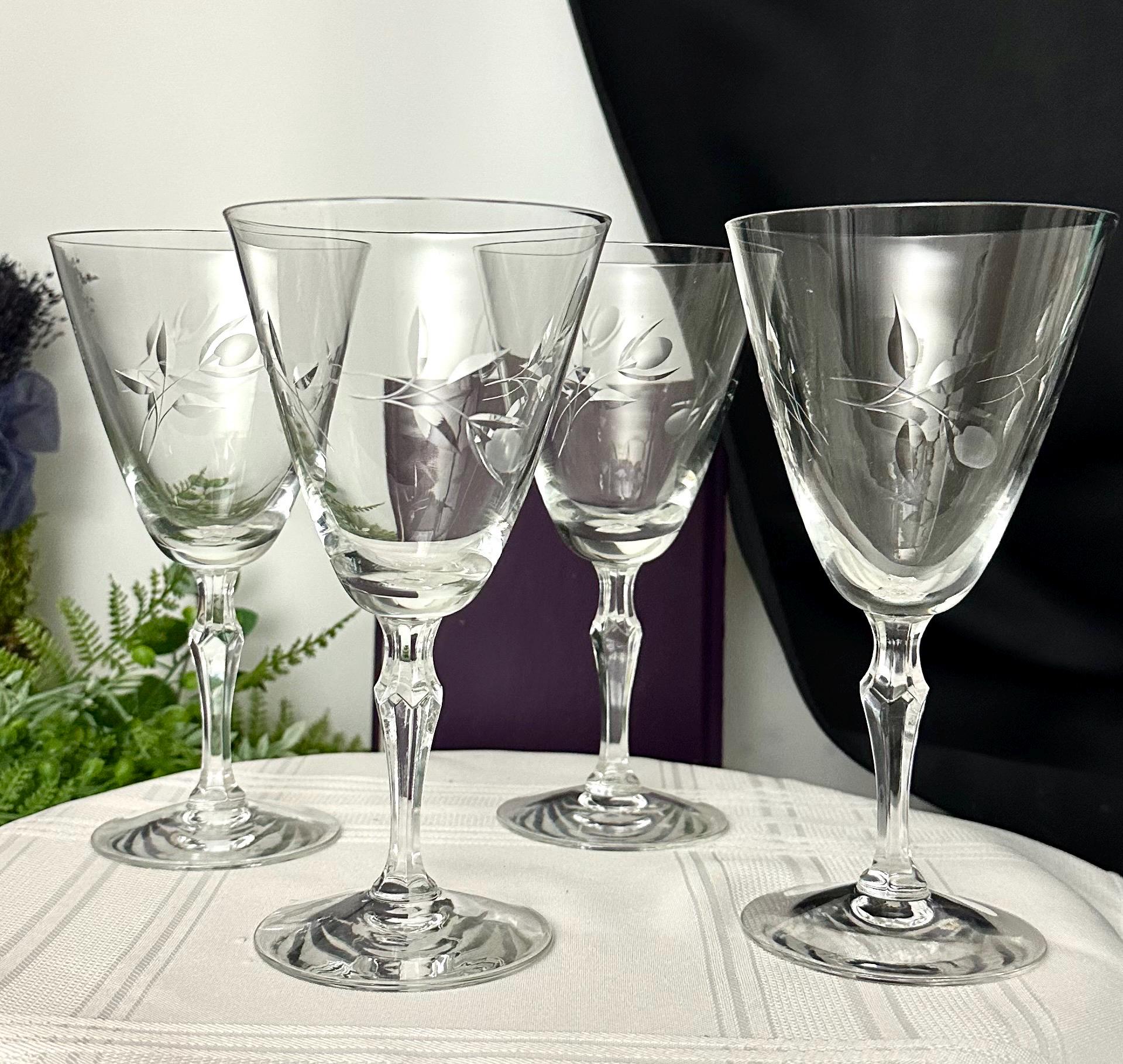 This set of four Fostoria Sweetheart Rose Water Glasses from the 1960s features a beautiful etched rose design on clear glass goblets. The round-shaped glasses stand at 7 inches tall with a diameter of 3 5/8 inches, making them perfect for serving cold beverages during various occasions.
