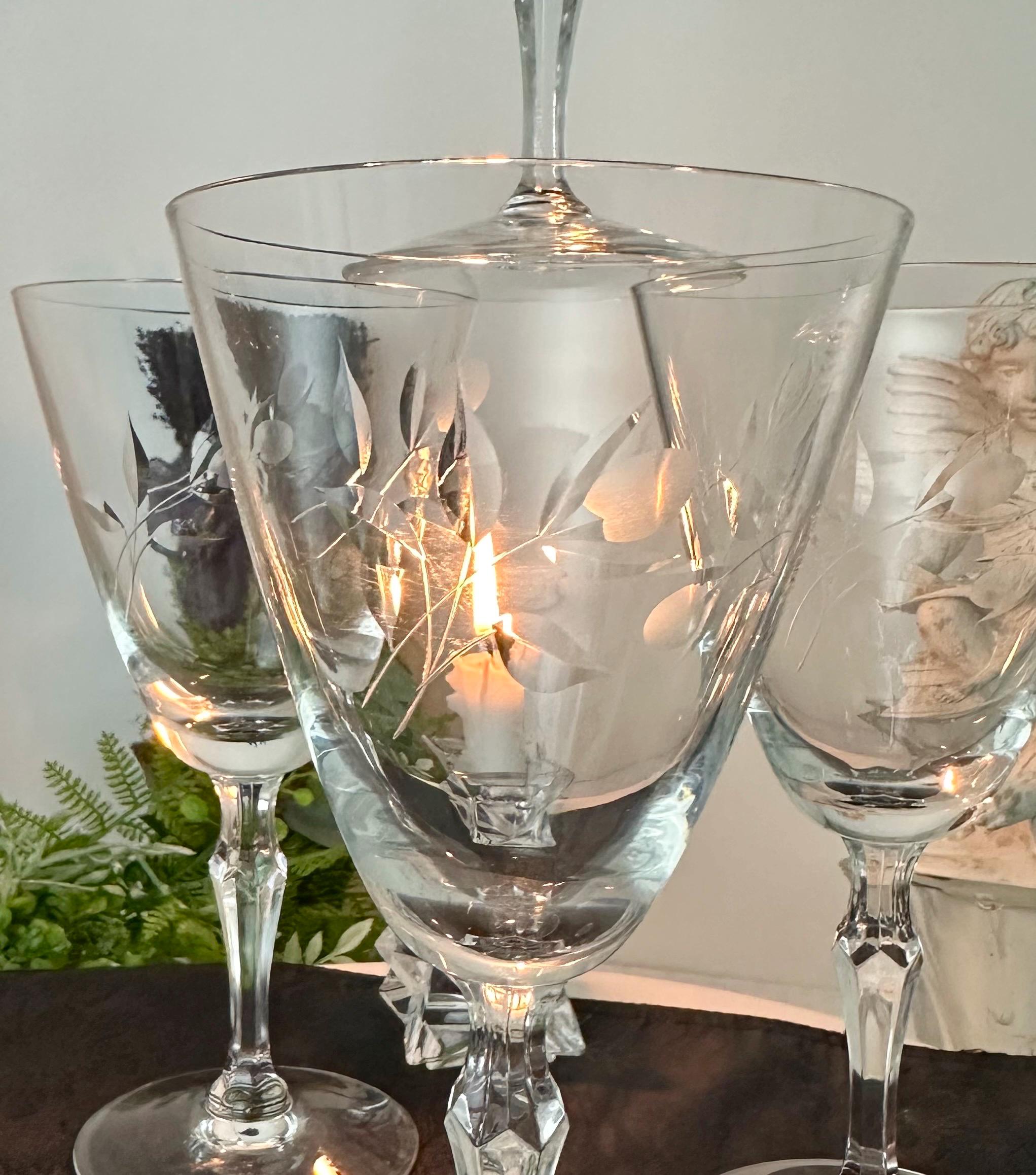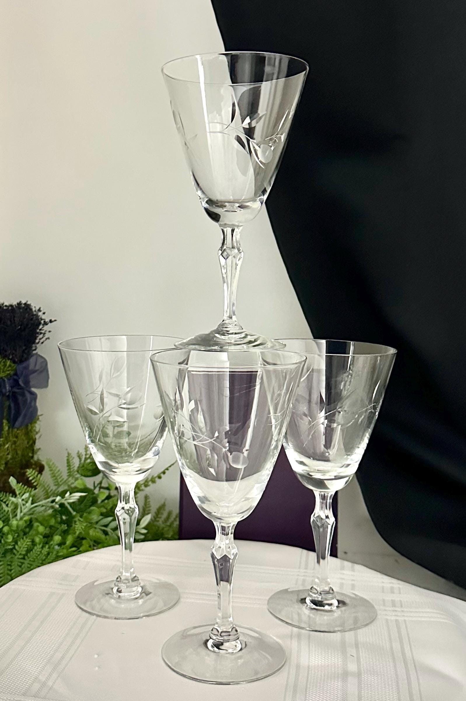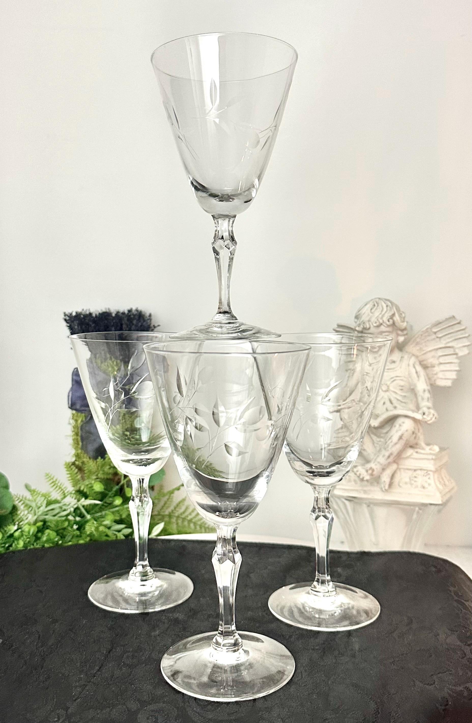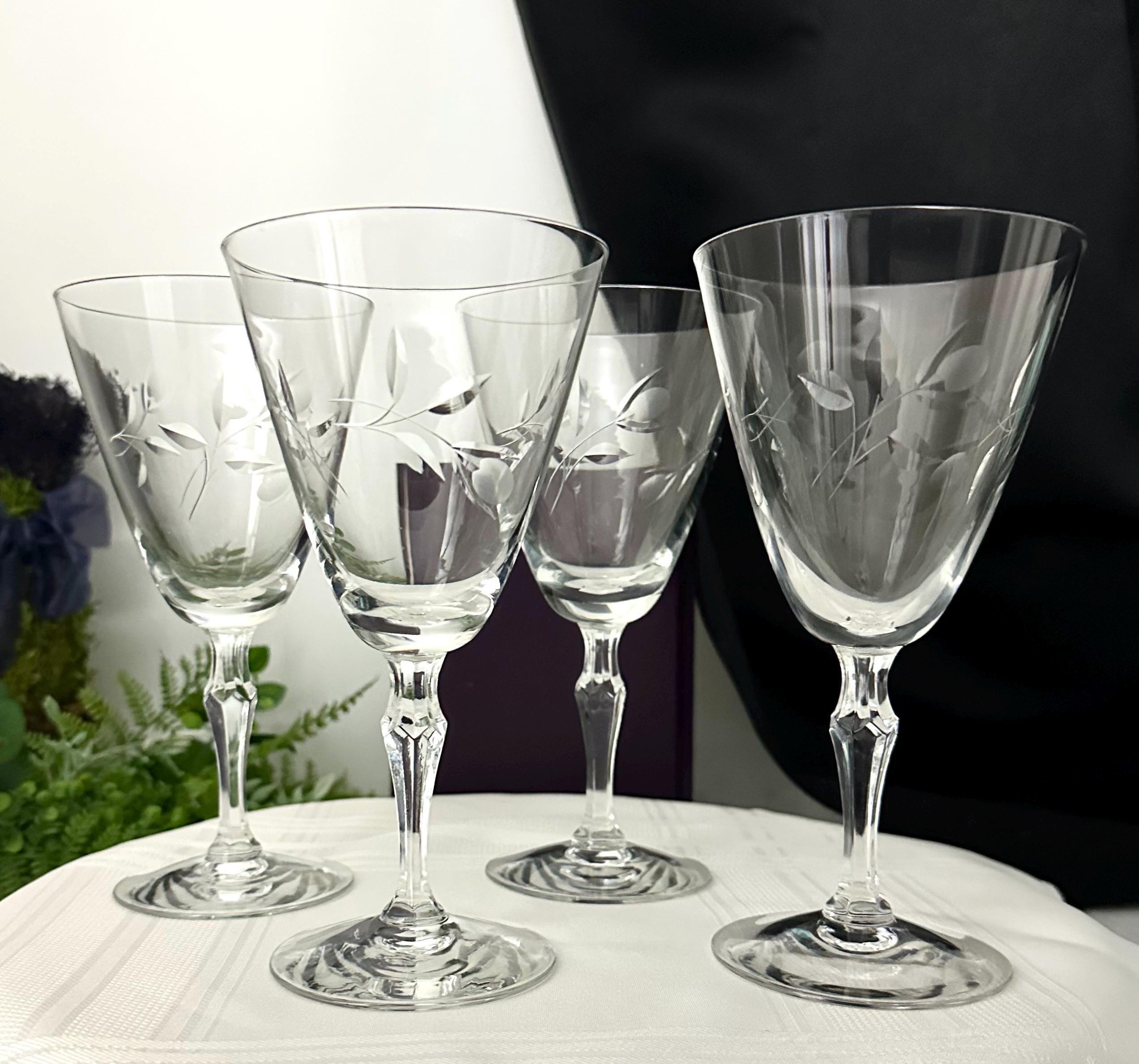 This set of four Fostoria Sweetheart Rose Water Glasses from the 1960s features a beautiful etched rose design on clear glass goblets. The round-shaped glasses stand at 7 inches tall with a diameter of 3 5/8 inches, making them perfect for serving cold beverages during various occasions.